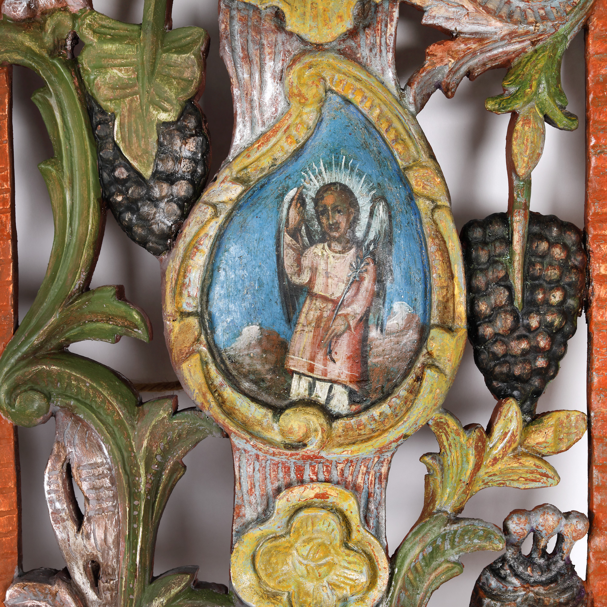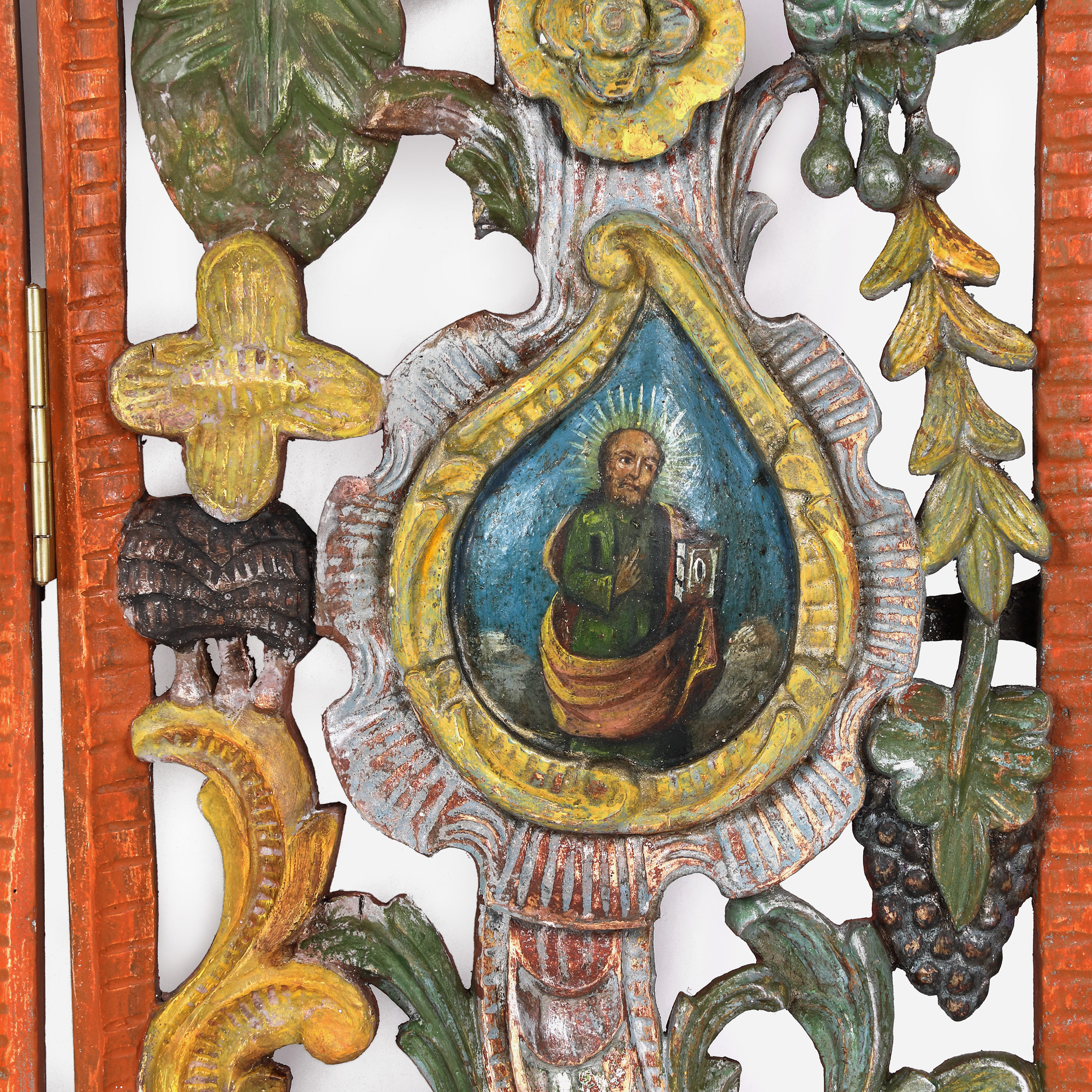 tempera și foiță de argint pe lemn sculptat