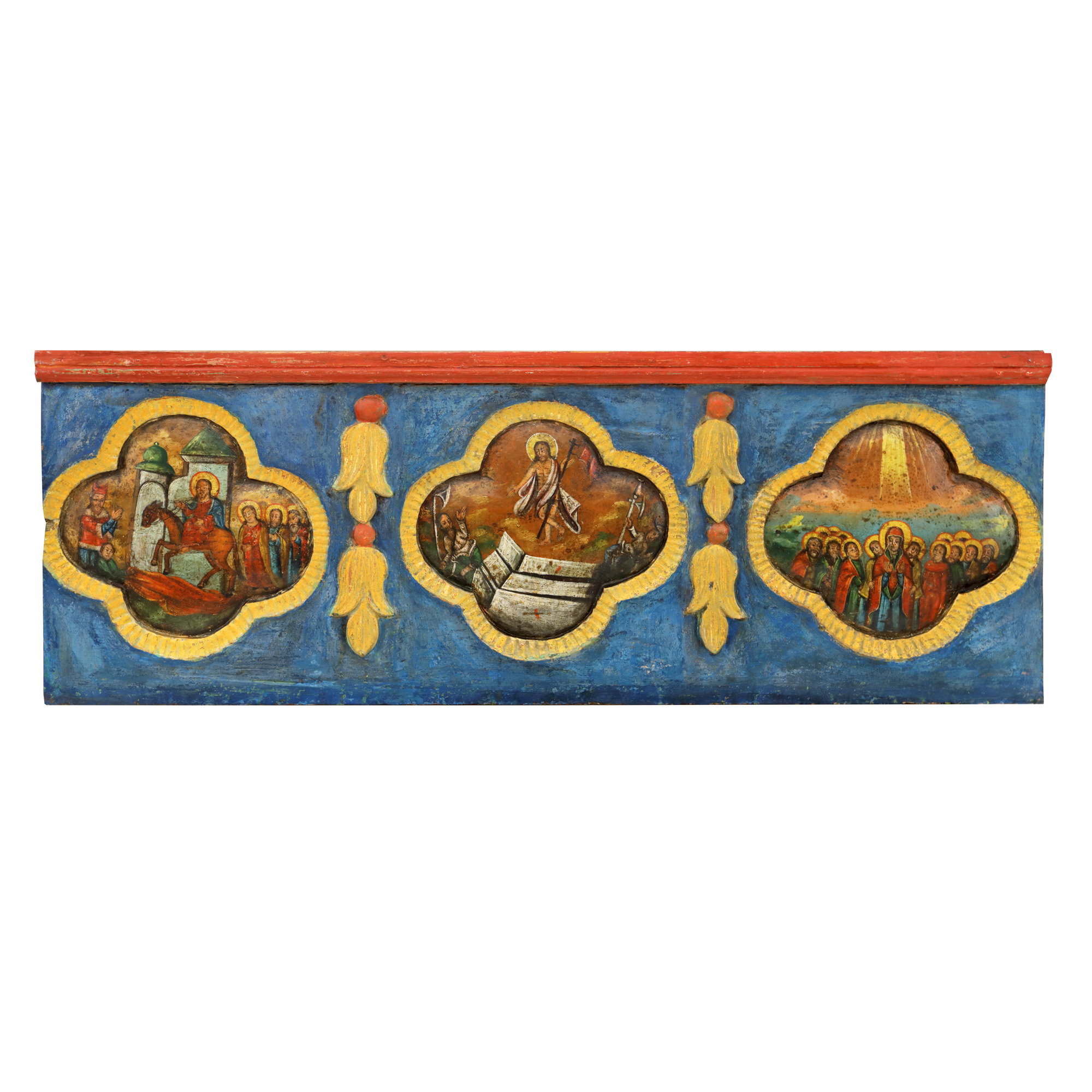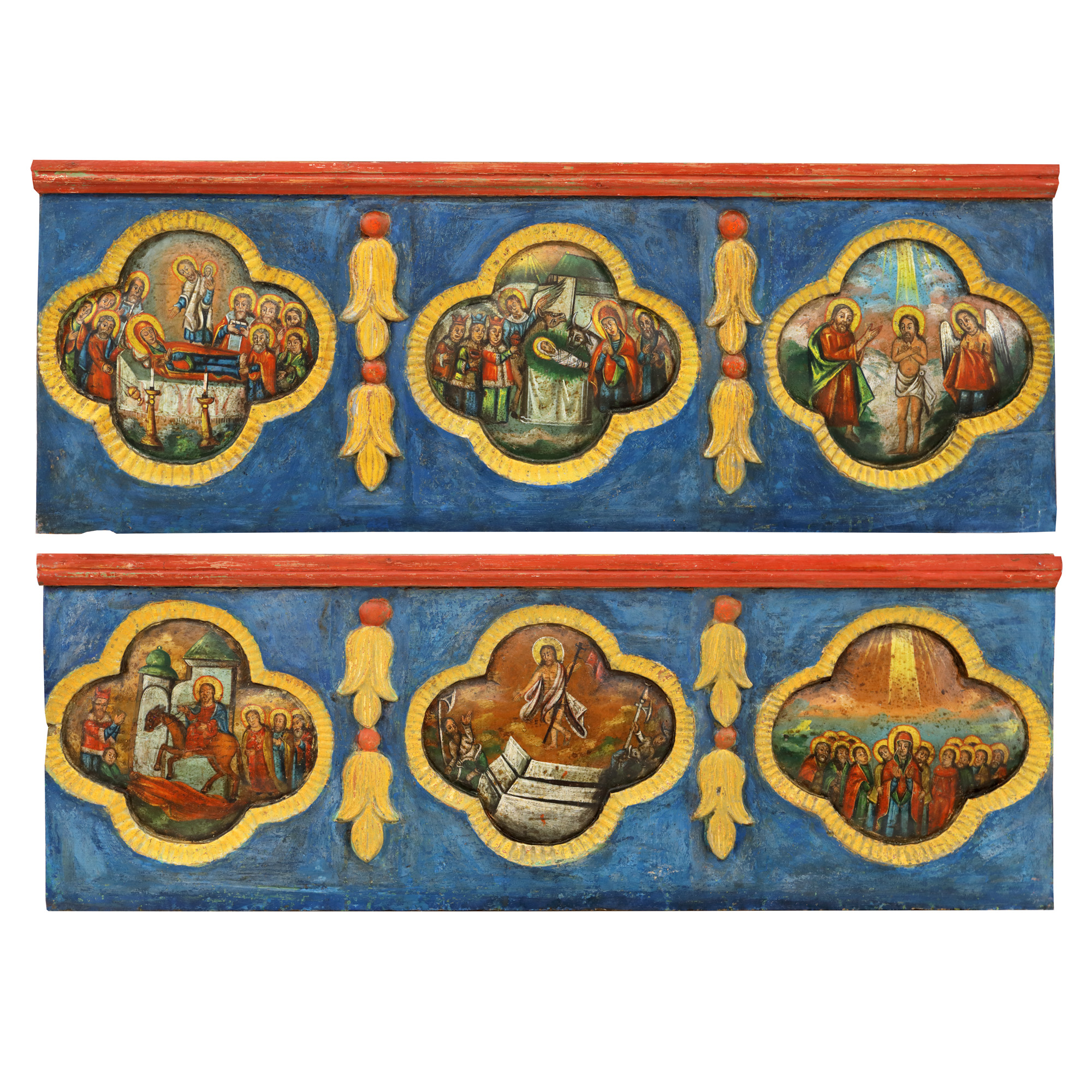65. Fragmente de iconostas, cu scenele "Duminica Floriilor, Invierea Domnului, Pogorârea Duhului Sfânt, Adormirea Maicii Domnului, Nașterea Domnului și Botezul Domnului”, școală moldovenească, prima jumătate a sec. XIX