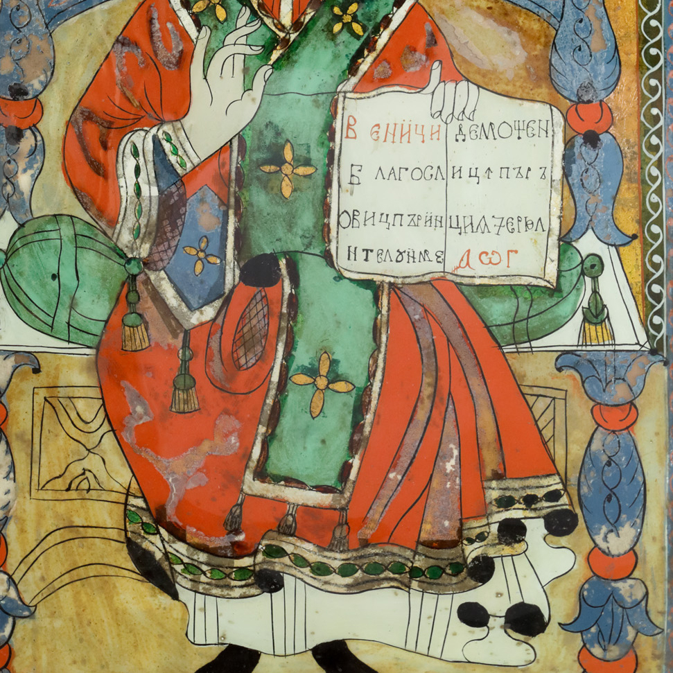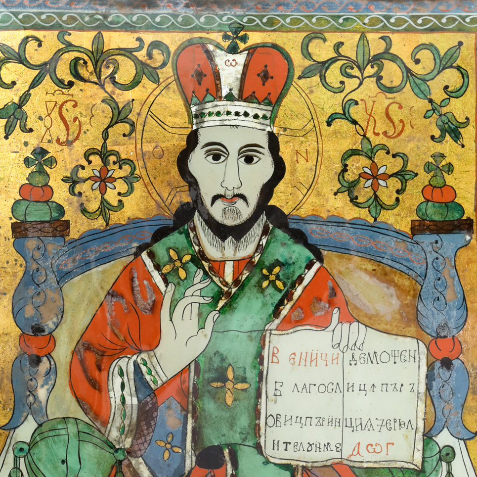 19. Icoană pe glajă, ”Iisus Hristos Împărat și Mare Arhiereu, tronând”, primul atelier de la Nicula, 1803, piesă muzeală, de colecție