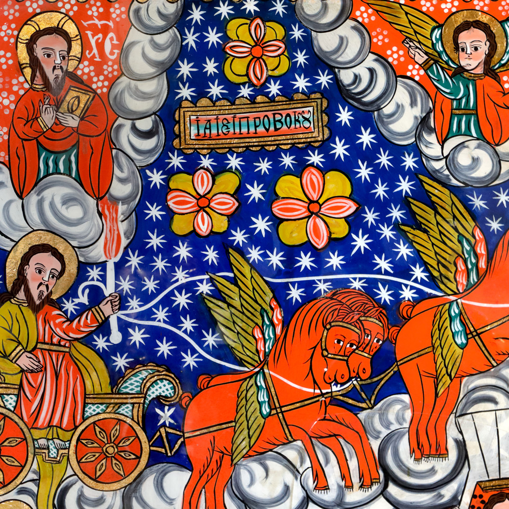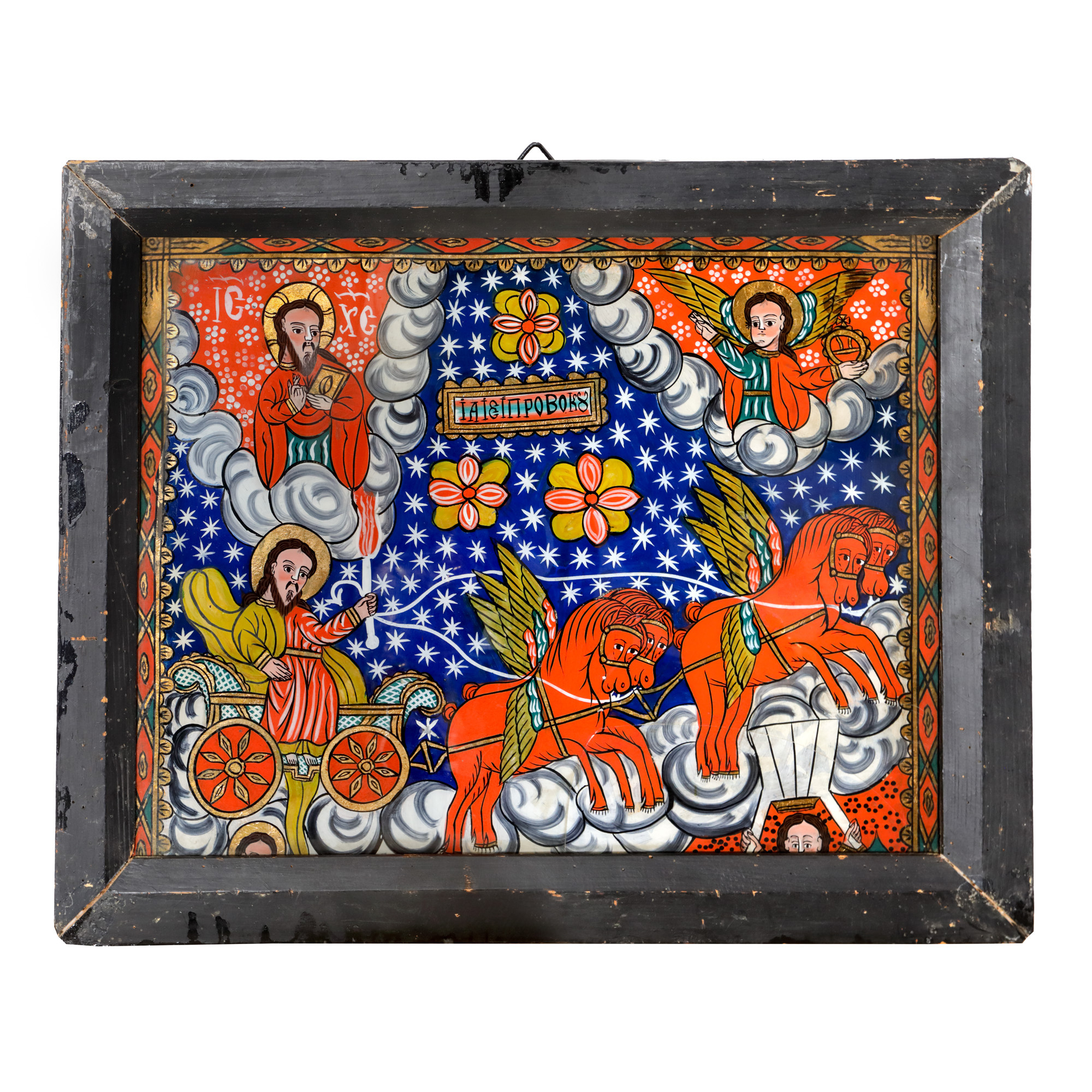 35. Icoană pe glajă, ”Înălțarea la cer a Sfântului Prooroc Ilie și scene din viața lui”, atelier din Făgăraș, a doua jumătatea sec. XIX