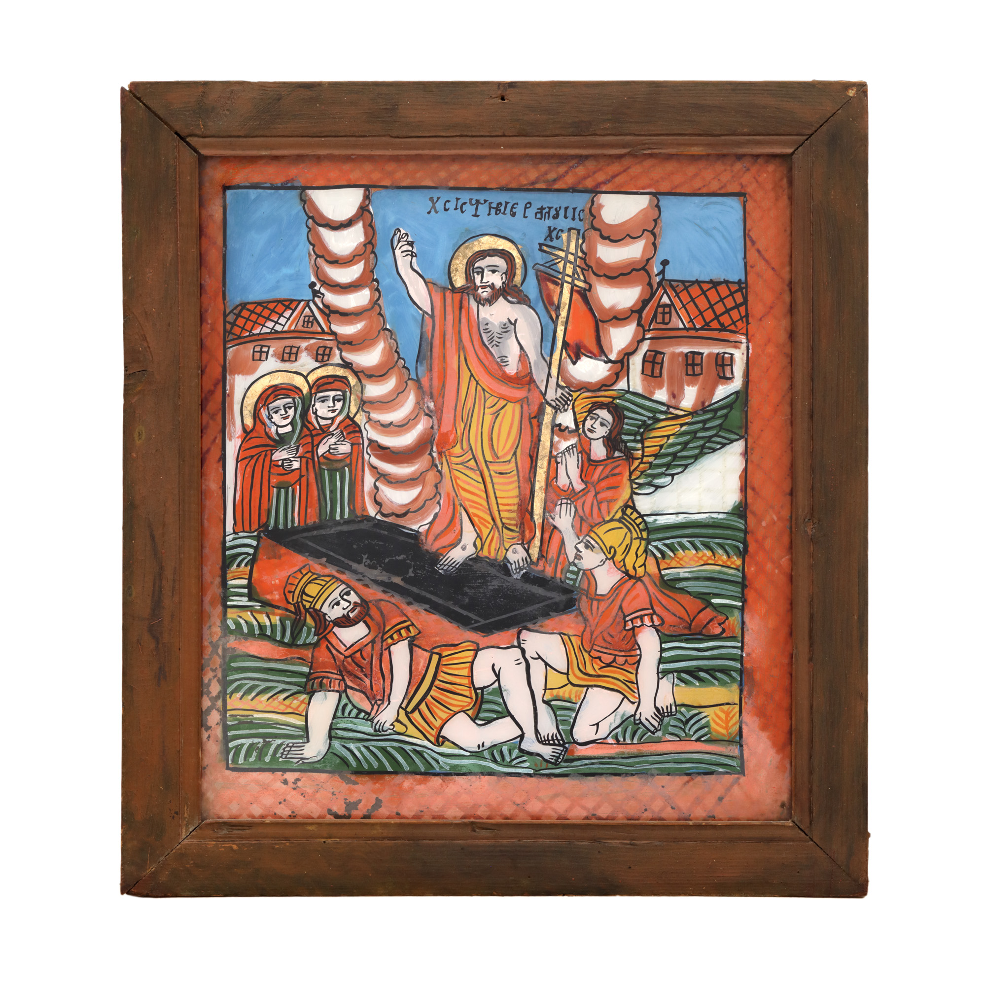 36. Icoană pe glajă, ”Învierea Domnului”, atelier din Șcheii Brașovului, a doua jumătate a sec. XIX, de colecție