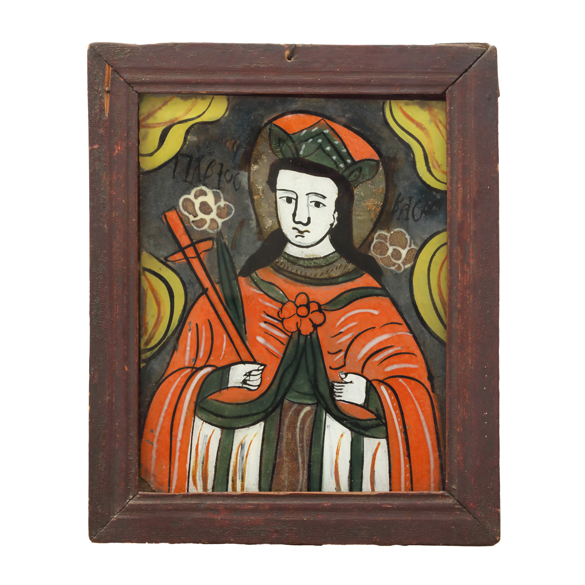 42. Icoană pe glajă, ”Sfânta Cuvioasă Paraschiva” (Sfânta Vineri, Ocrotitoarea Moldovei), atelier din Nicula, jumătatea sec. XIX