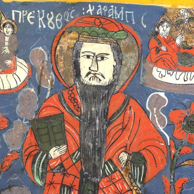 12. Icoană pe glajă, ”Sfântul Haralambie legând ciuma”, atelier din Nicula, a doua jumătate a sec. XIX, provine din colecția vicecampionului mondial de bridge Coriolan Neamțu, piesă foarte rară