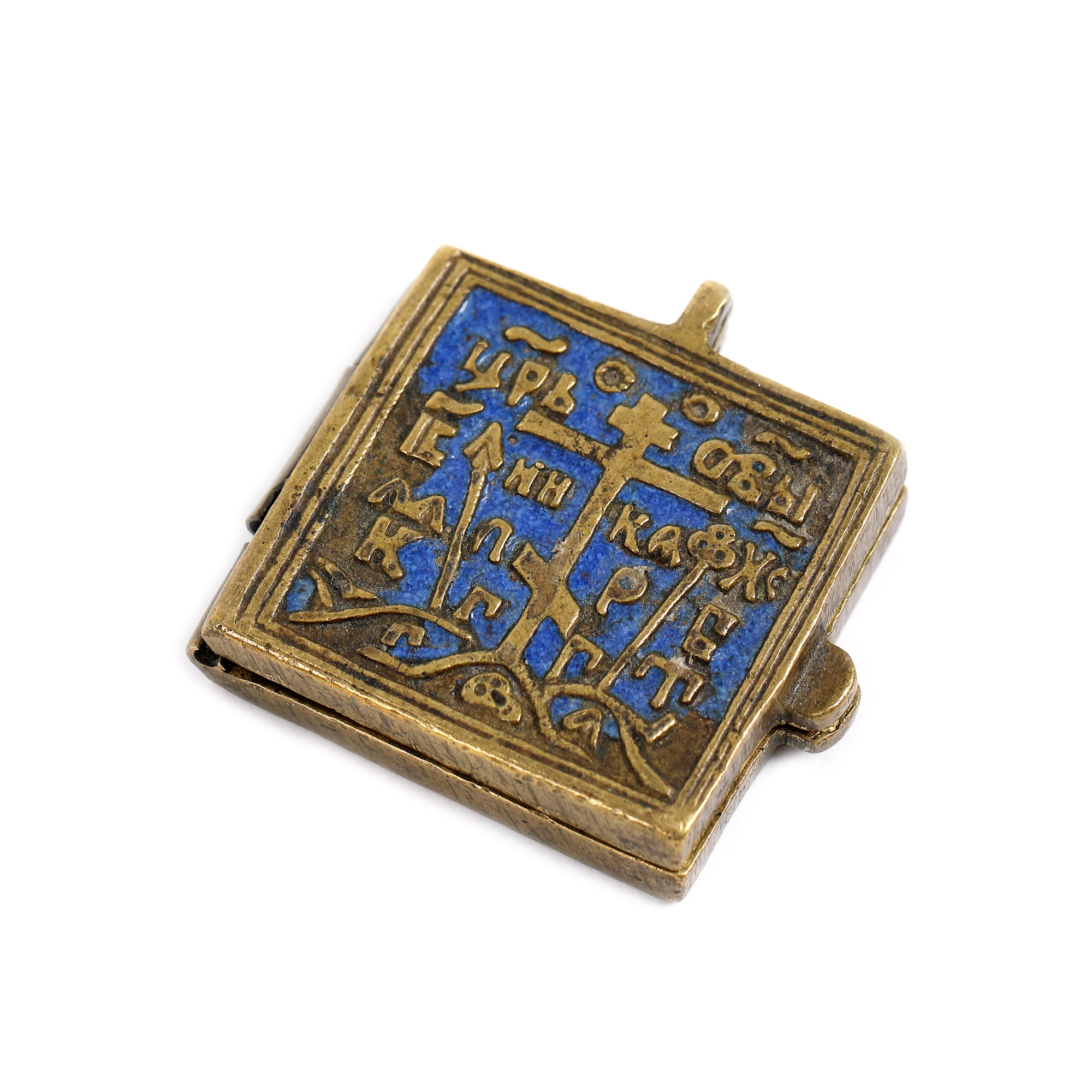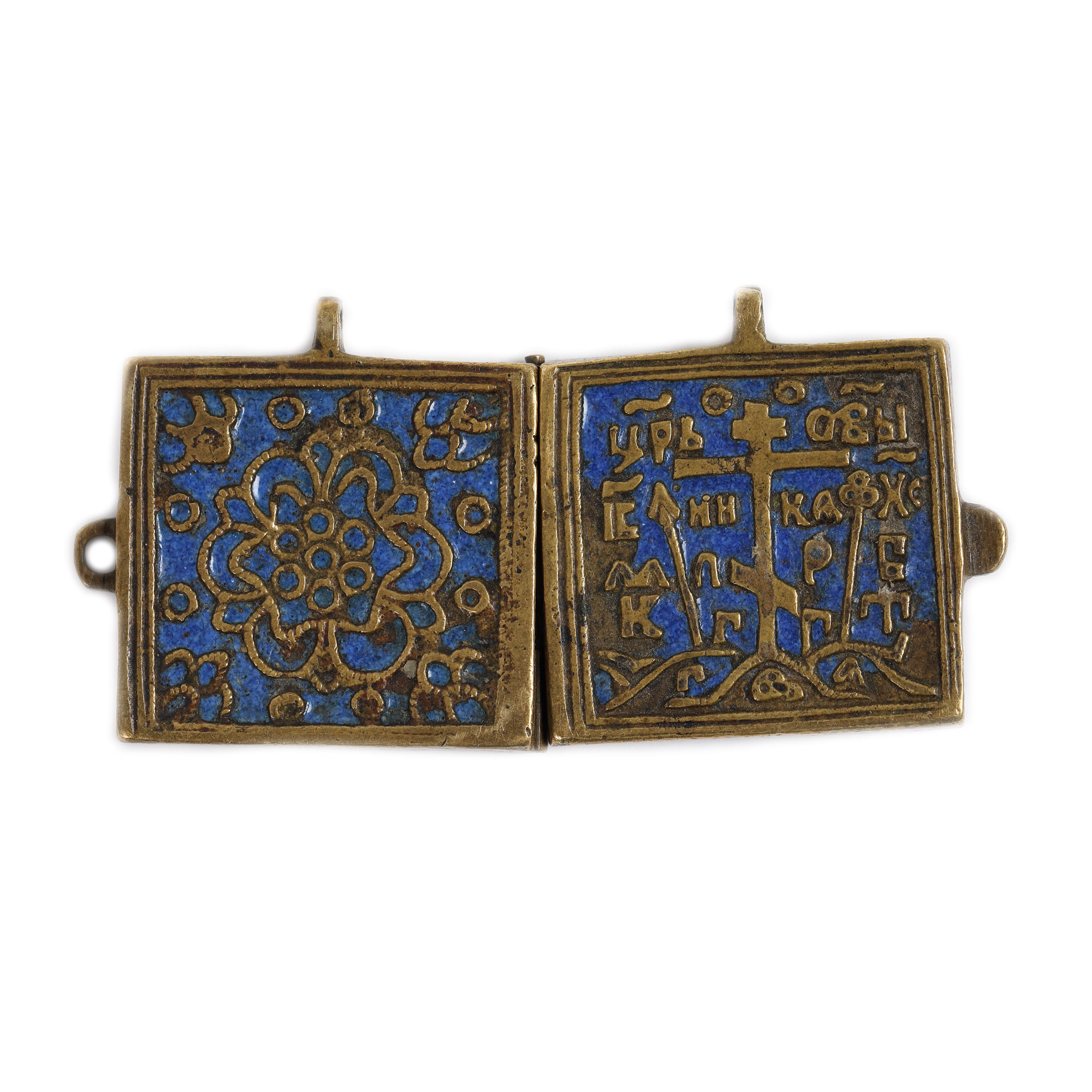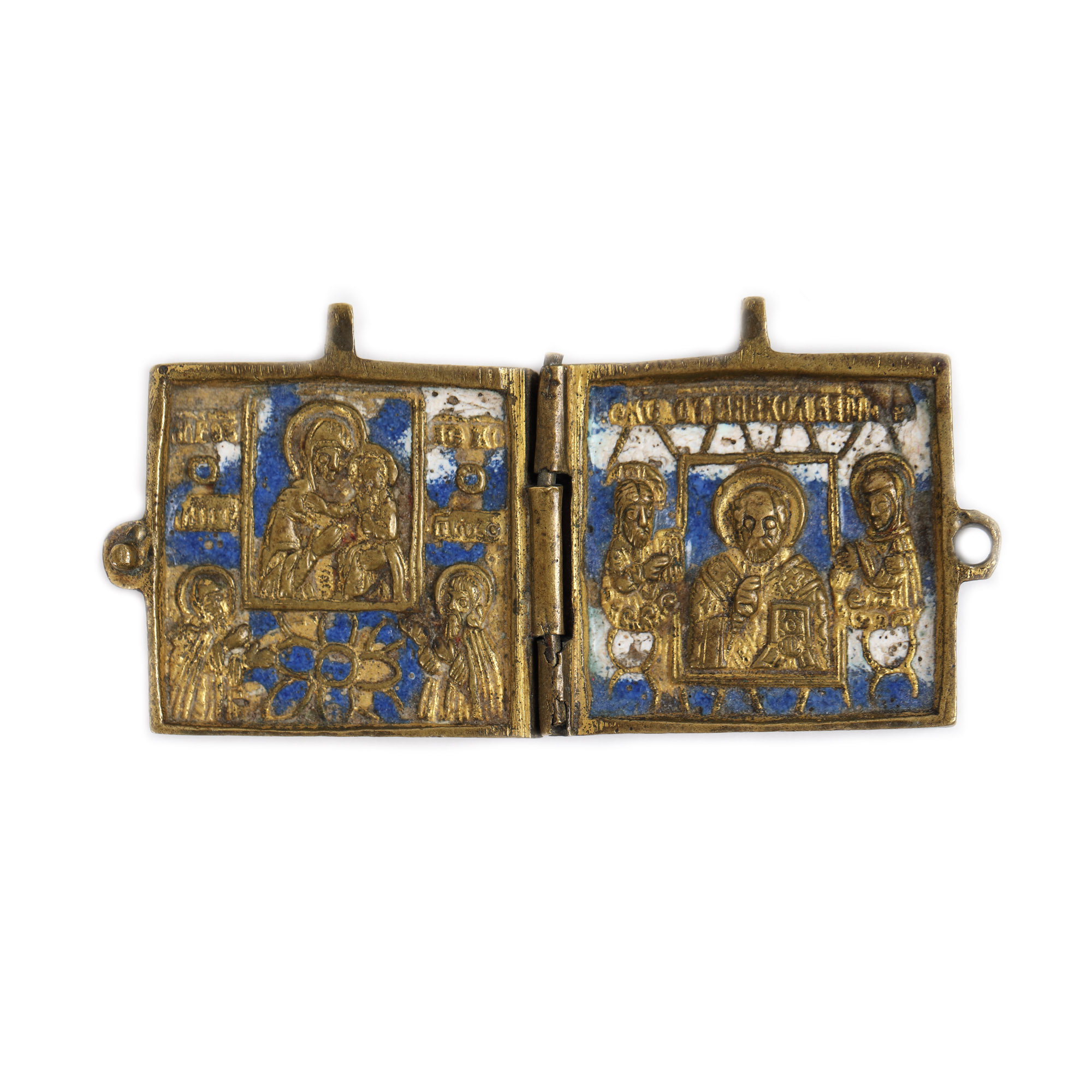 96. Altar miniatural de călătorie, din bronz pictat cu email, ”Maica Domnului cu Pruncul” și ”Sfântul Nicolae”, școală rusească, sec. XIX