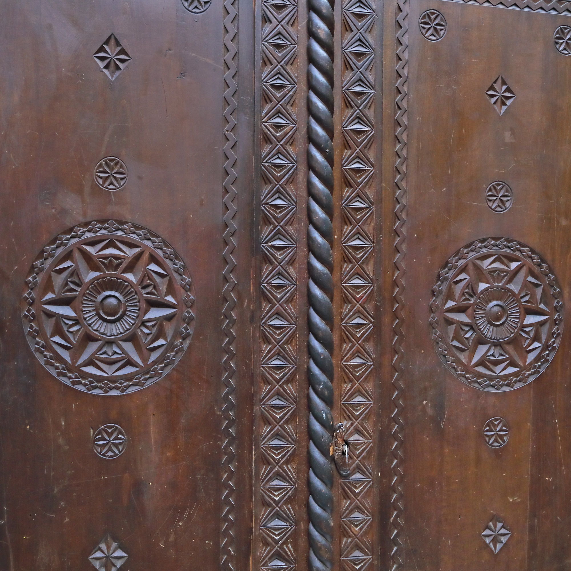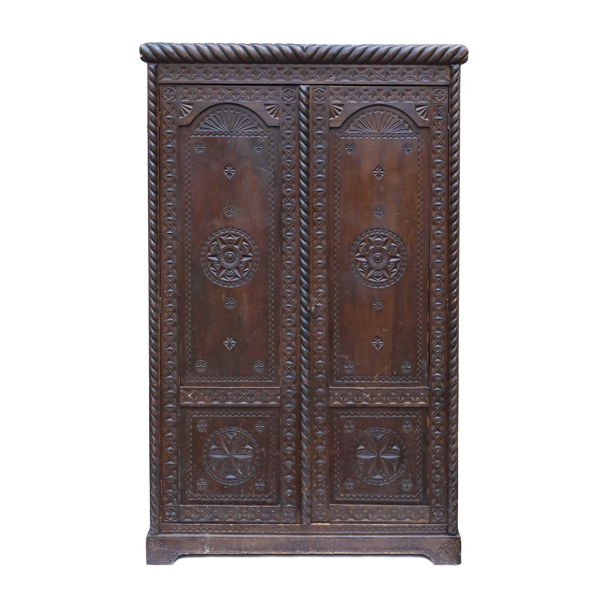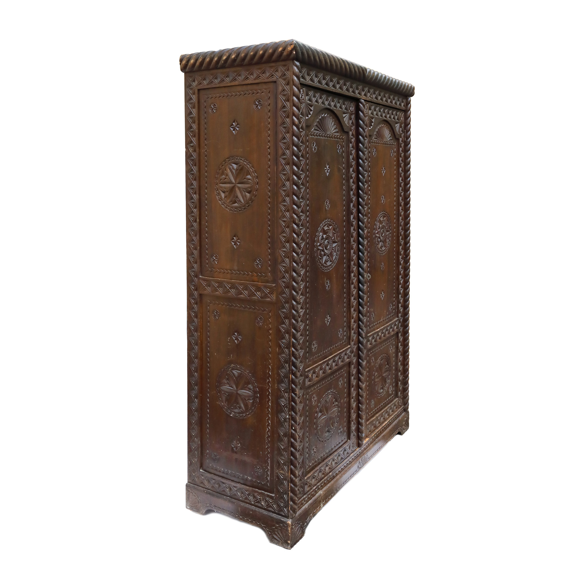 156. Armoar sculptat în stil Neo-Brâncovenesc, decorat cu motive solare, prima jumătate a sec. XX