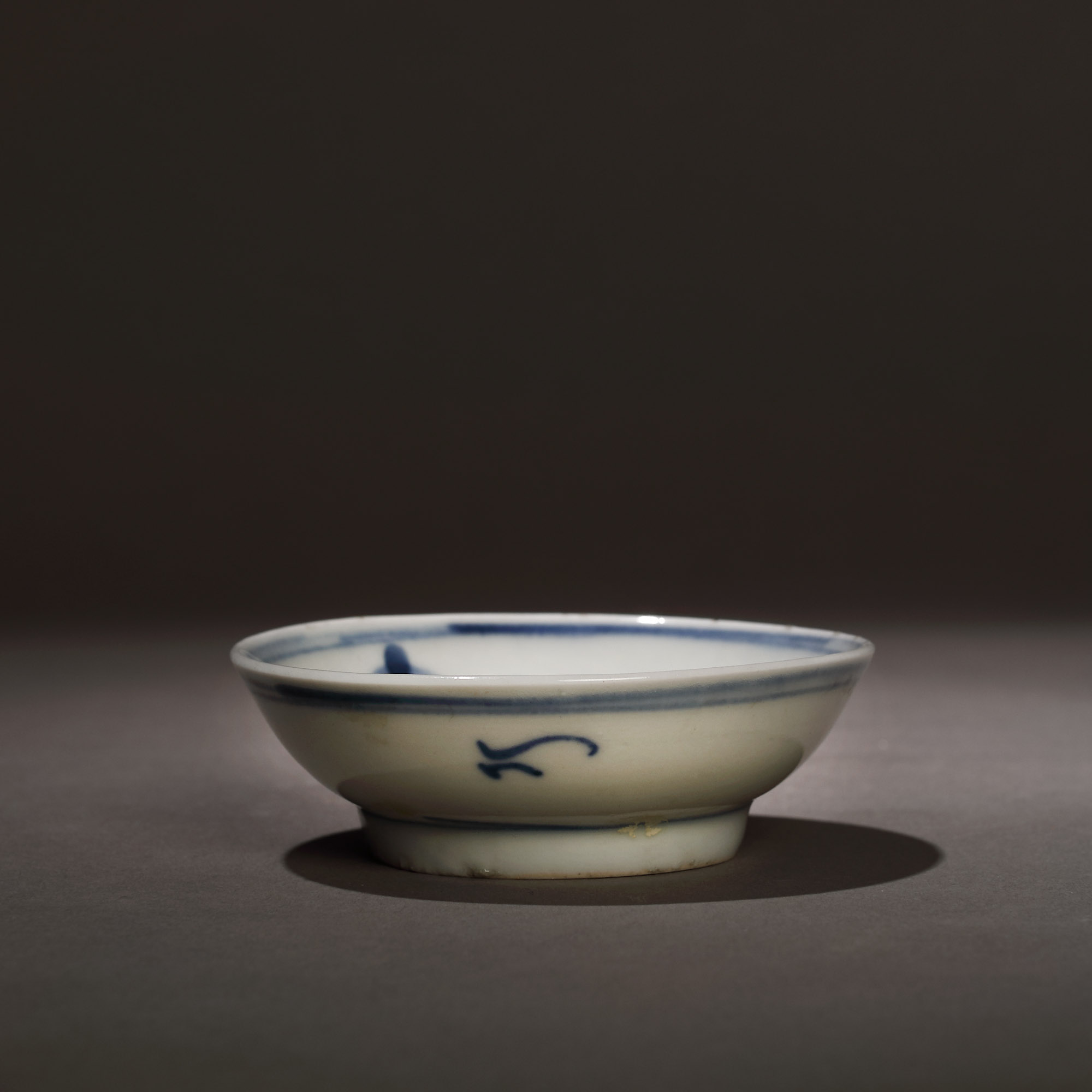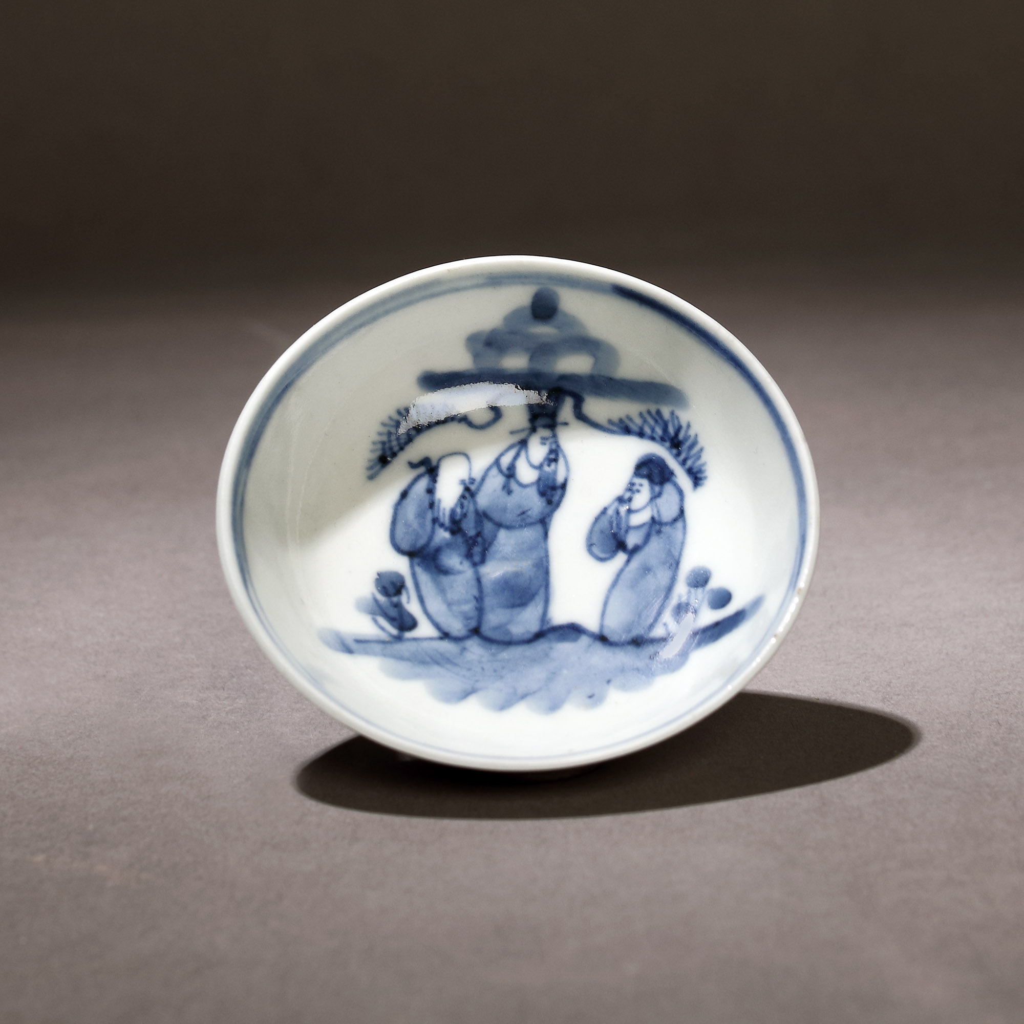 127. Bol miniatural din porțelan, ilustrând o scenă cu trei cărturari, purtând marca ”Yu”, atribuită împăratului Kangxi, perioada dinastiei Qing, China, sec. XVII, provine din colecția Dr. Roth-Nicolau