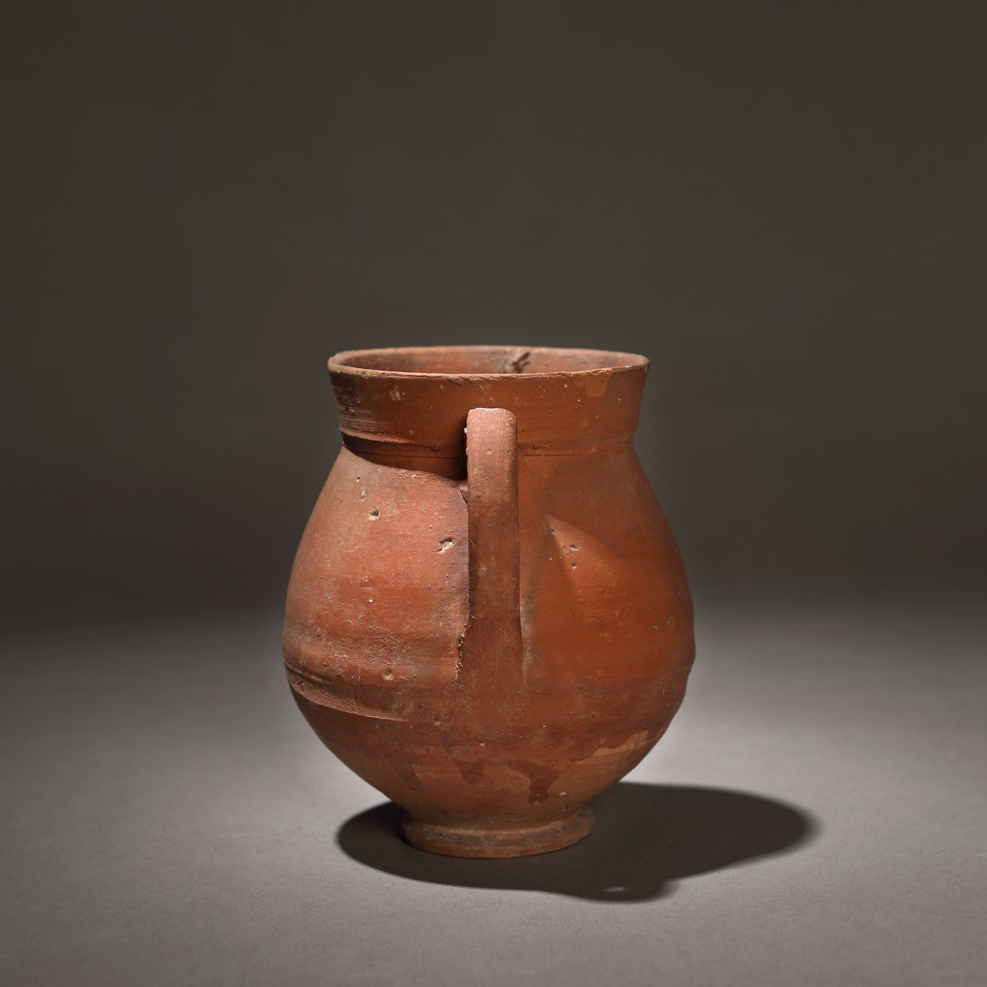 Vasul prezintă firnis cărămiziu închis. Buza este evazată, corpul ovoidal și piciorul mic, inelar.