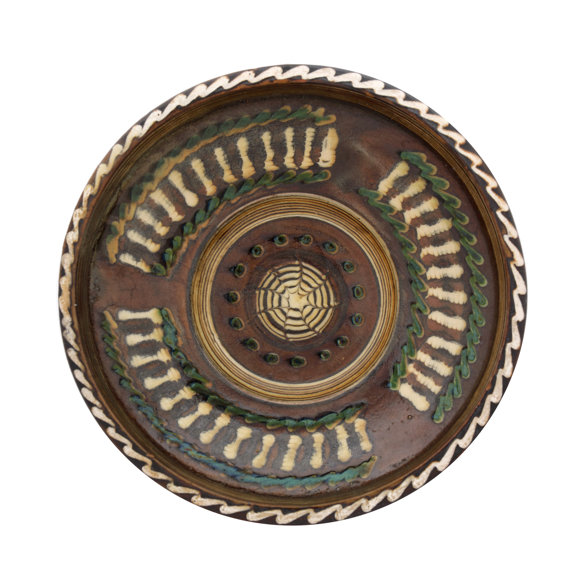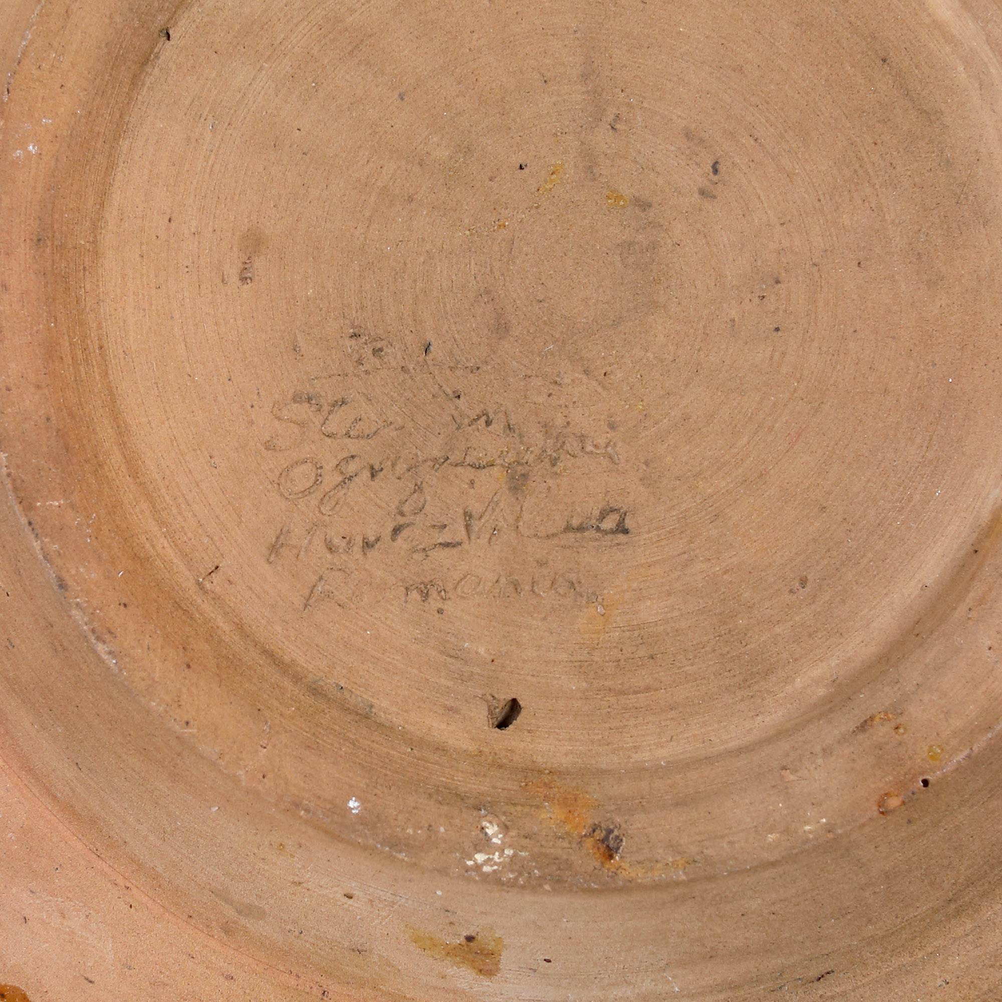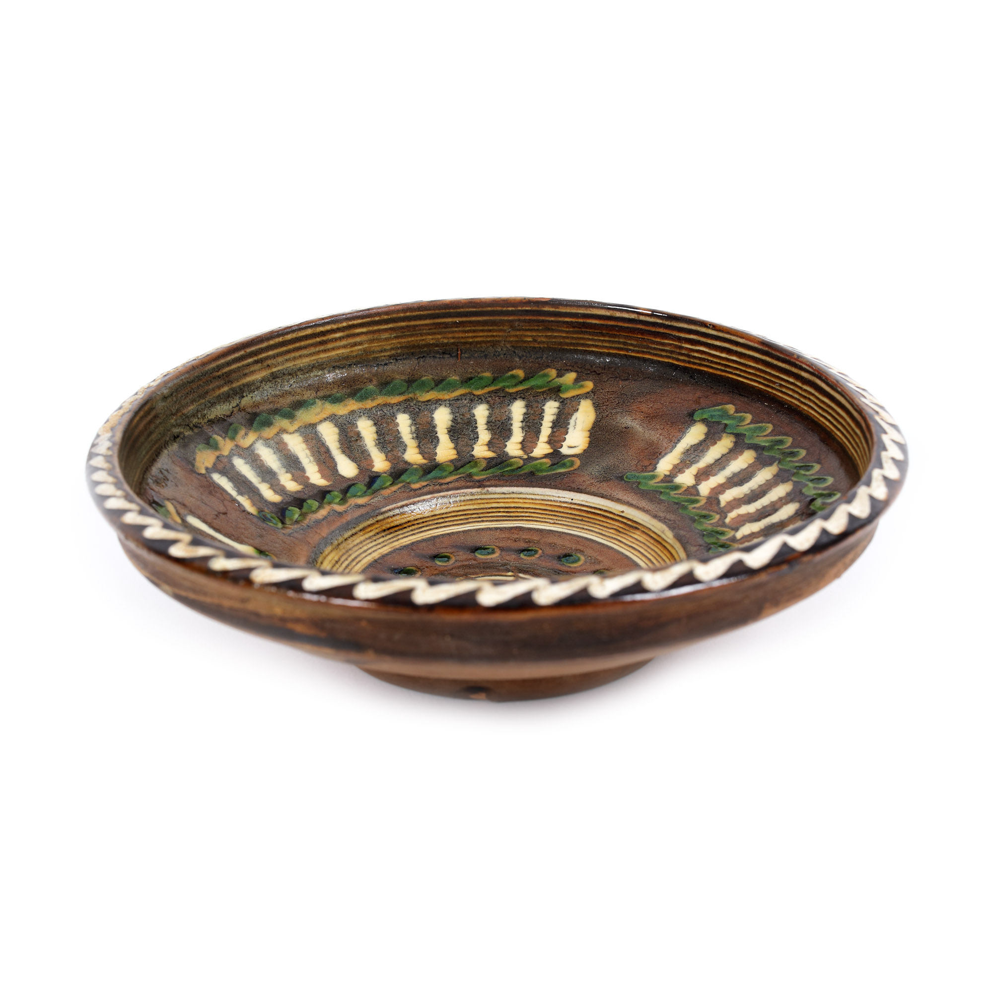 Modelată manual la roată, decorată cu cornul și gaița, smălțuită, ardere dublă. Tipologia formei: tronconică cu buză dreaptă. Decorul dispus la interior, pe toată suprafața vasului. Compozitie decorativă și categorii de motive: registre succesive diferențiate ca tehnică de lucru și categorii de motive; motive geometrice: val, spirală, păianjen, ”altiță”. Cromatica: fond brun, motive cu alb și verde. Starea de conservare este foarte bună.