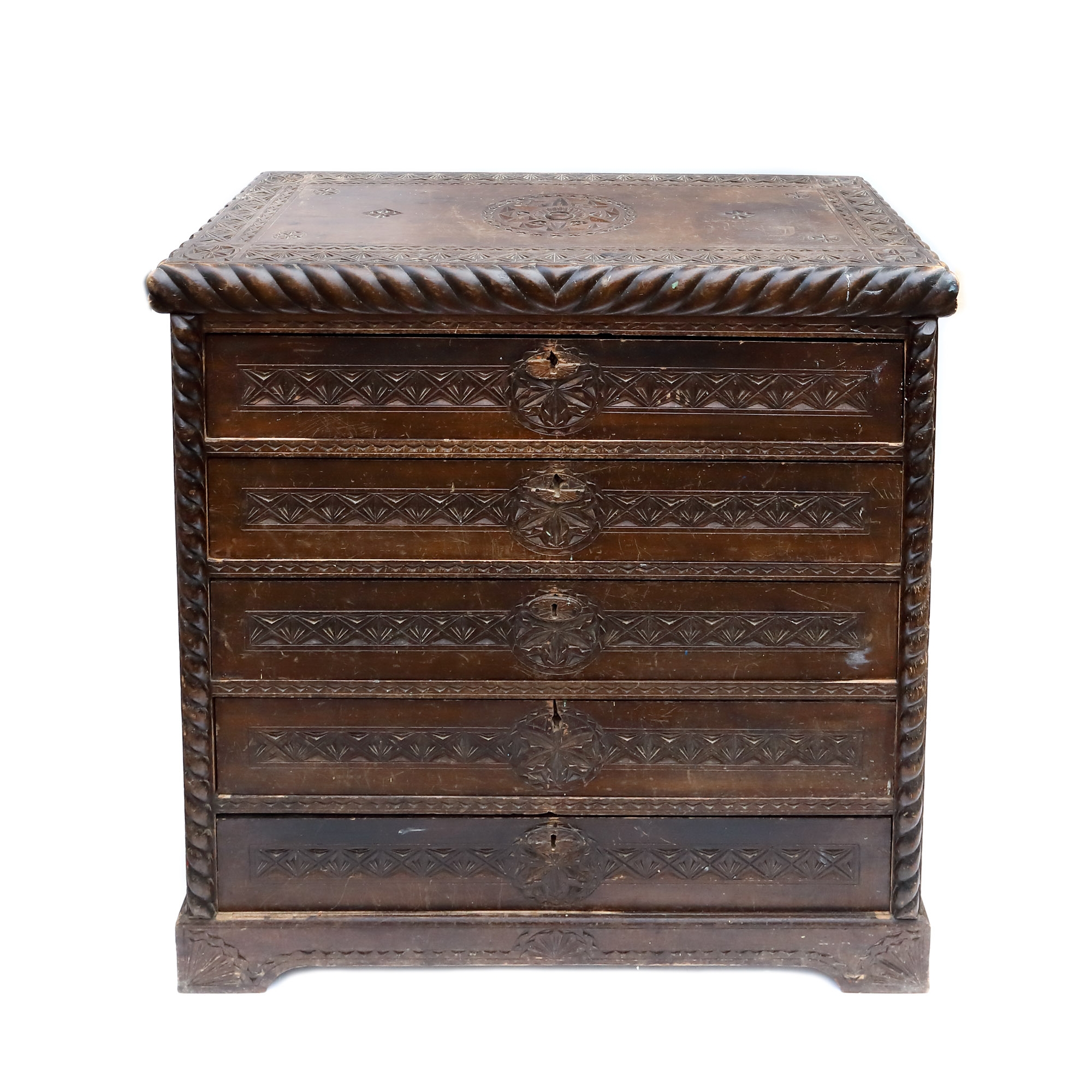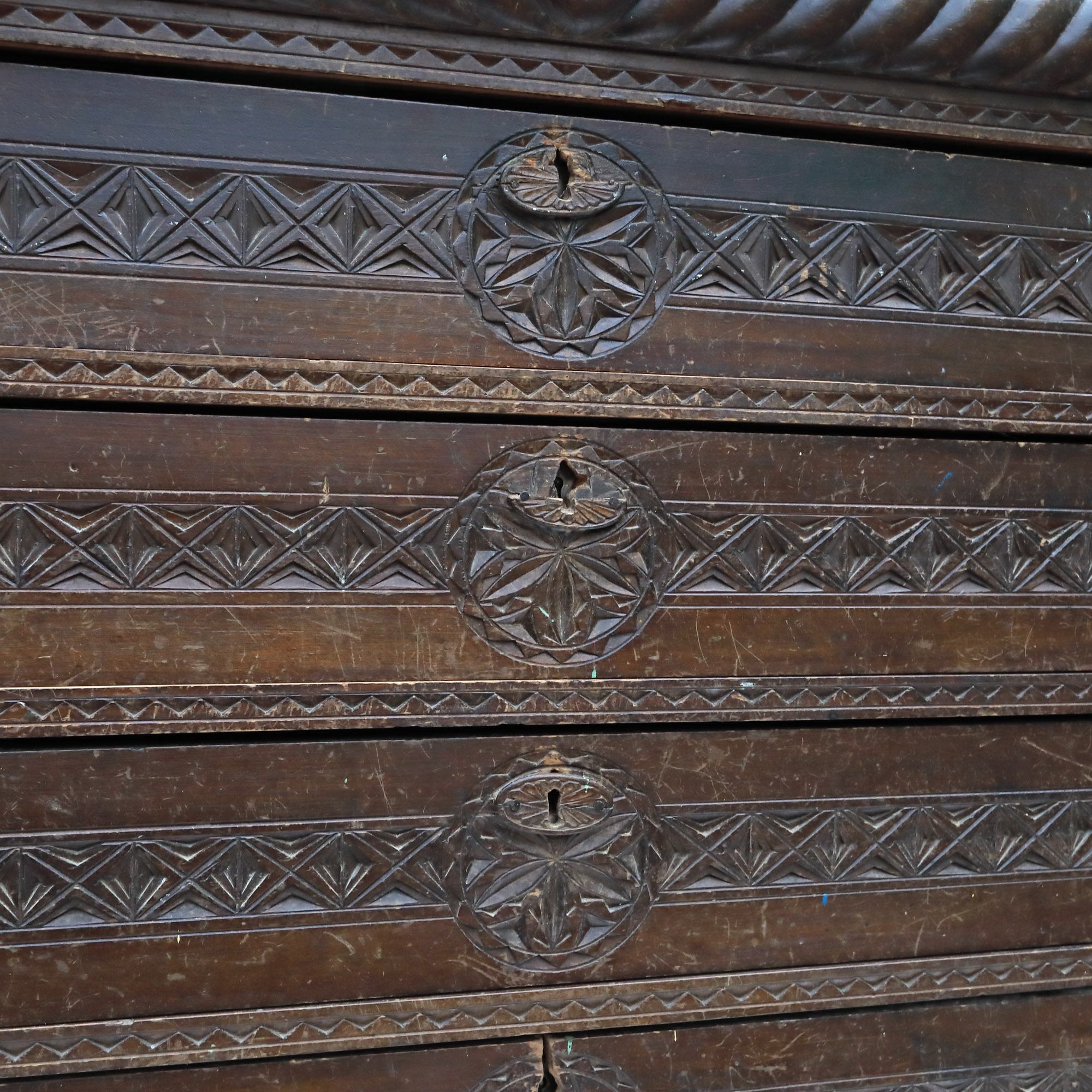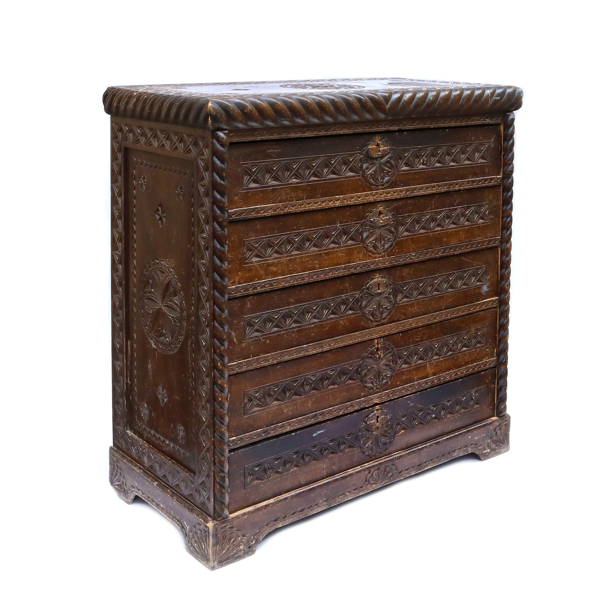 154. Comodă sculptată în stil Neo-Brâncovenesc, decorată cu motive specifice, începutul sec. XX