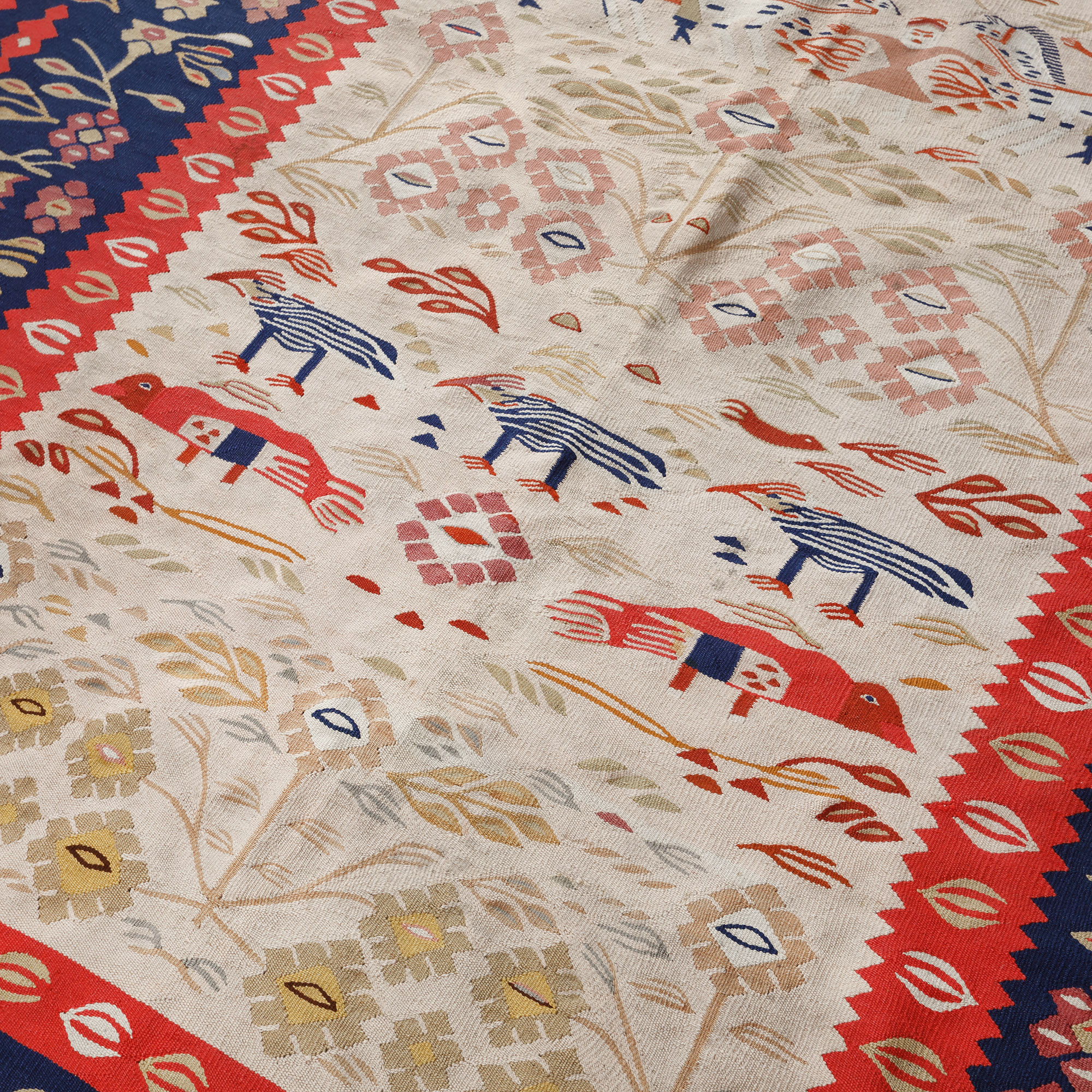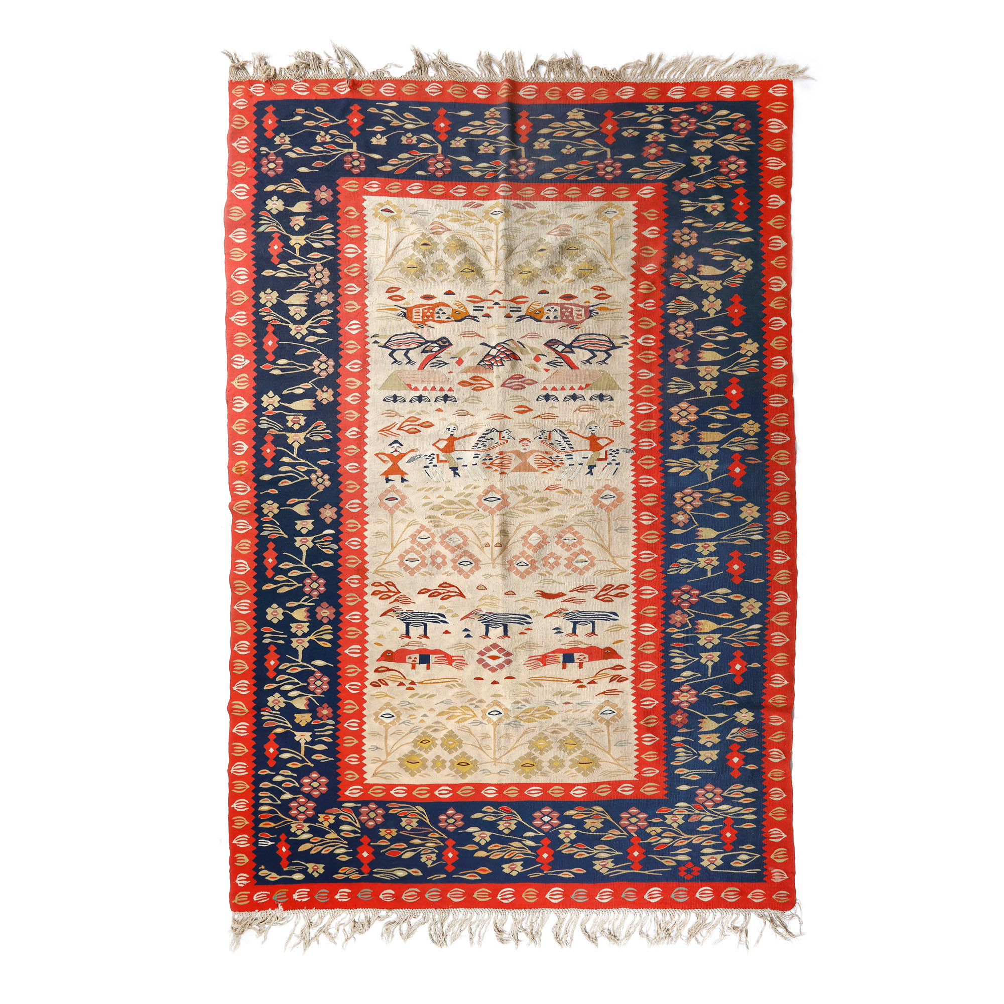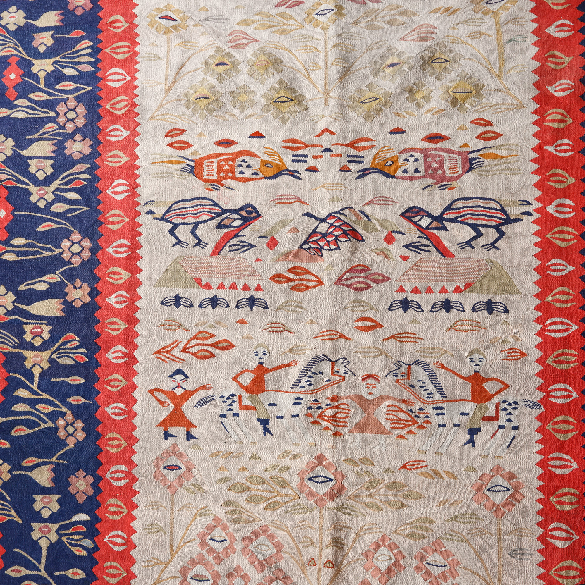 97. Covor oltenesc din lână, decorat cu diverse personaje și motive avimorfe, sfârșitul sec. XIX