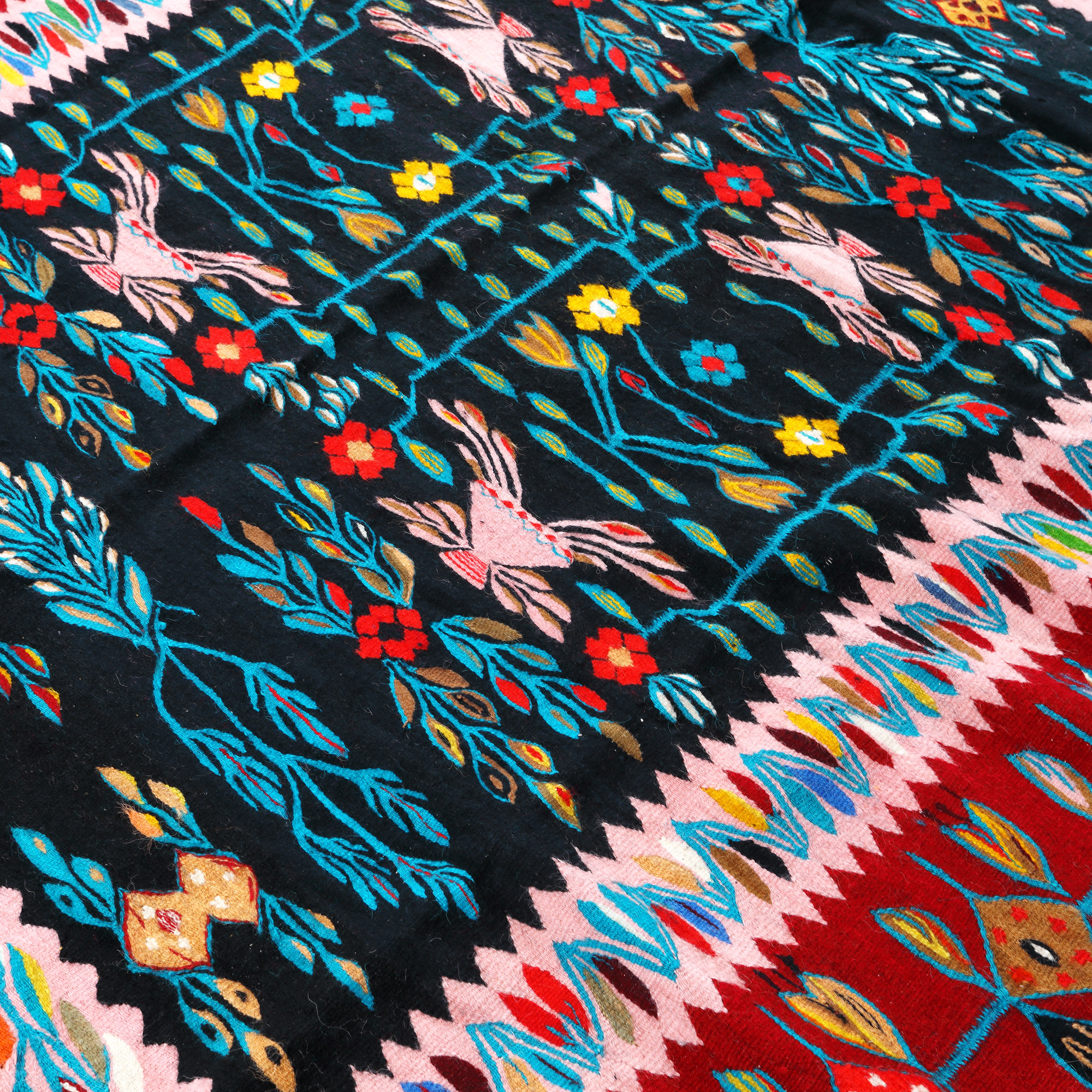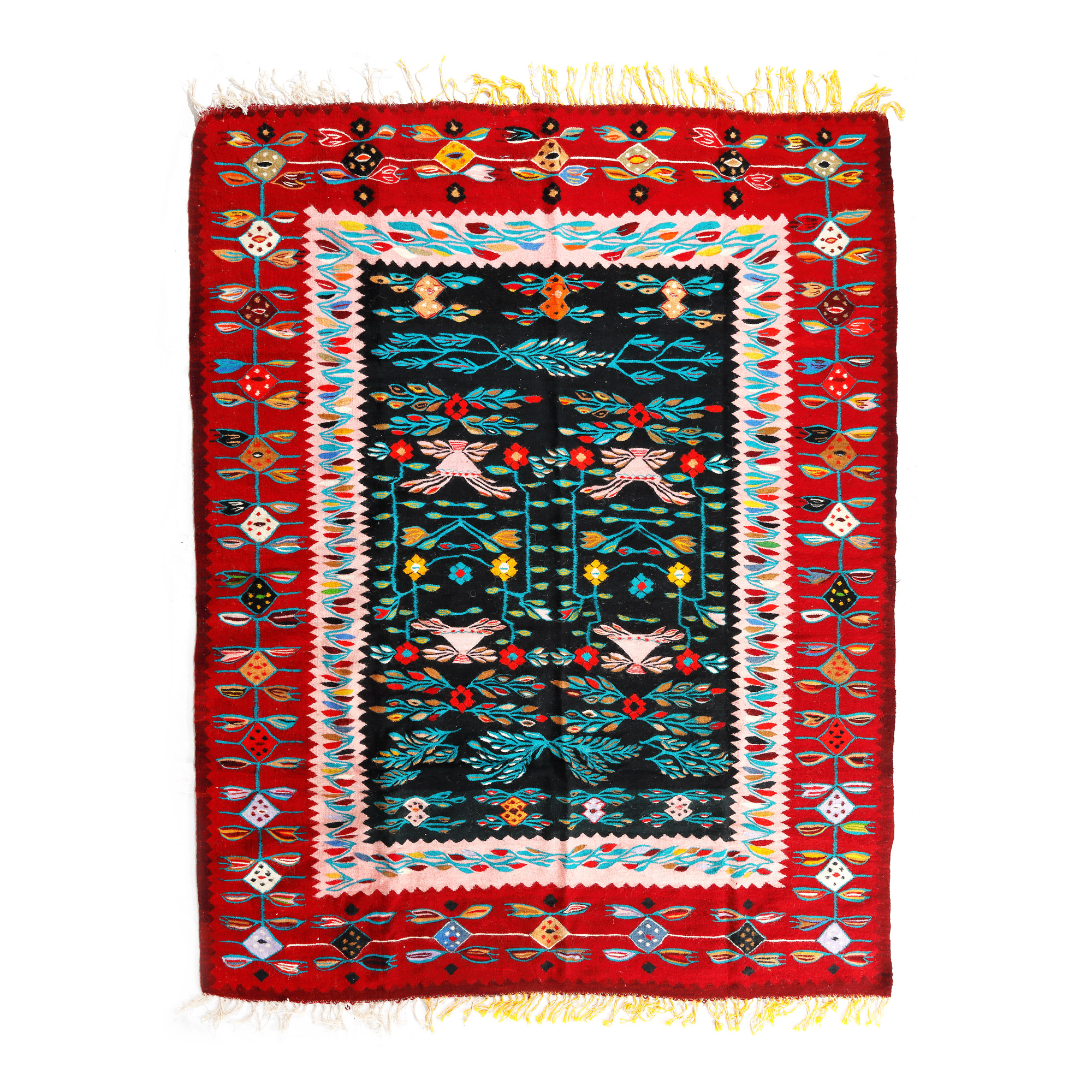 134. Covor oltenesc din lână, decorat cu o reinterpretare a motivului pomului vieții și motive florale (nalbe, lăcrămioare și lalele), începutul sec. XX