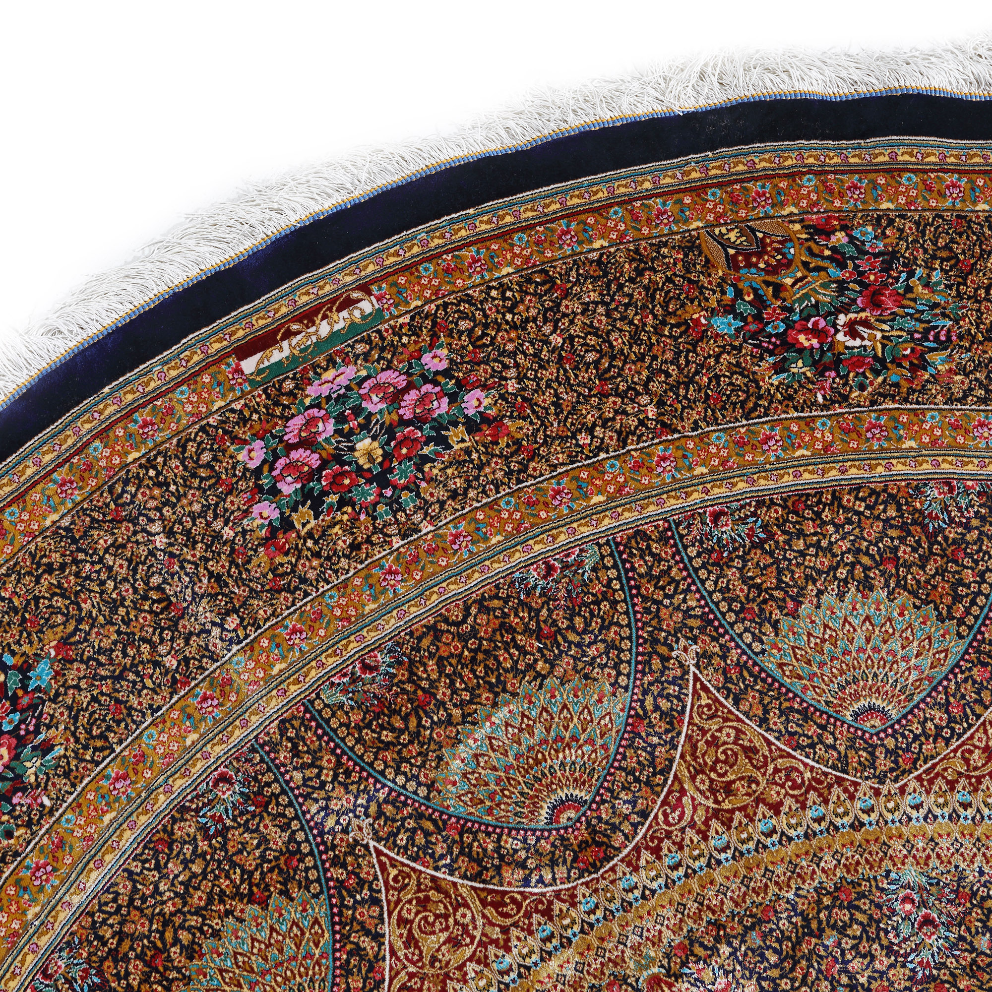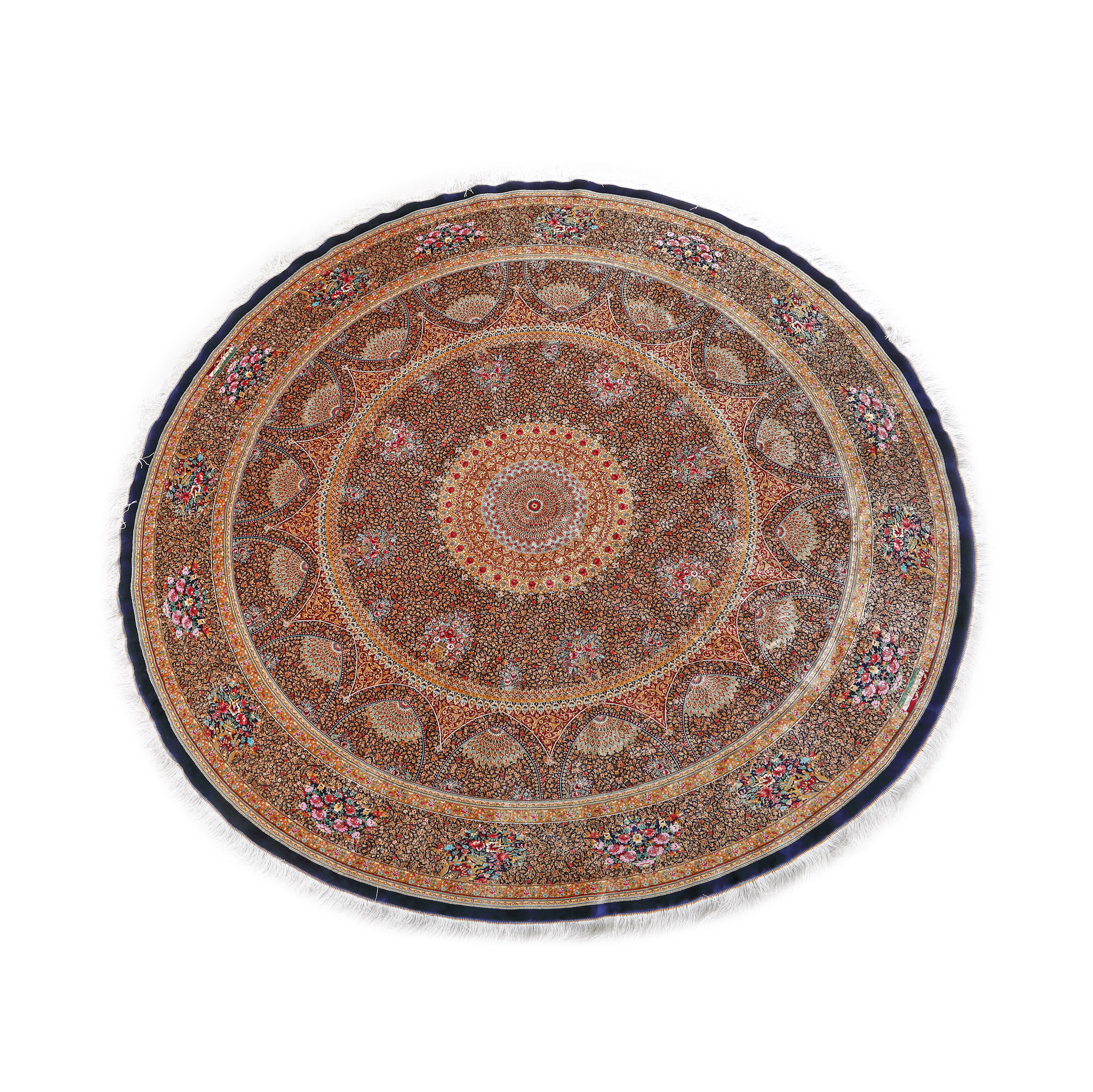 174. Covor Qum din mătase, rotund, decorat cu rozete și motive florale, Iran [a doua jumătate a sec. XX]