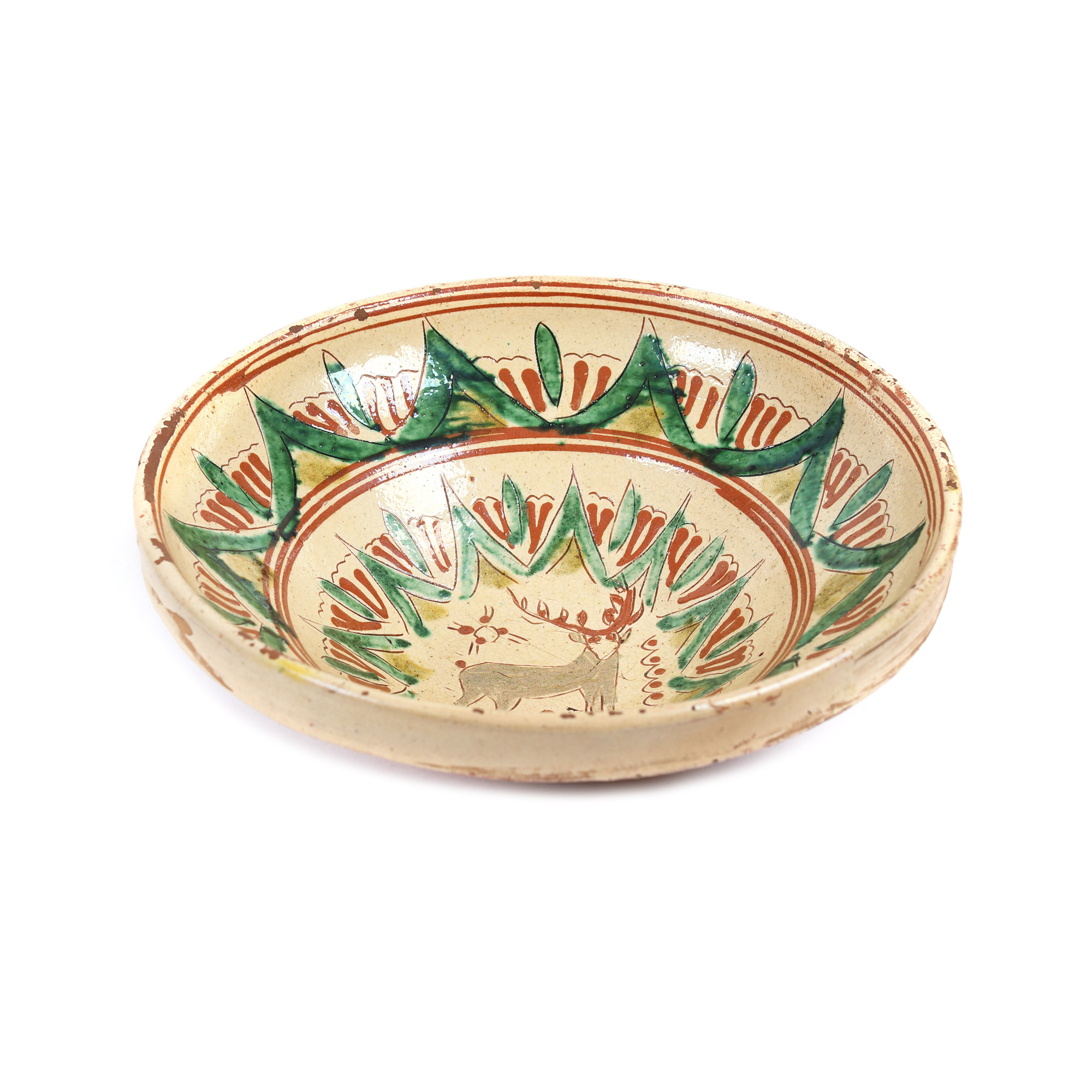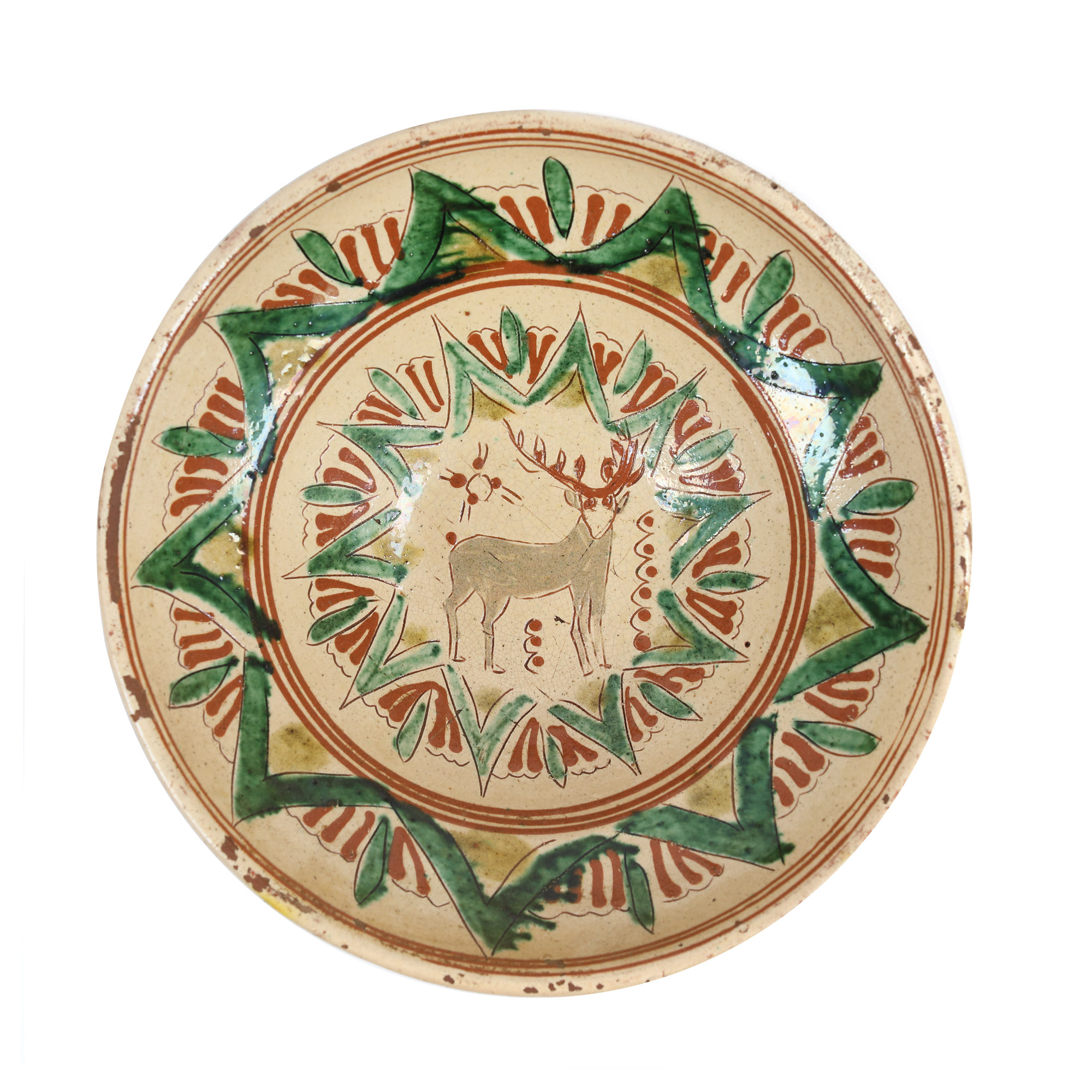 72. Farfurie din ceramică tip Kuty, decorată cu cerb, semnată Constantin Colibaba, prima jumătate a sec. XX
