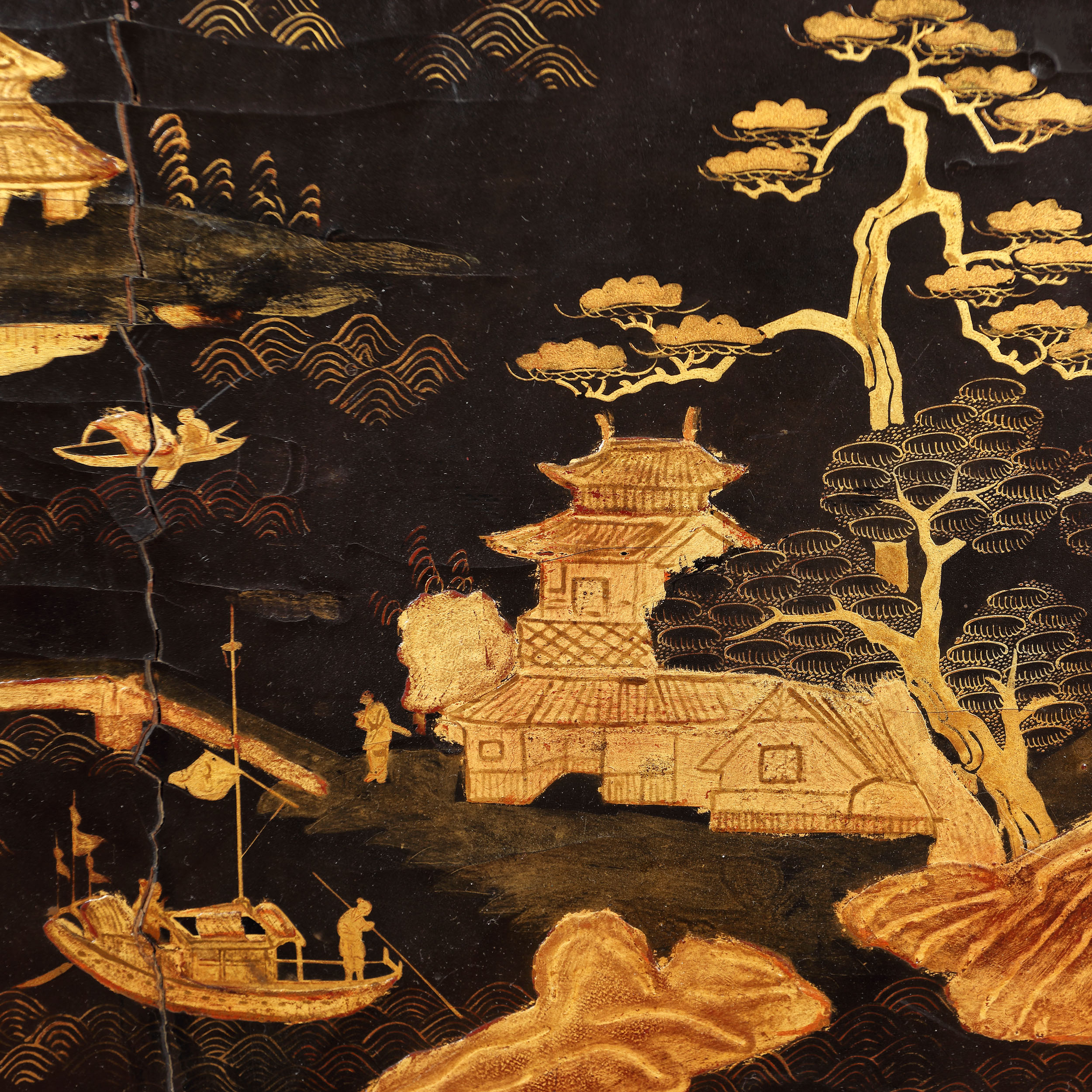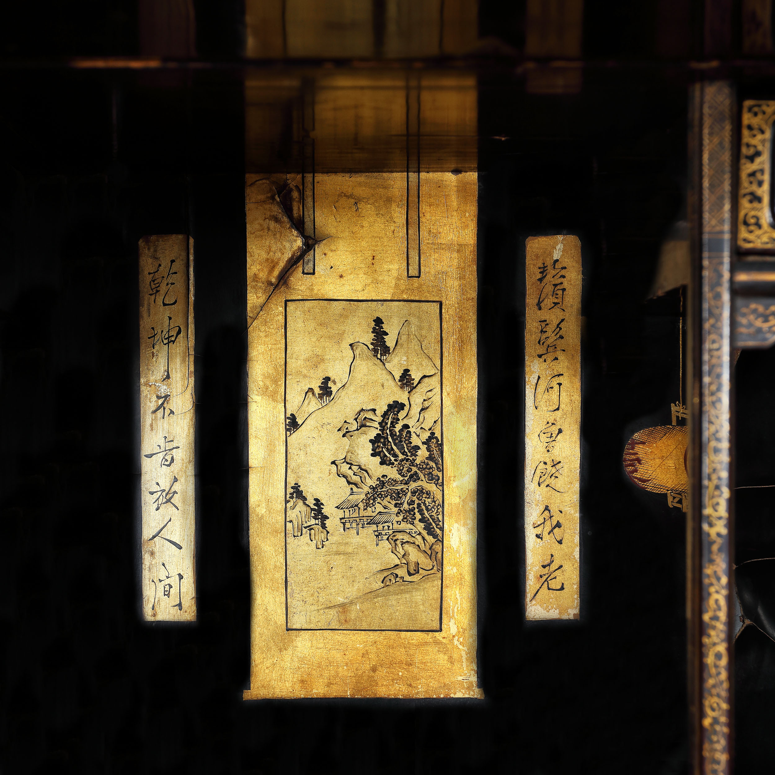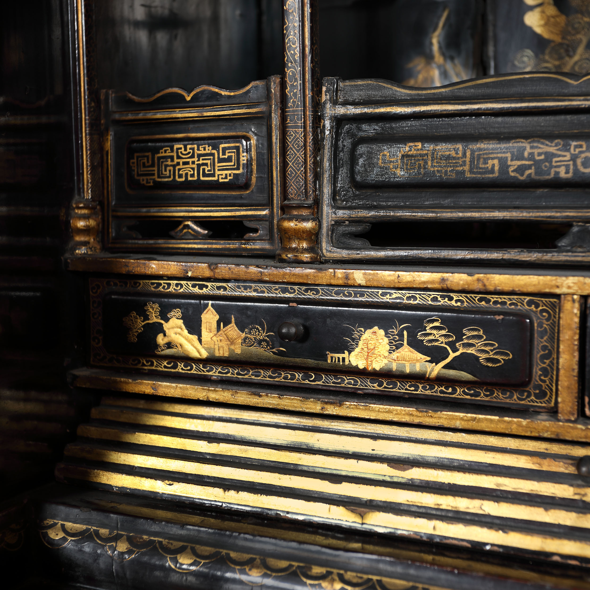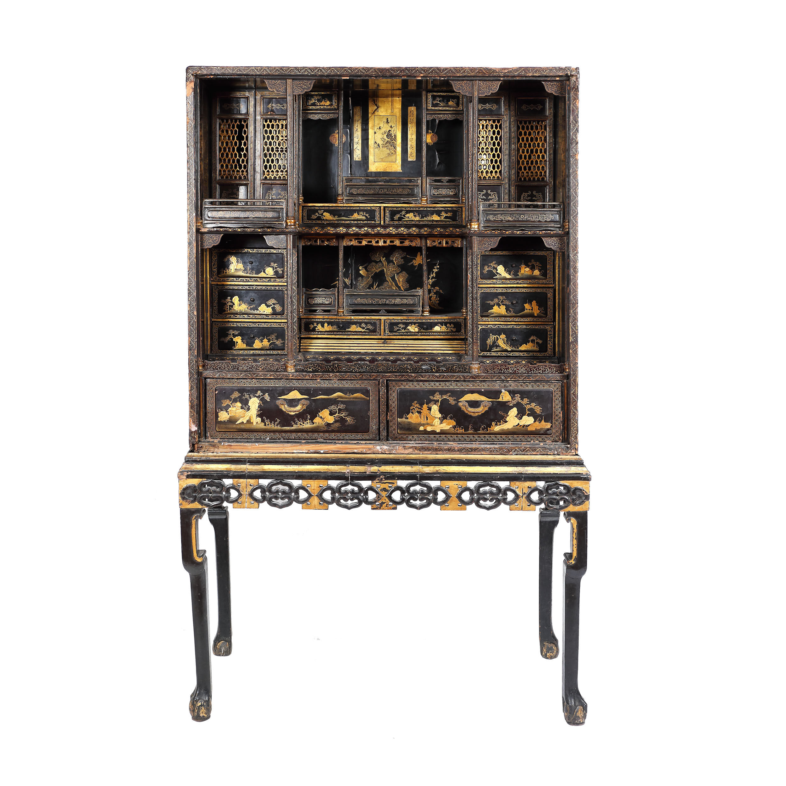 111F. Impresionant cabinet din lemn exotic, lăcuit şi parţial aurit, decorat cu motive vegetale, perioada Qing, China, sec. XIX, a aparținut colecției Generalului Gheorghe Manu