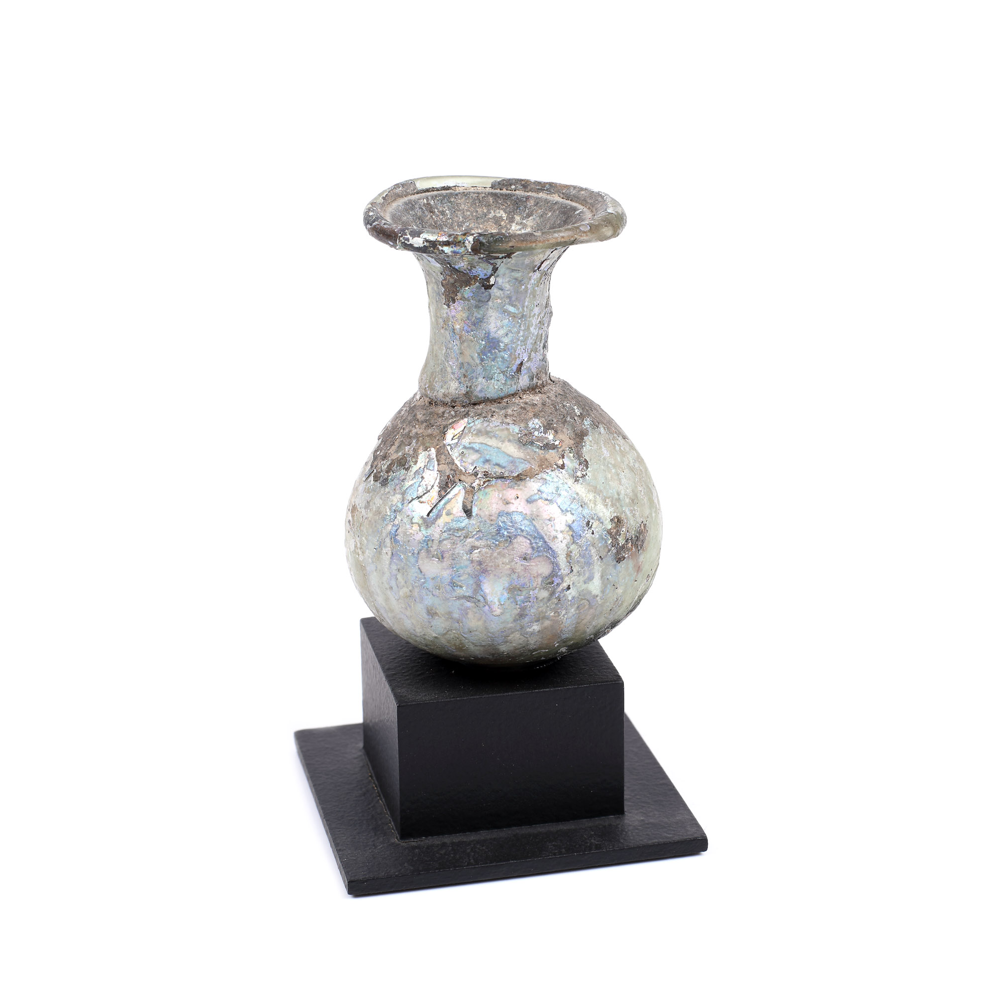 75. Impresionant unguentarium roman din sticlă, cu reflexii irizante, probabil Siria, sec. I, provine din colecția Dr. Roth-Nicolau