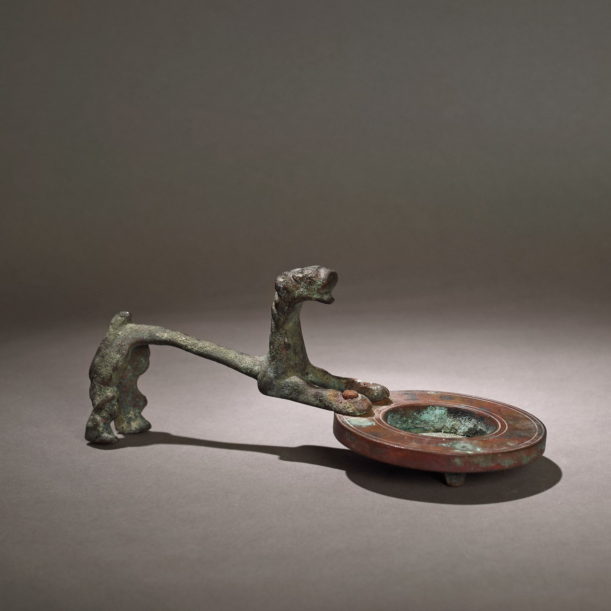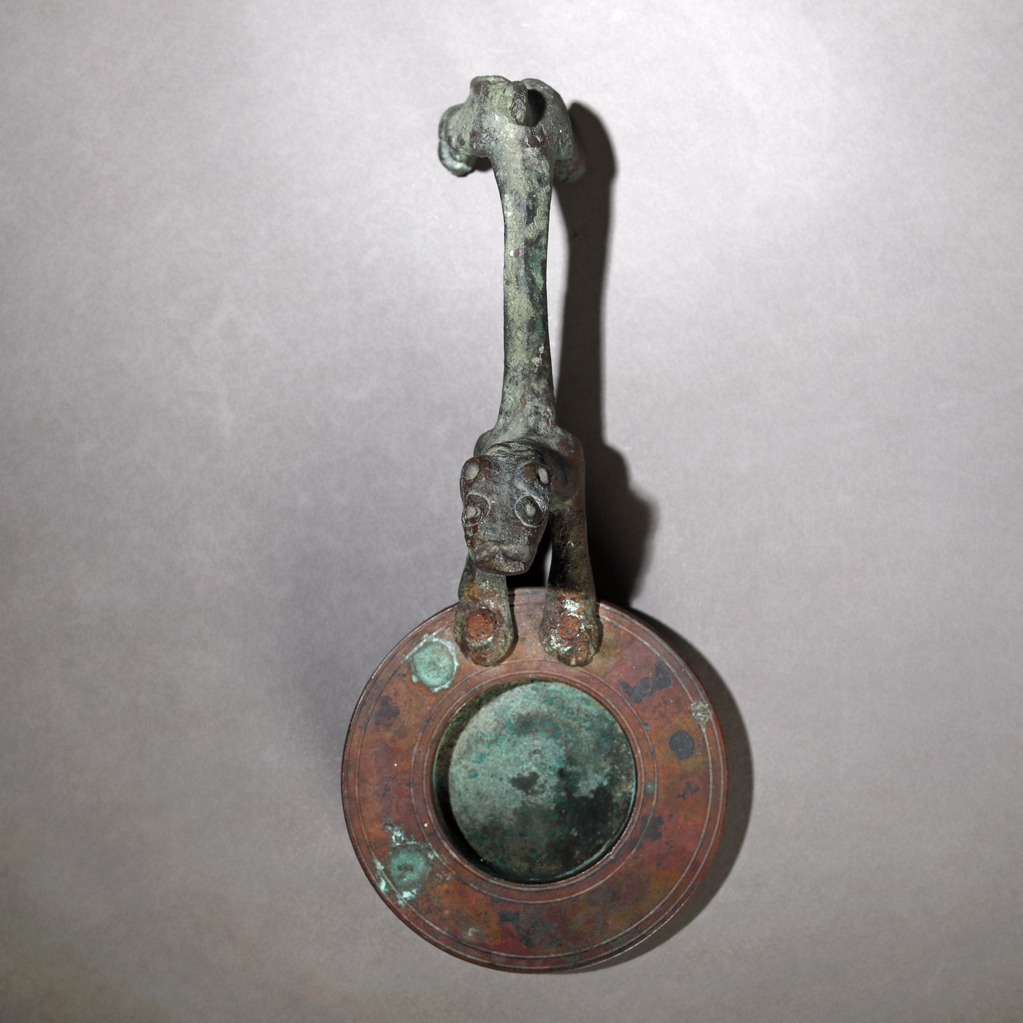 77. Inedit obiect decorativ compus din două piese: un leu, posibil a treia dinastie Ur, Sumer, cca. 2112-2004 î.e.n. și un element circular, posibil medieval, provine din colecția Dr. Roth-Nicolau