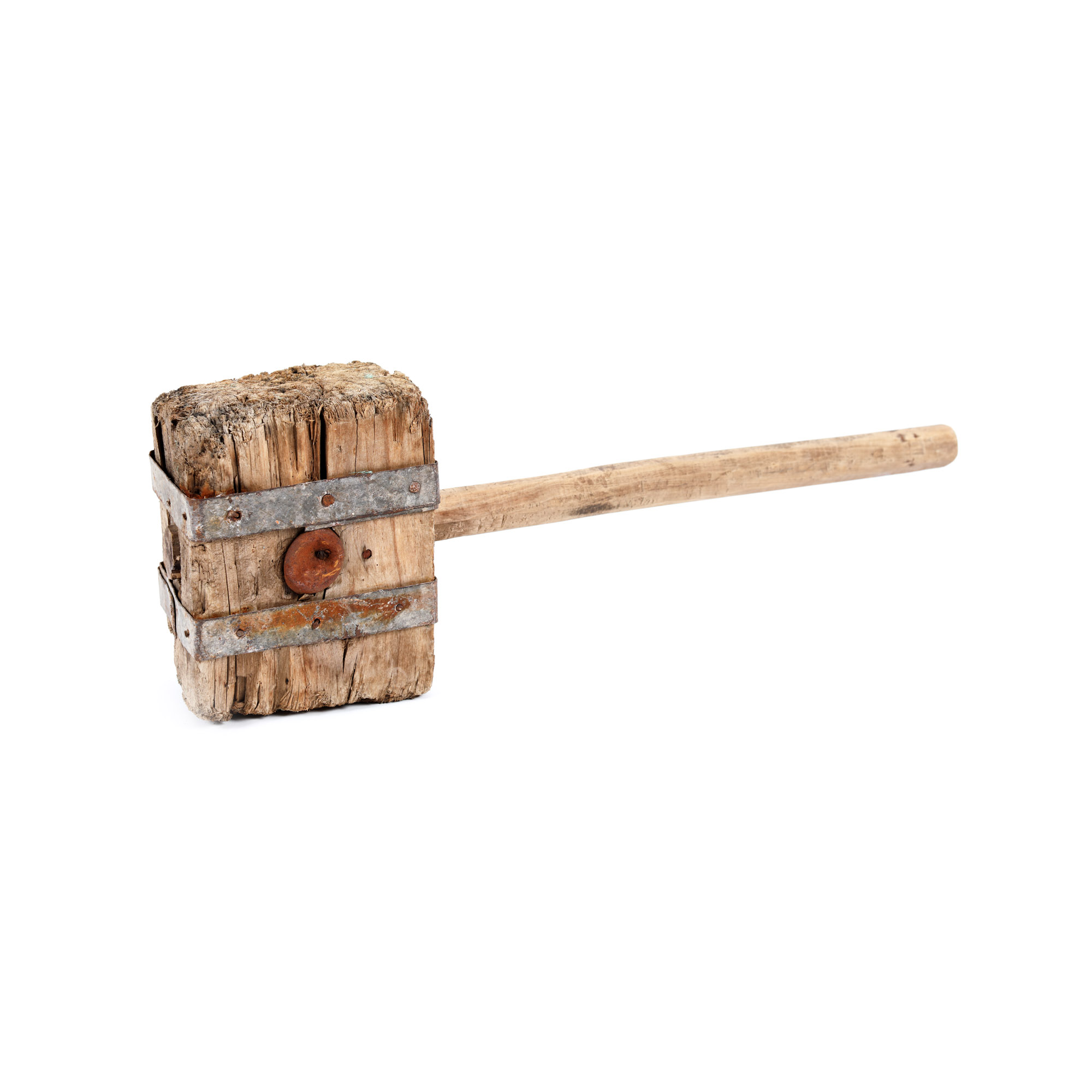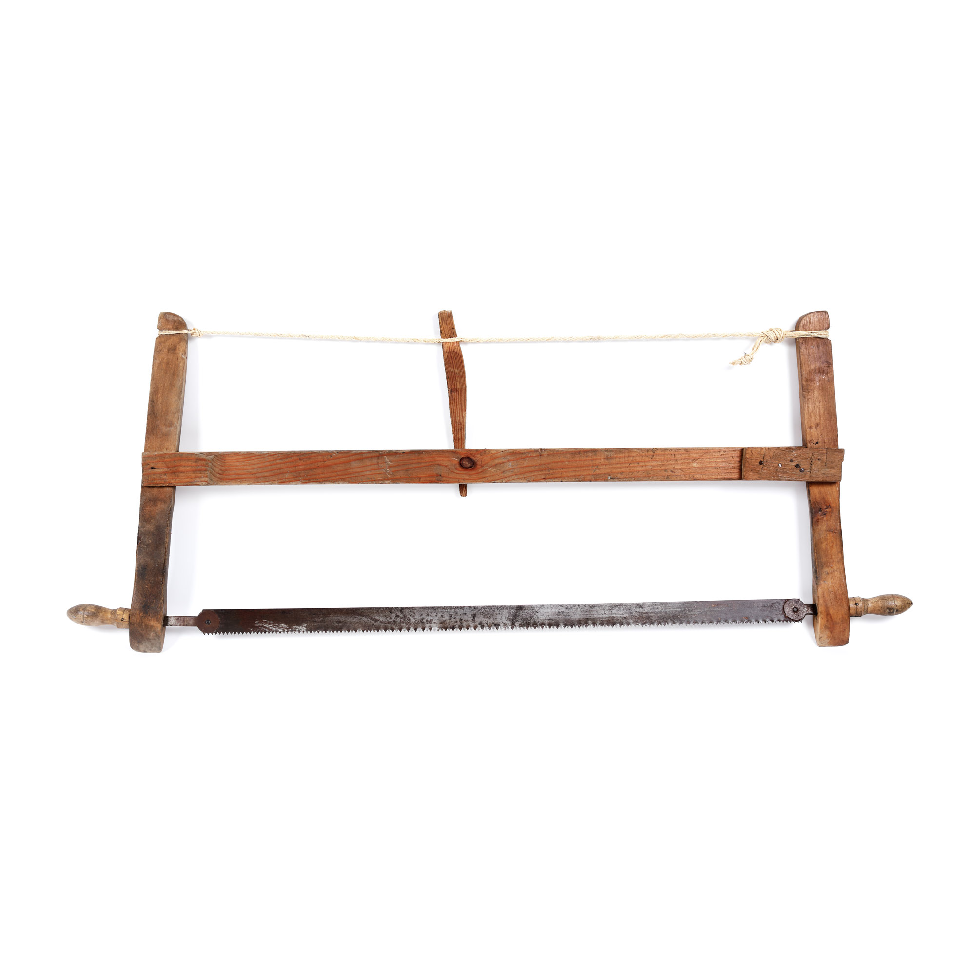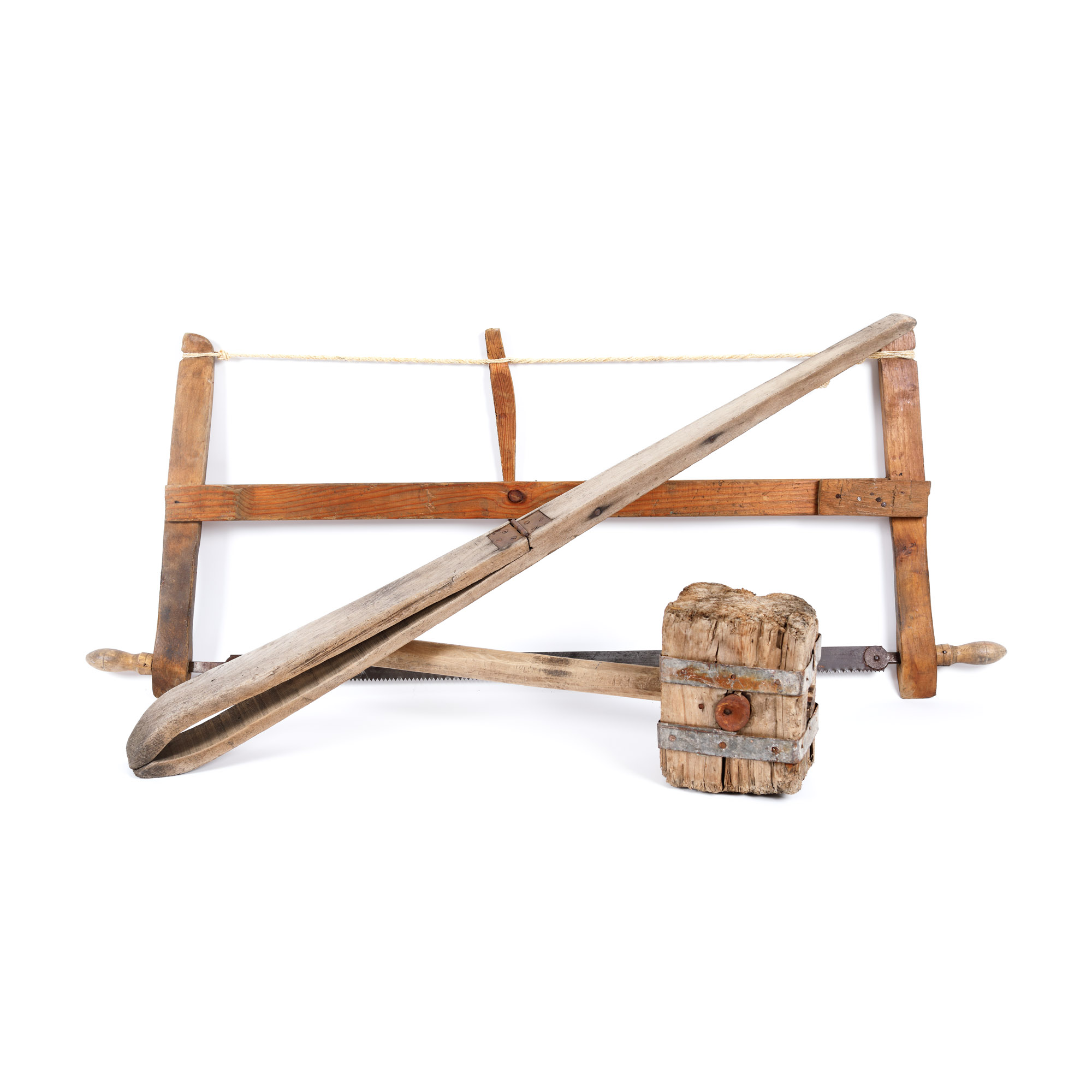 158. Lot format din baros din lemn, fierăstrău și instrument specific pentru pielărie, începutul sec. XX