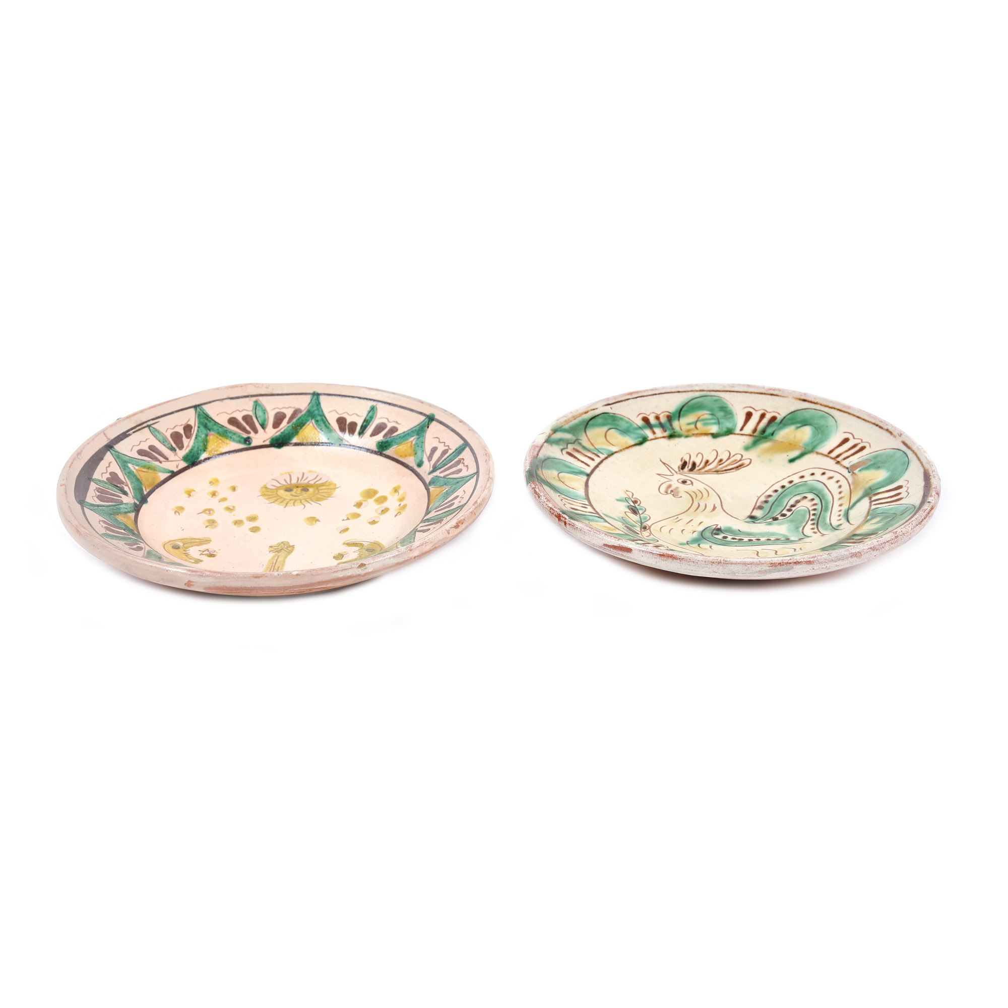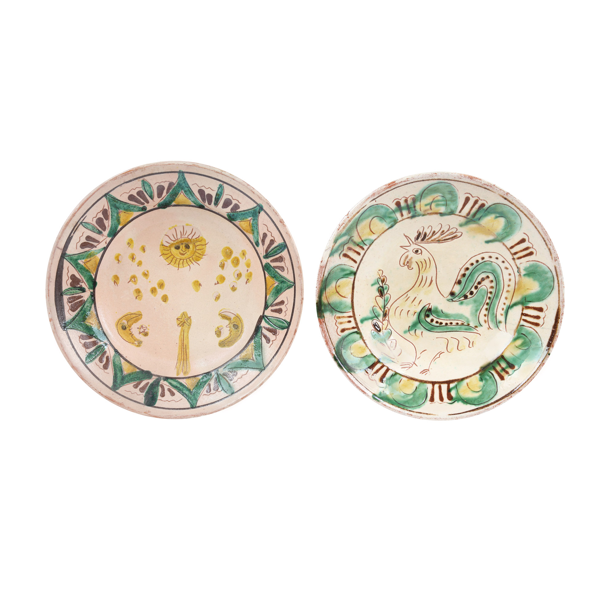 165. Lot format din două farfurii decorative tip Kuty, semnate Colibaba, decorate cu cocoș și motive astrale, Rădăuți, prima jumătate a sec. XX, provine din colecția fostului diplomat Bucur Chiriac