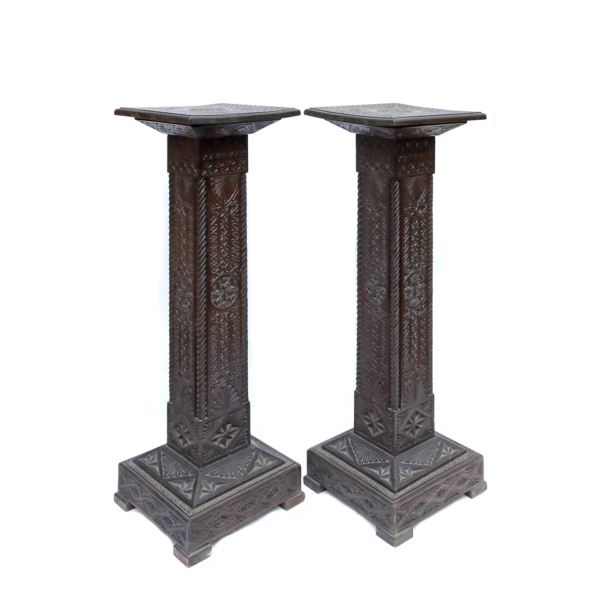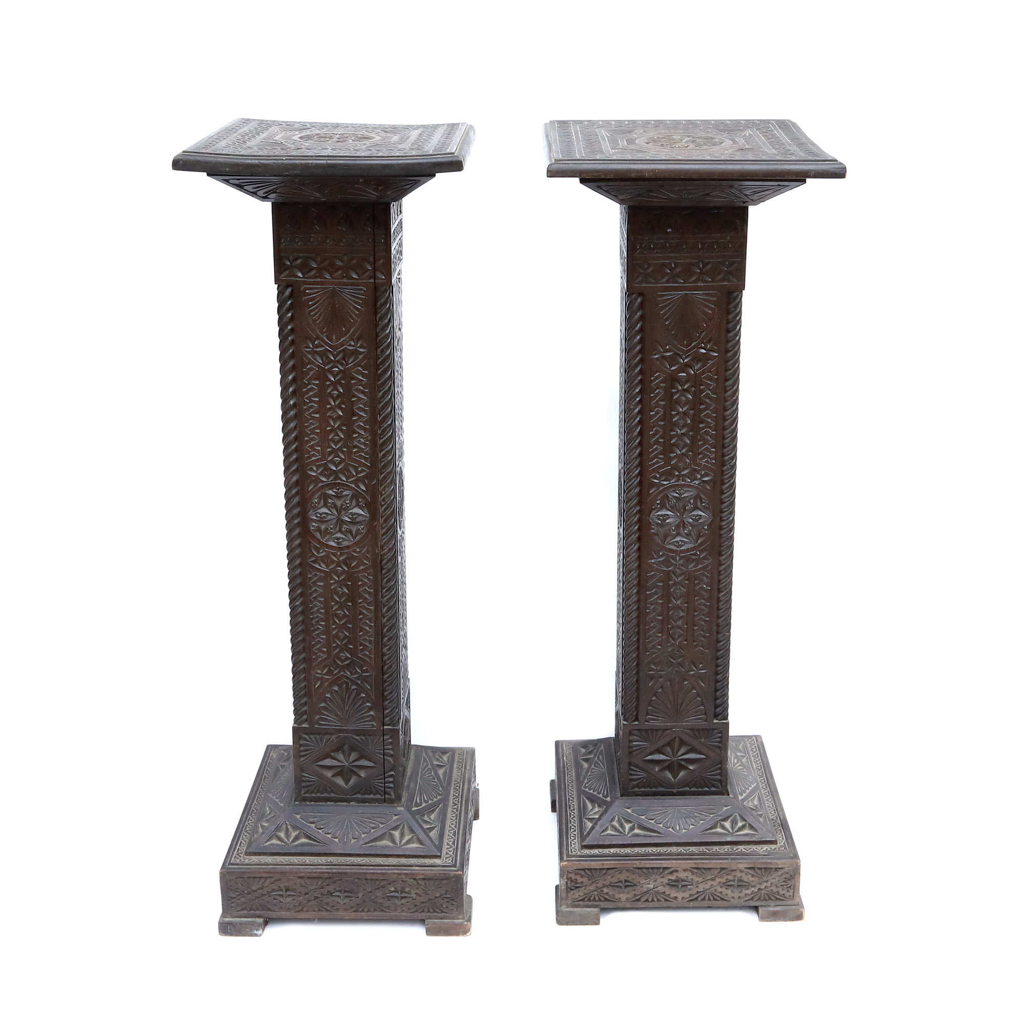 57. Lot format din două piedestale din lemn de tei, decorate în stil Neo-Românesc, începutul sec. XX, provine din colecția fostului diplomat Bucur Chiriac