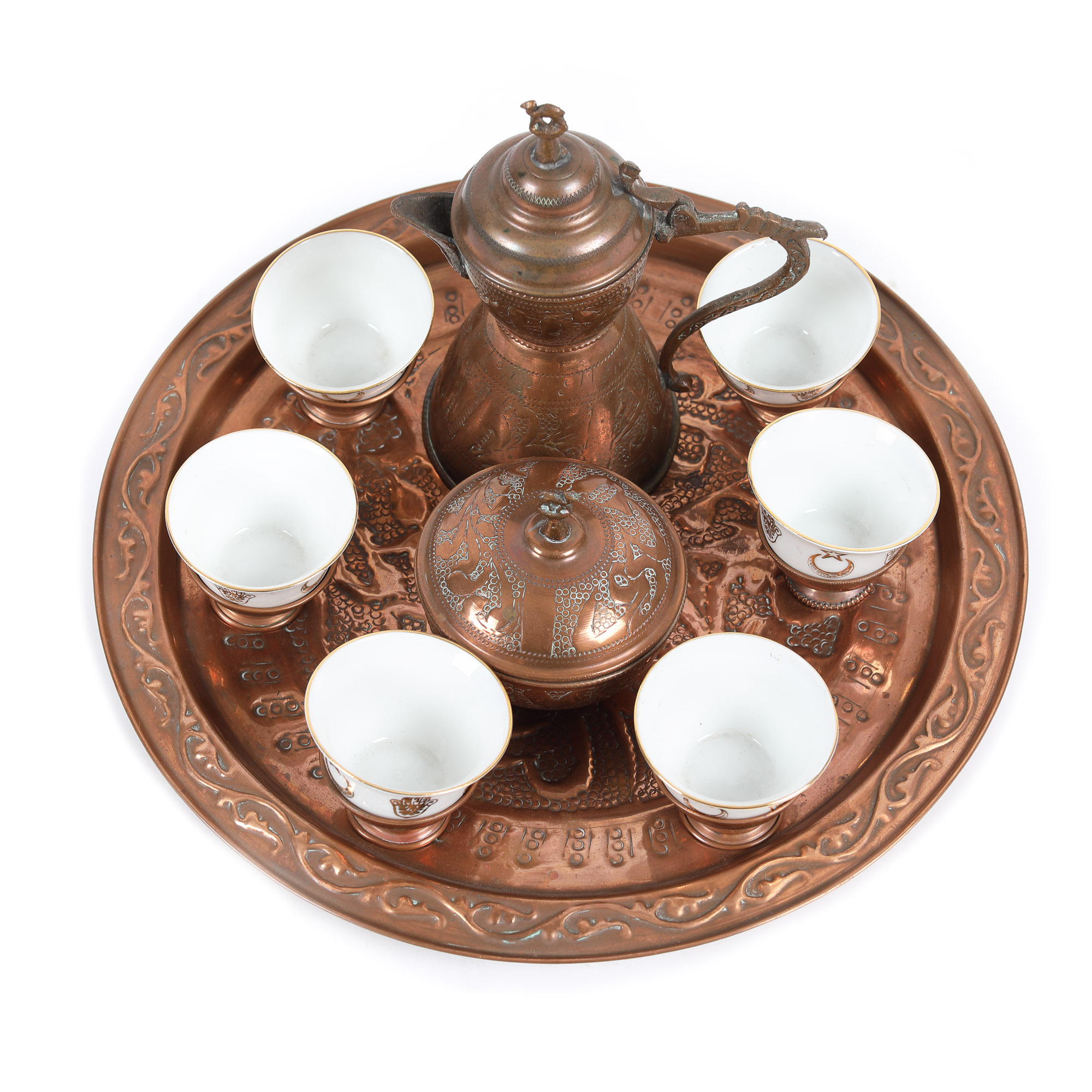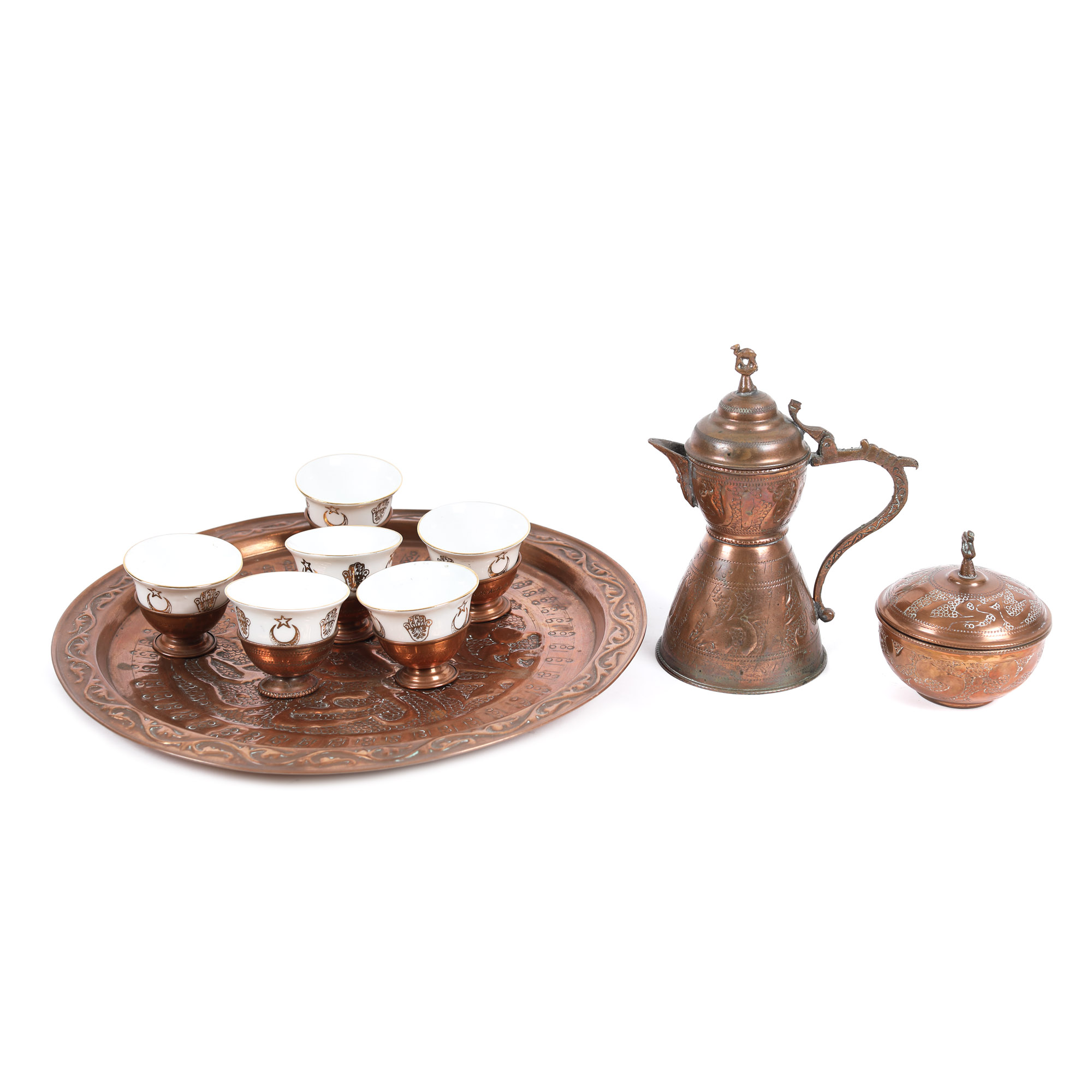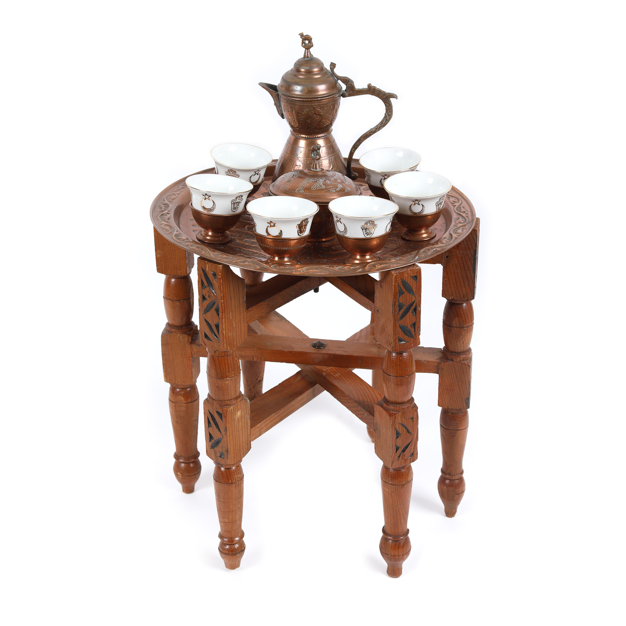 113. Lot format din masă din lemn exotic, tavă, ibric, zaharniță și cești din cupru și ceramică, pentru cafea, Turcia [a doua jumătate a sec. XX]