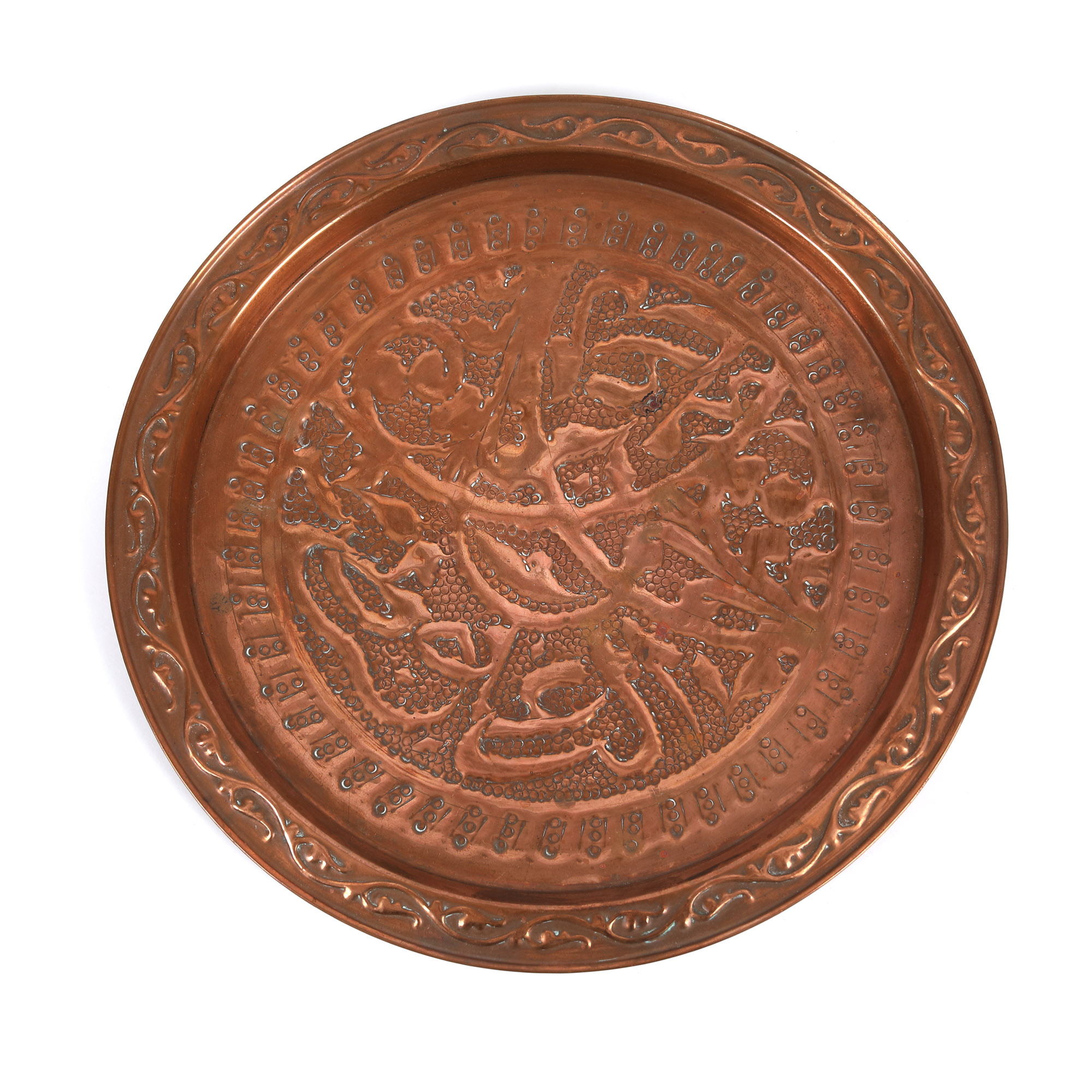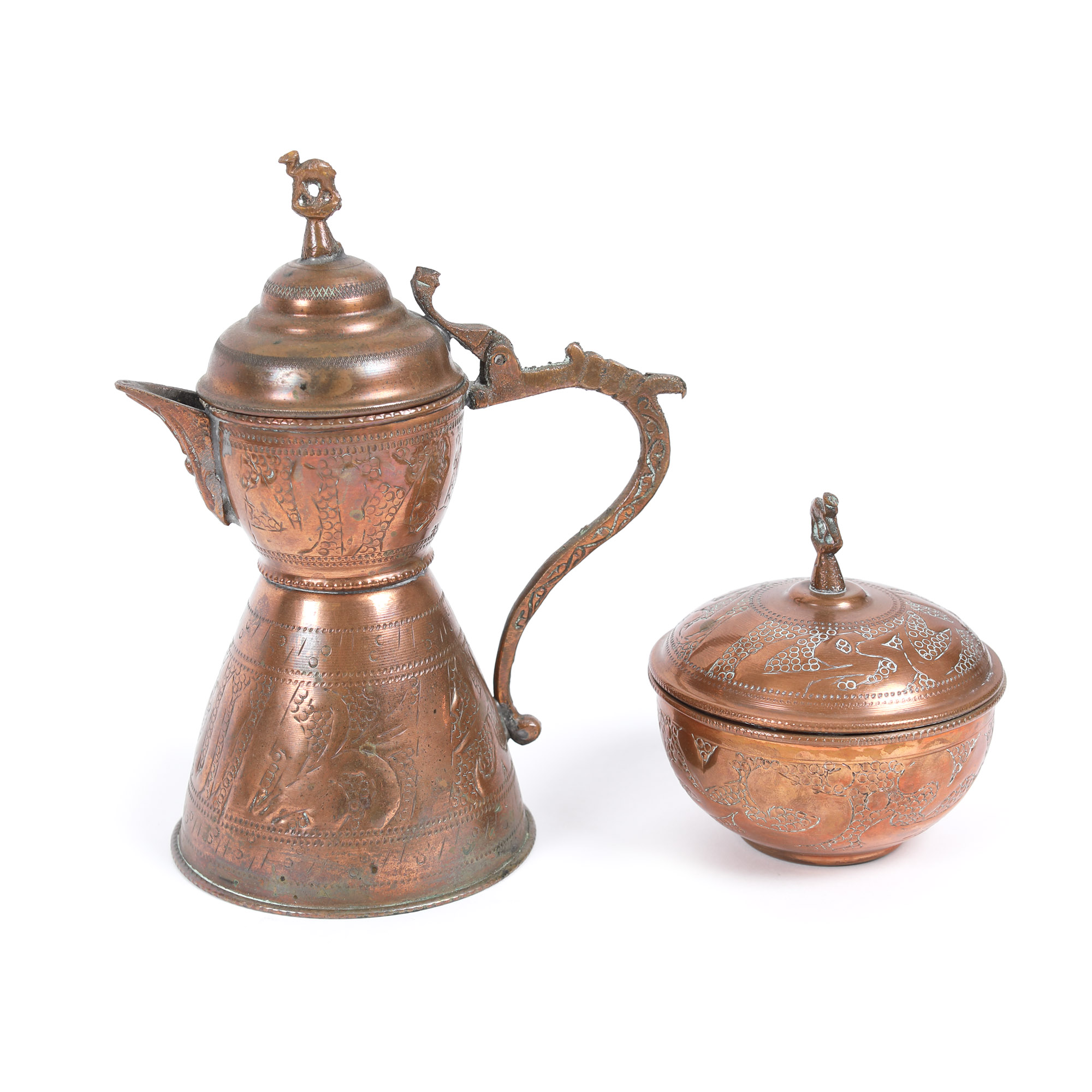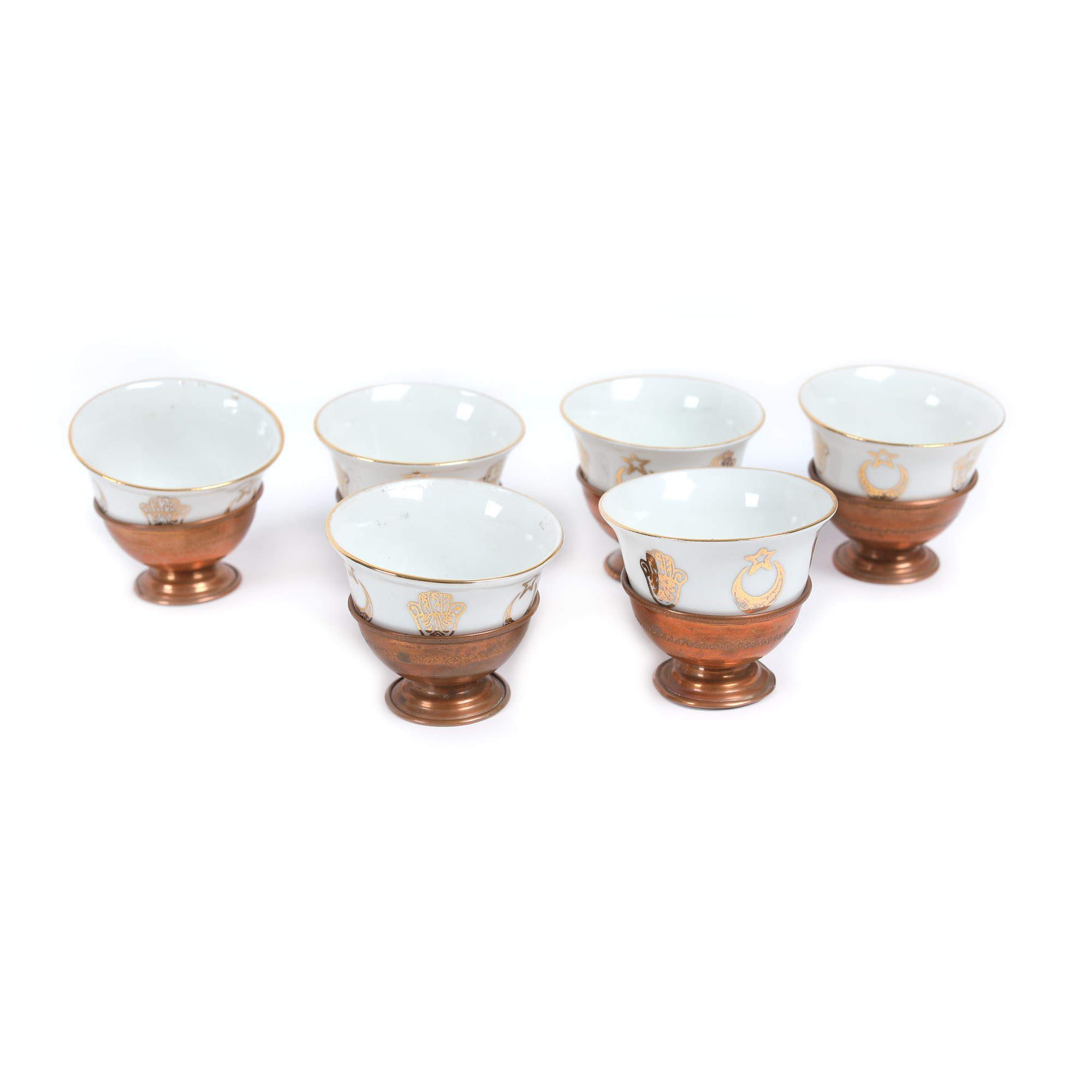 113. Lot format din masă din lemn exotic, tavă, ibric, zaharniță și cești din cupru și ceramică, pentru cafea, Turcia [a doua jumătate a sec. XX]