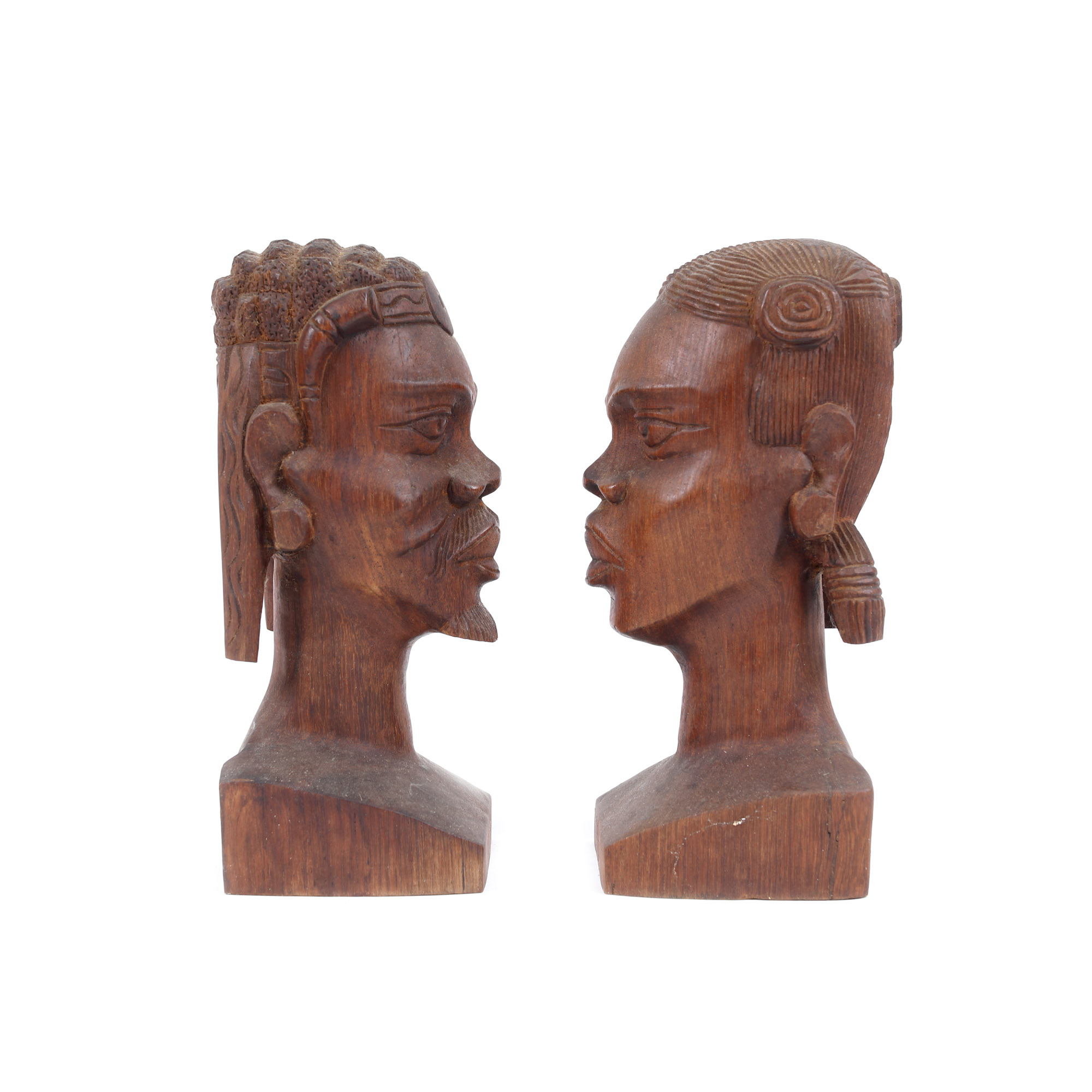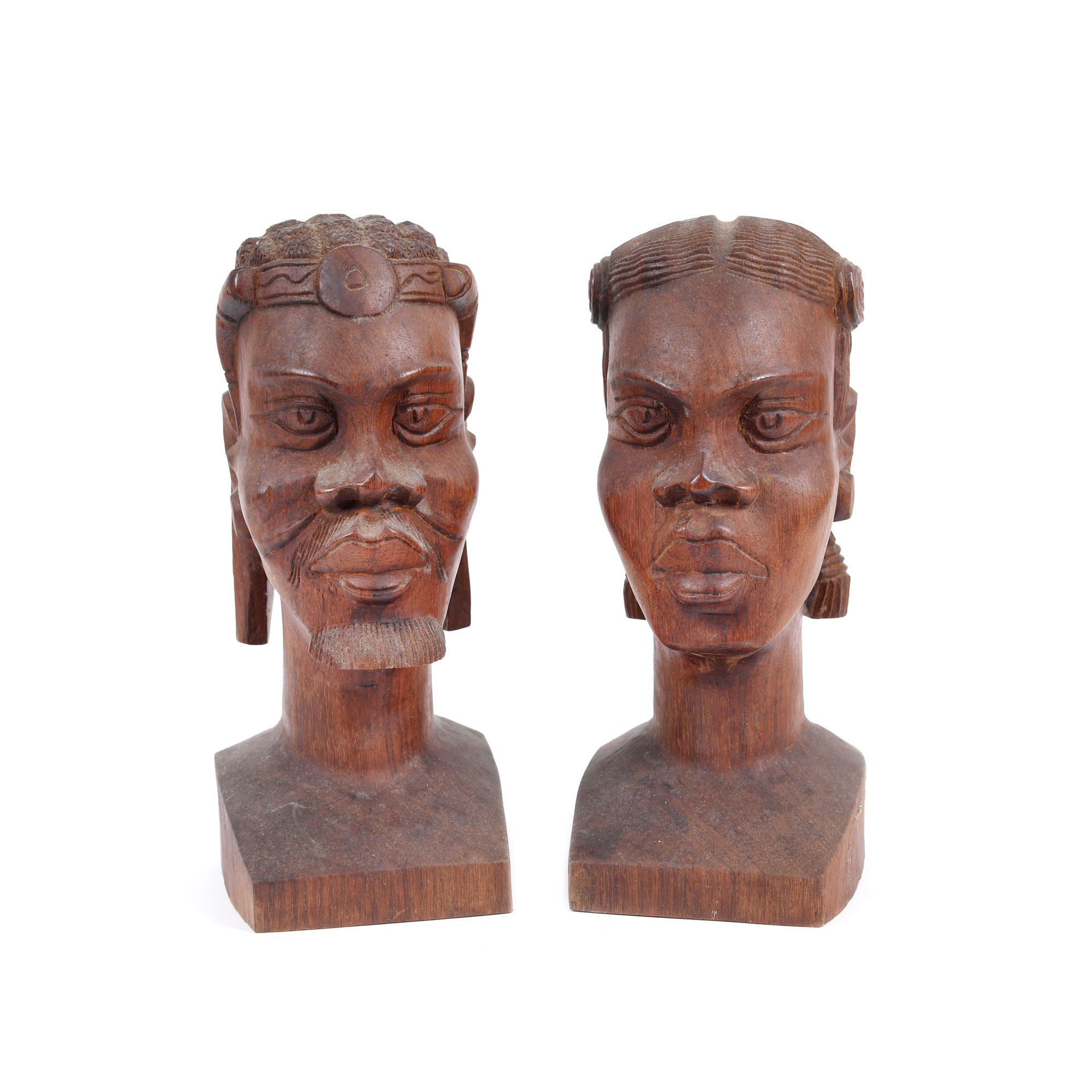 126. Pereche de busturi africane din lemn exotic, ilustrând două zeități, Africa de vest, au aparţinut fostului ministru de externe George Macovescu [a doua jumătate a sec. XX]