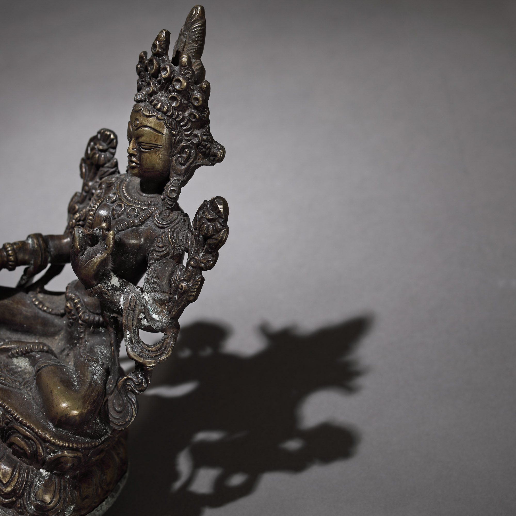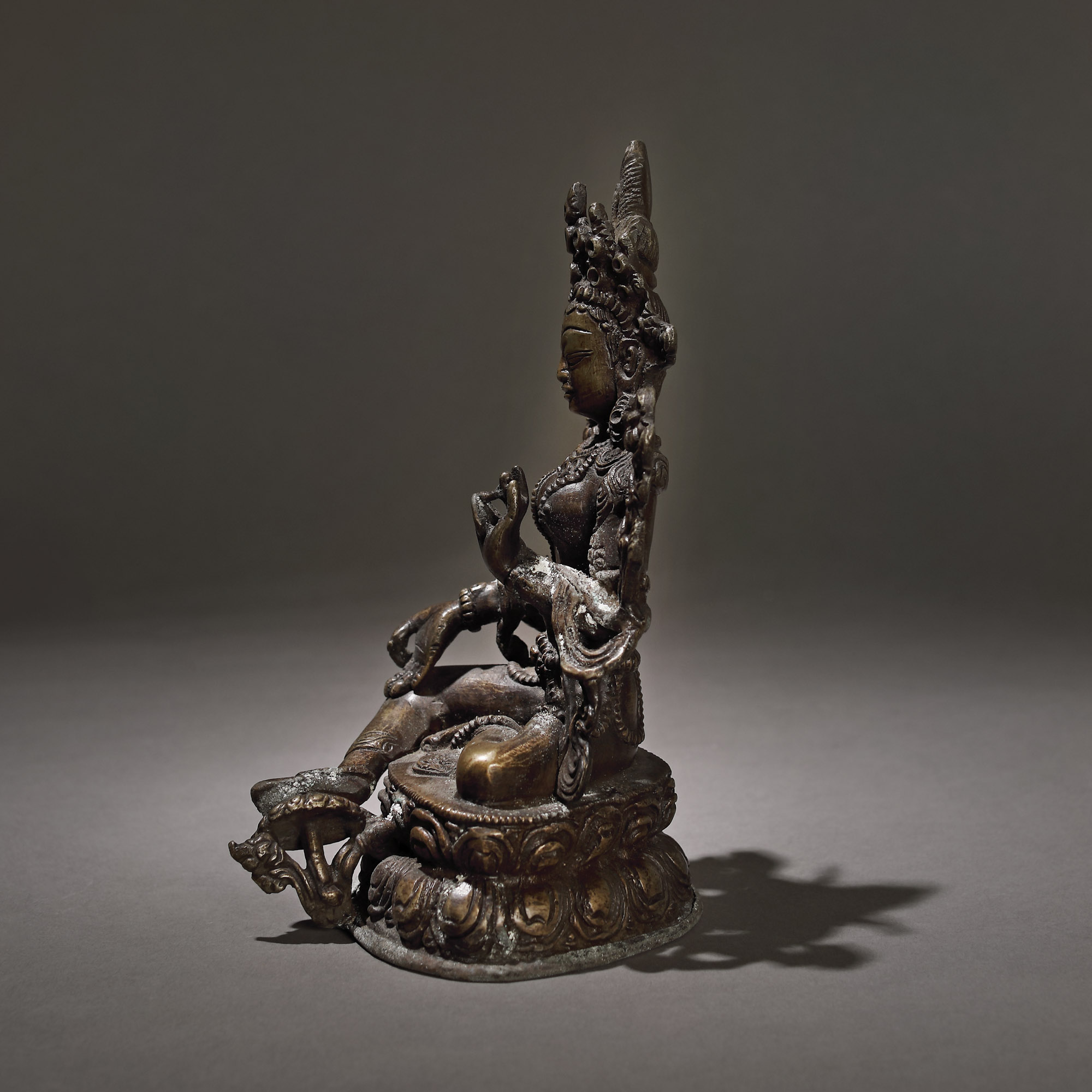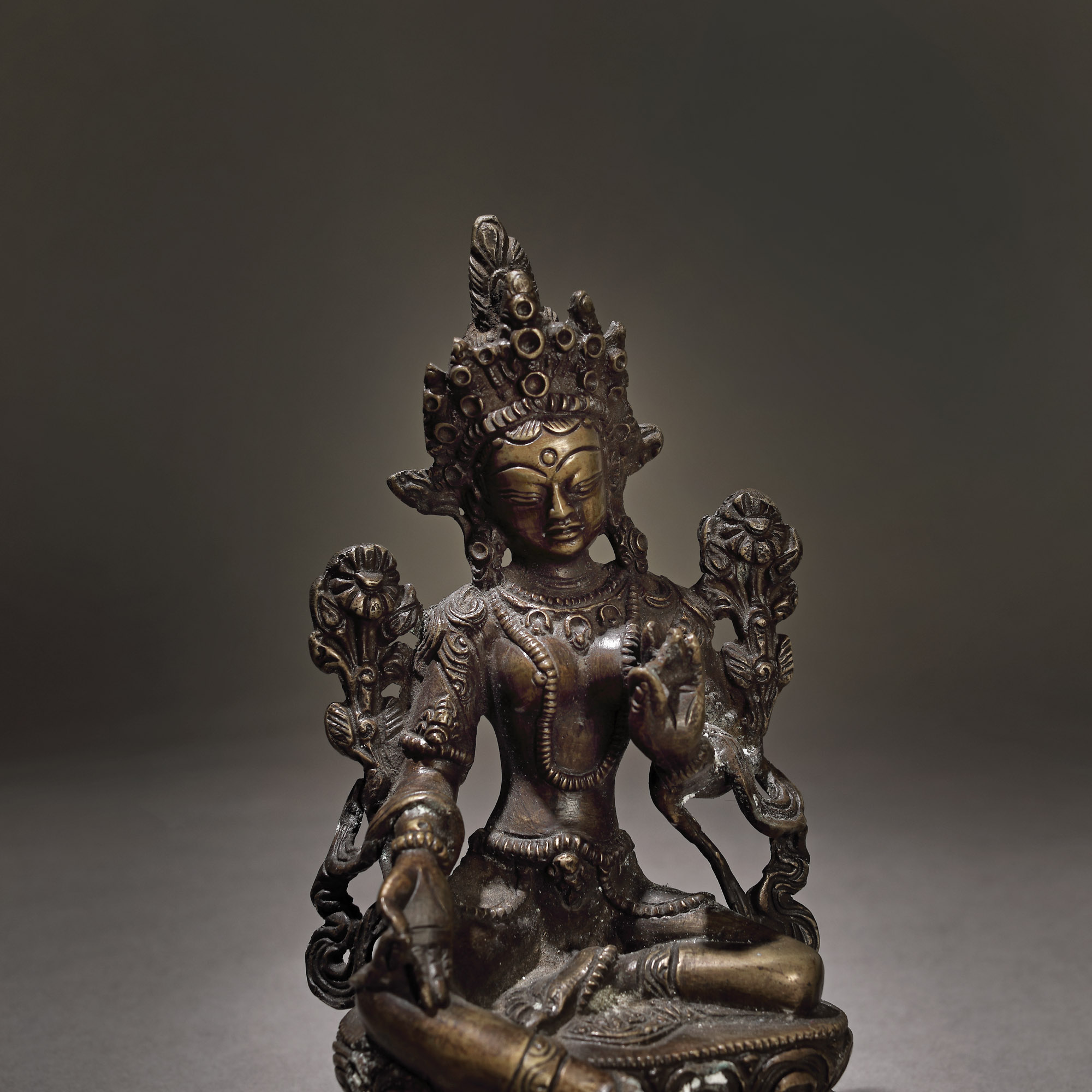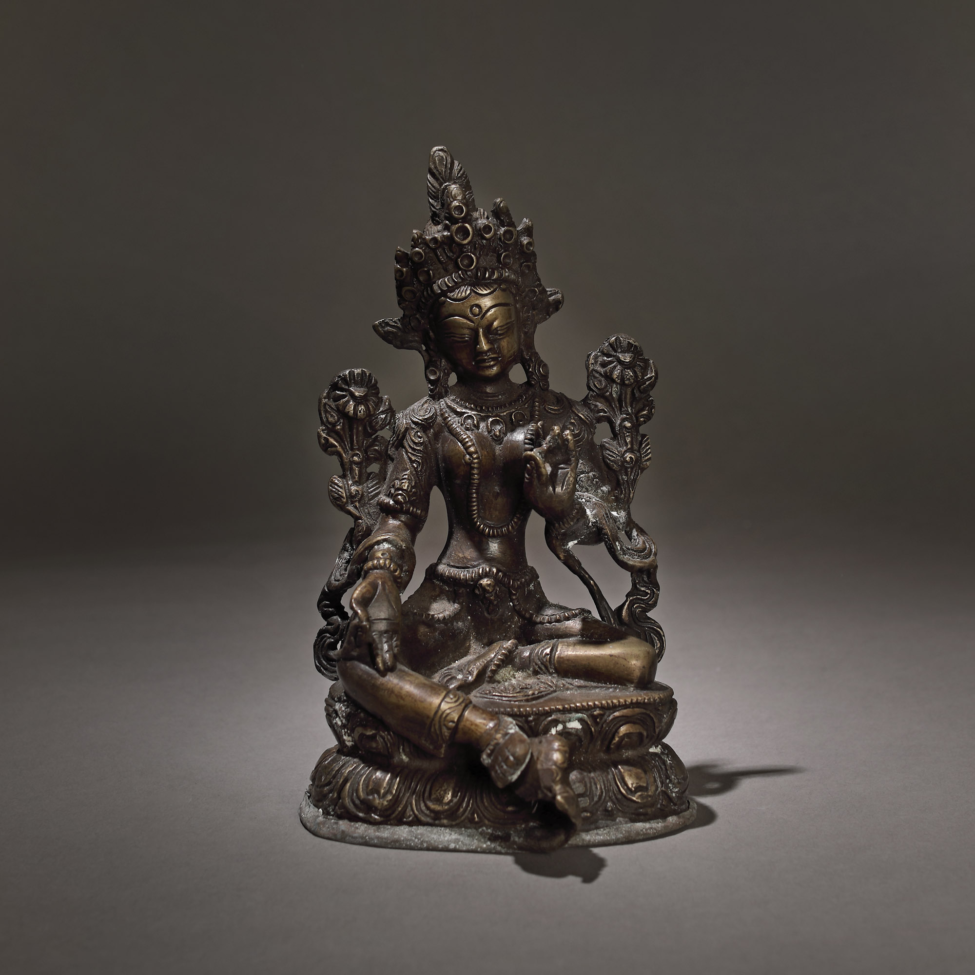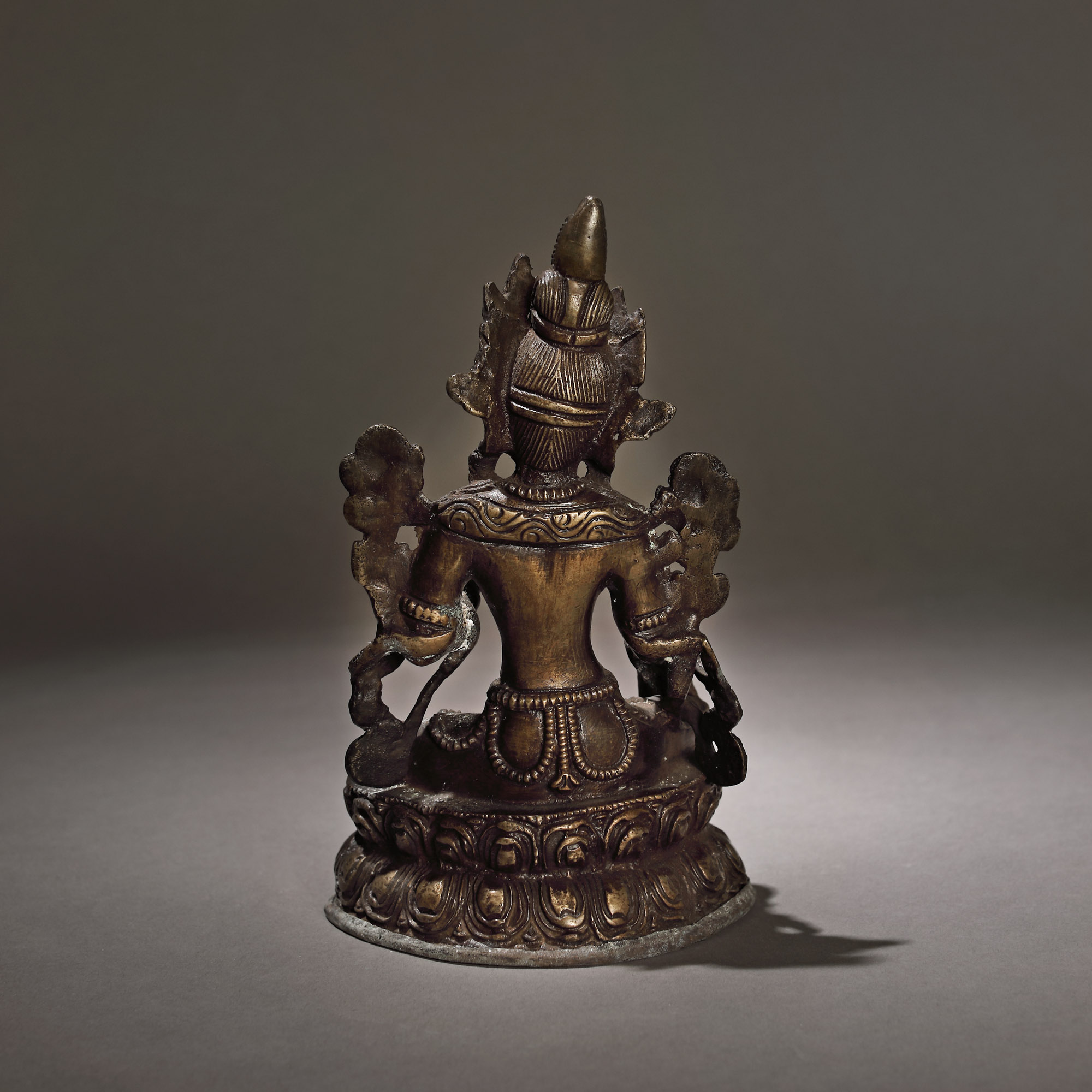 128. Statuetă din bronz, reprezentând-o pe Maitreya Buddha, Asia de Sud-Est, probabil Birmania, sec. XV-XVIII, provine din colecția Dr. Roth-Nicolau