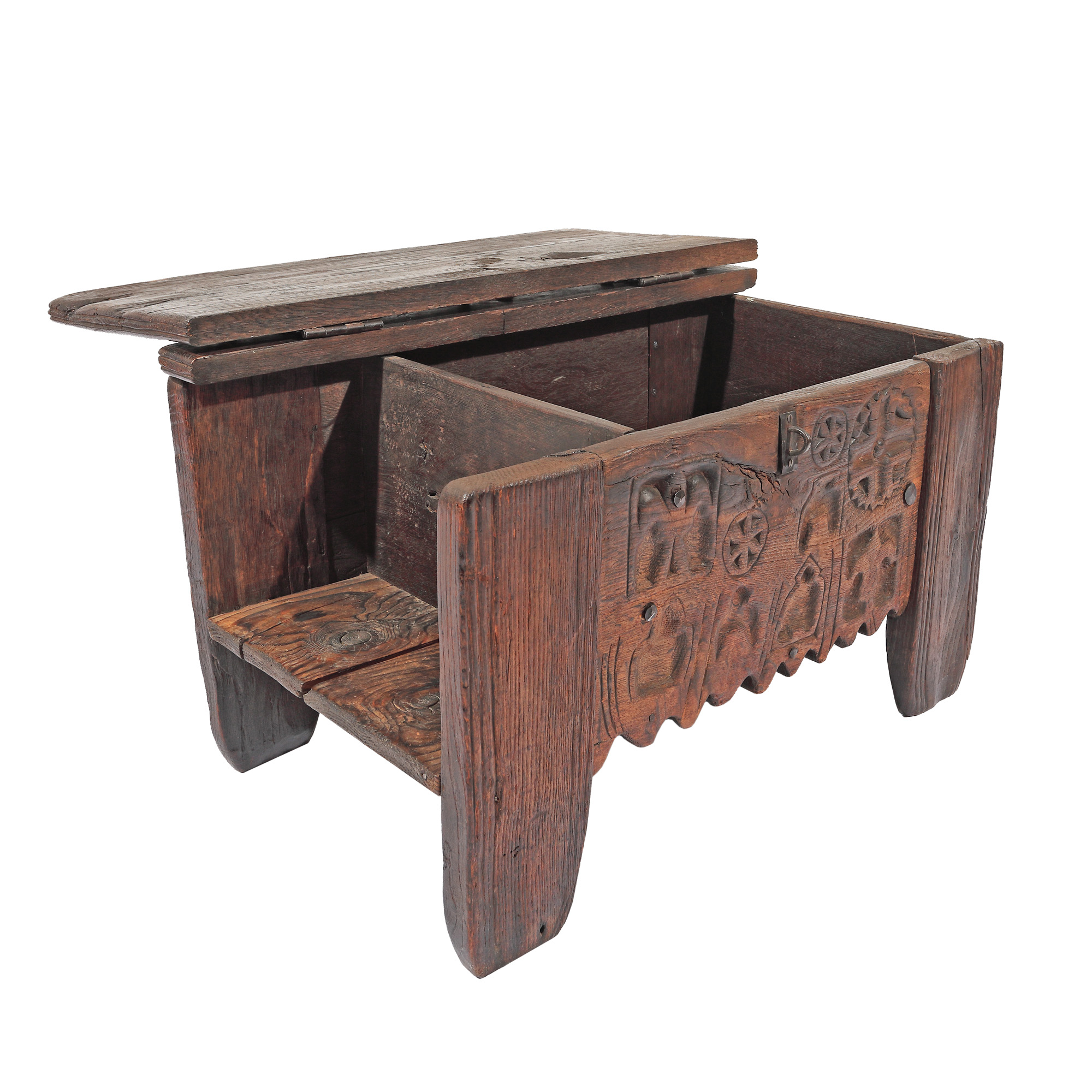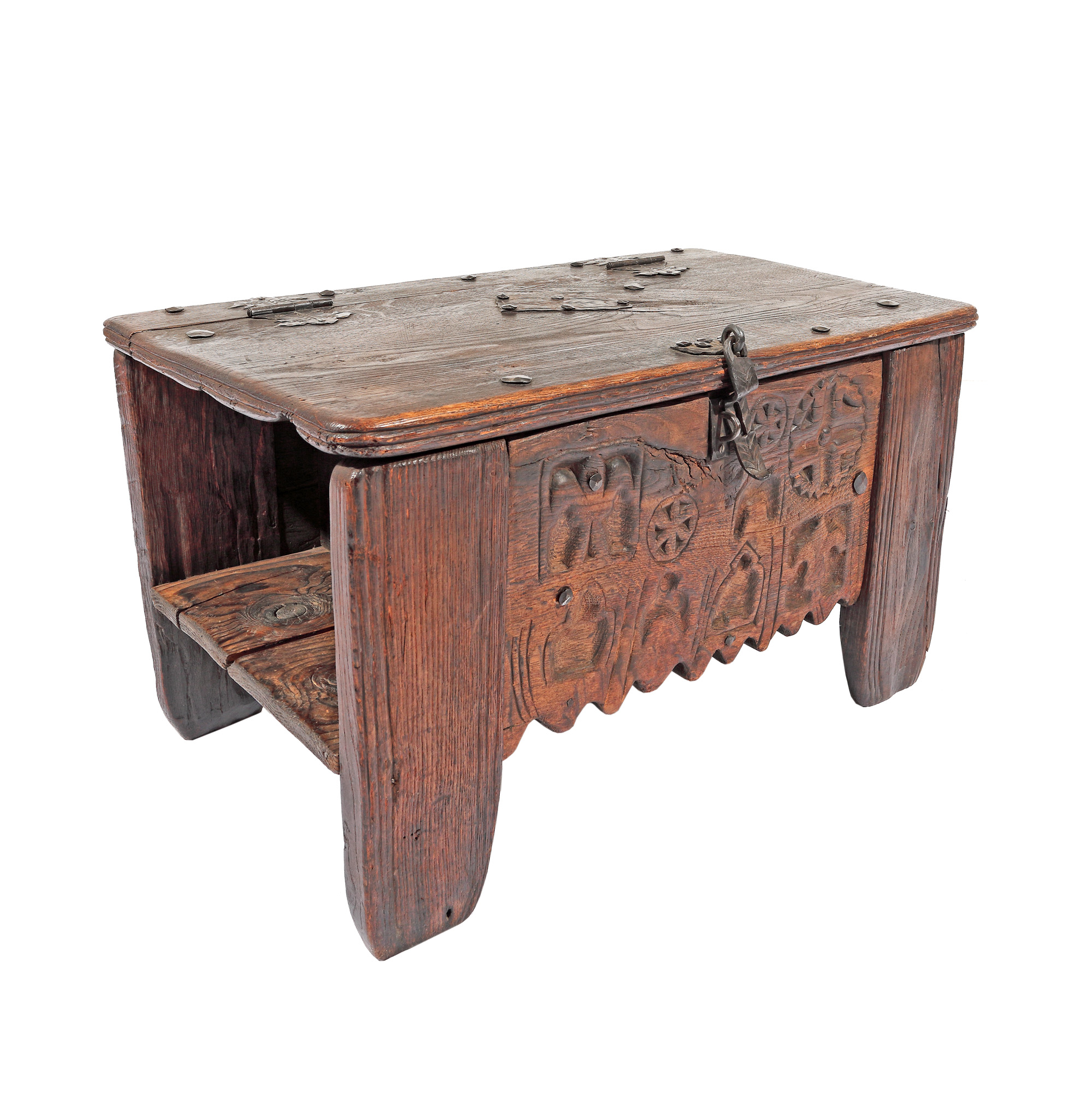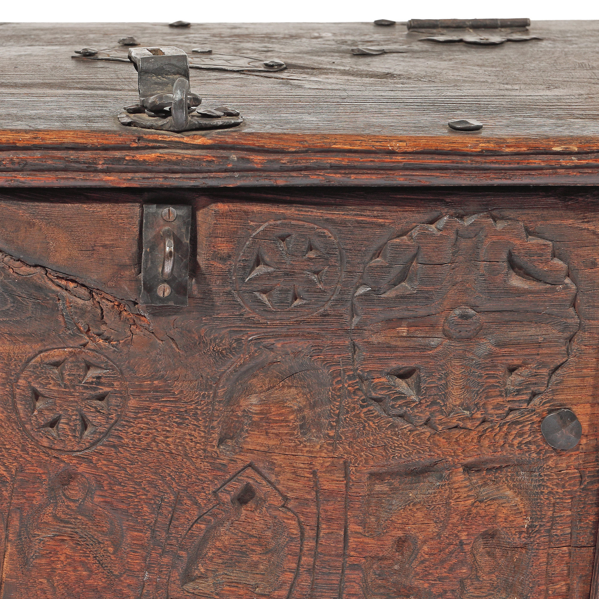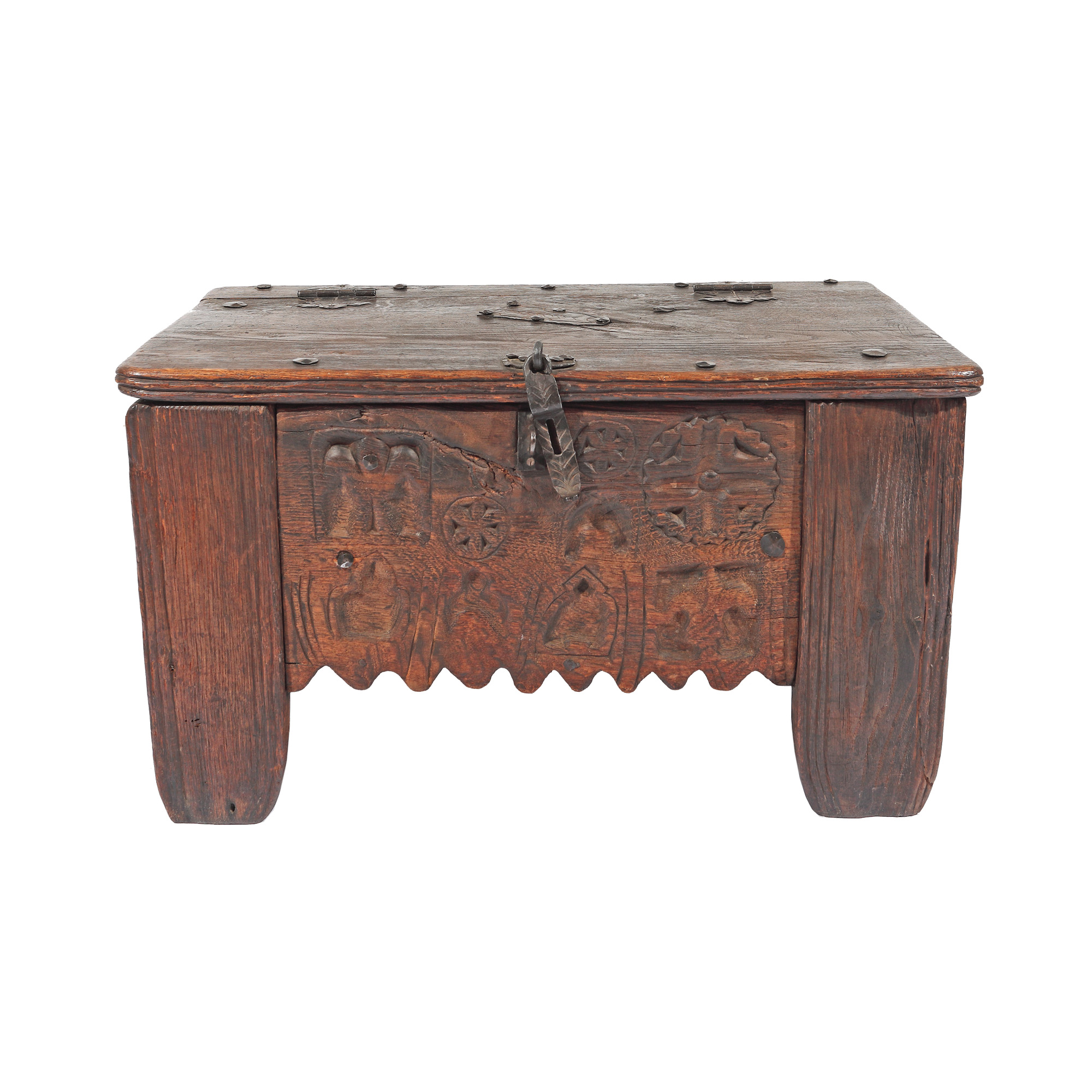 58. Cufăr din lemn sculptat, decorat cu simbolistică locală (cruce, rozetă solară, stema stilizată a Țării Românești), mijlocul sec. XIX