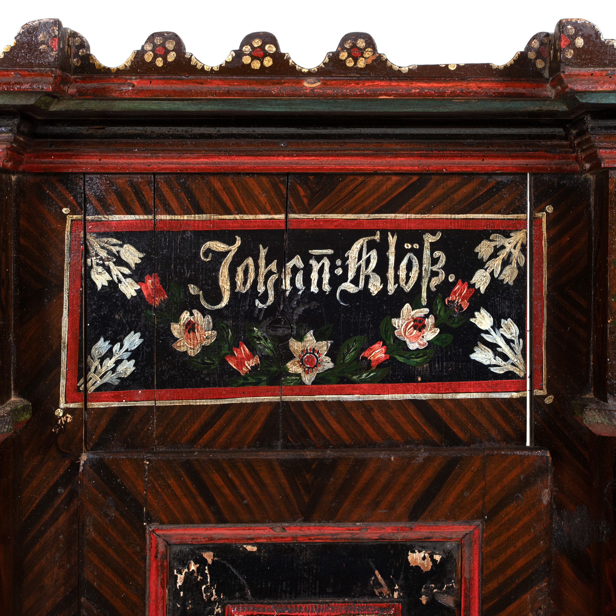 4. Armuroi săsesc din lemn, pictat, decorat cu arborele vieții, inscripționat cu numele proprietarului ”Johan Klok”, datat 1897