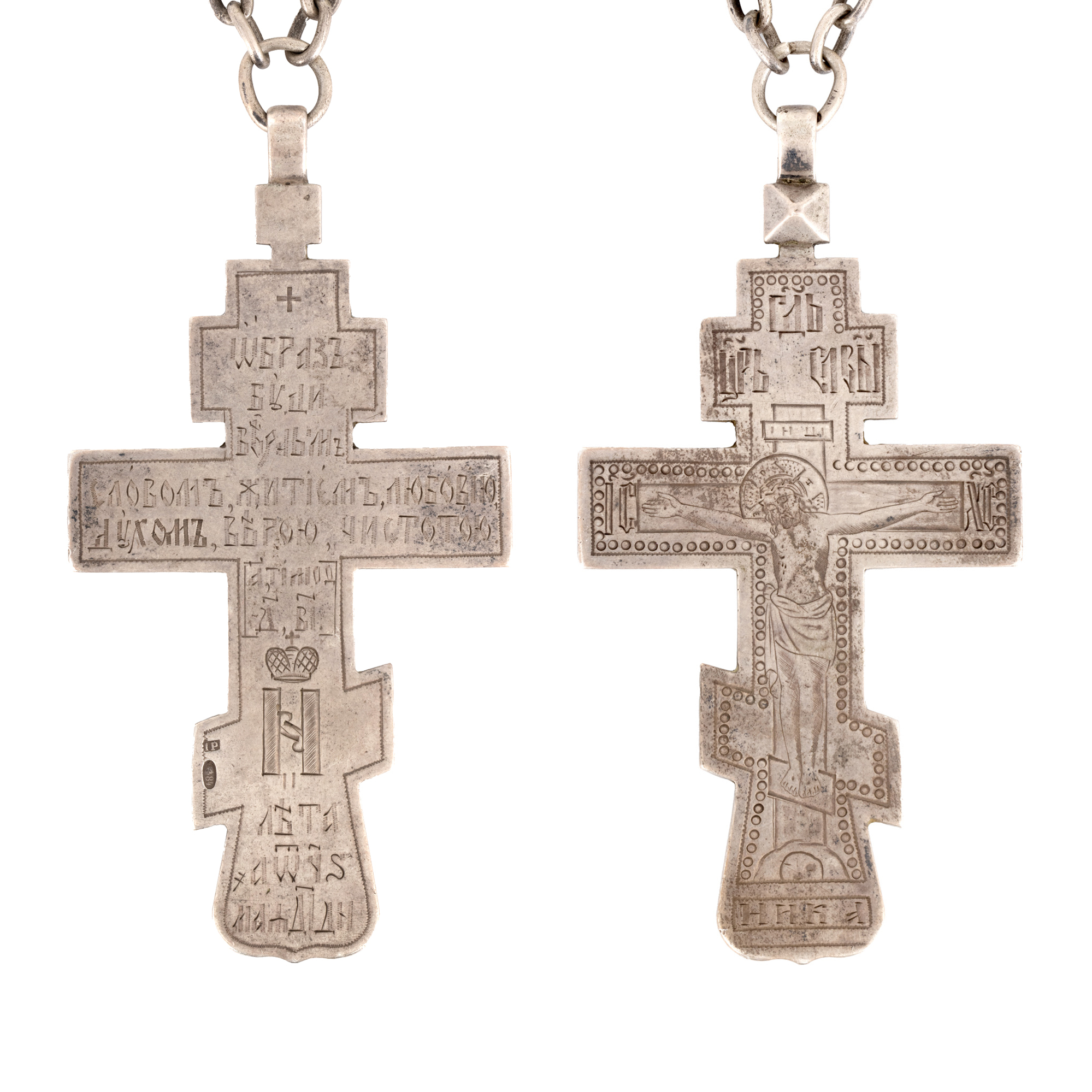 47. Cruce din argint, de monah, decorată cu scena ”Răstignirii” și cu monograma Țarului Nicolae al II-lea al Rusiei, 14 mai 1896, piesă foarte rară, de colecție