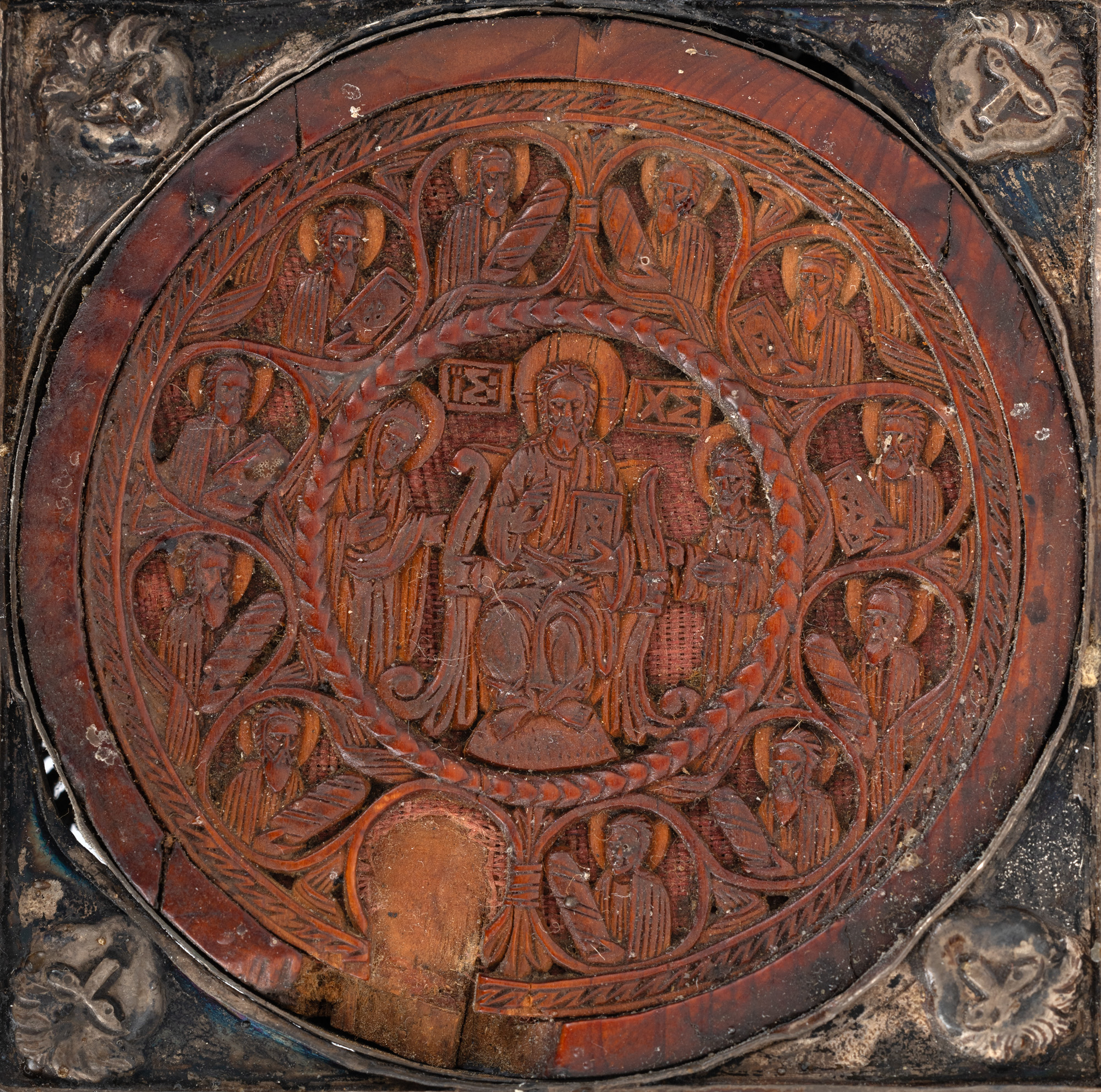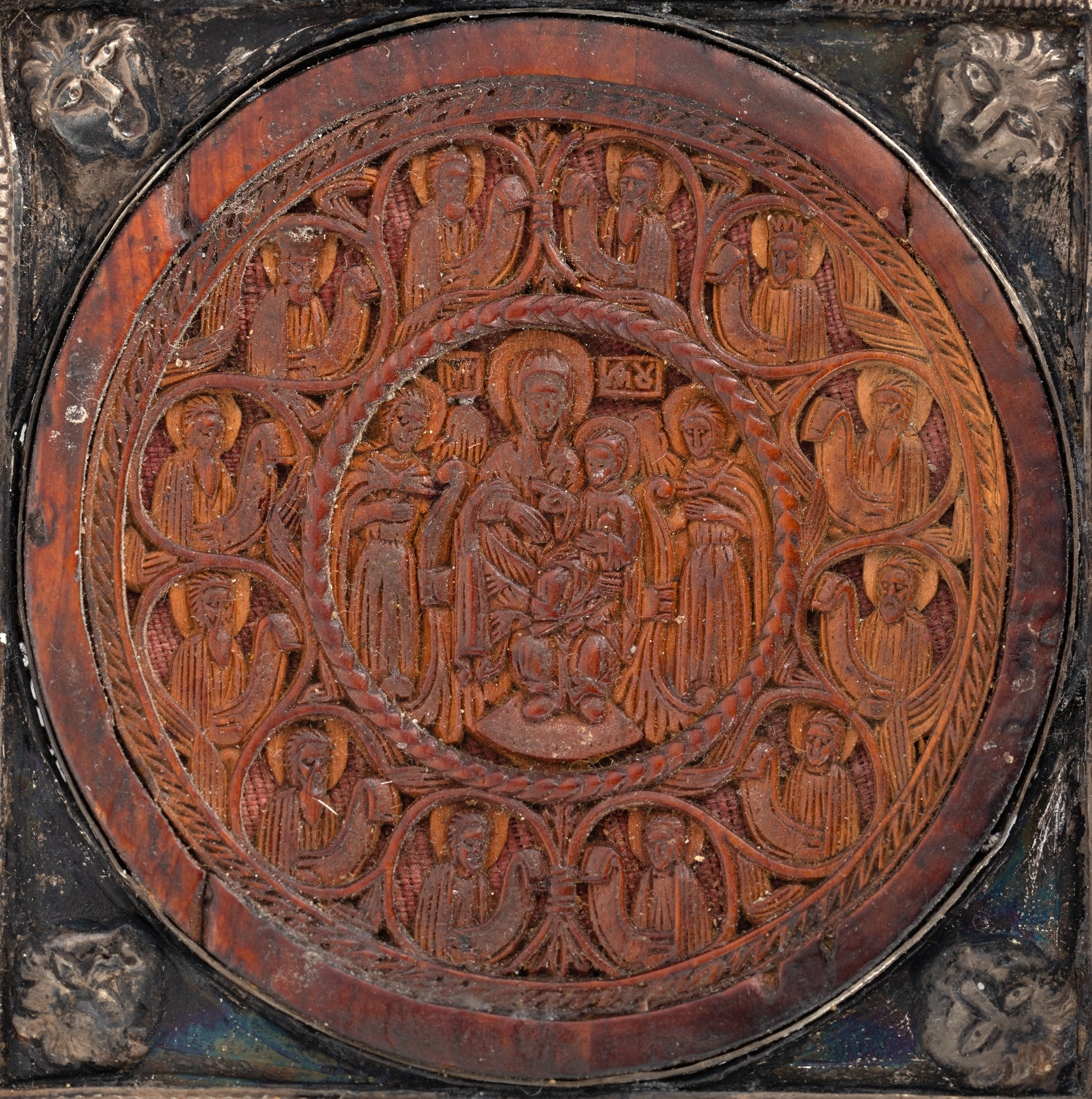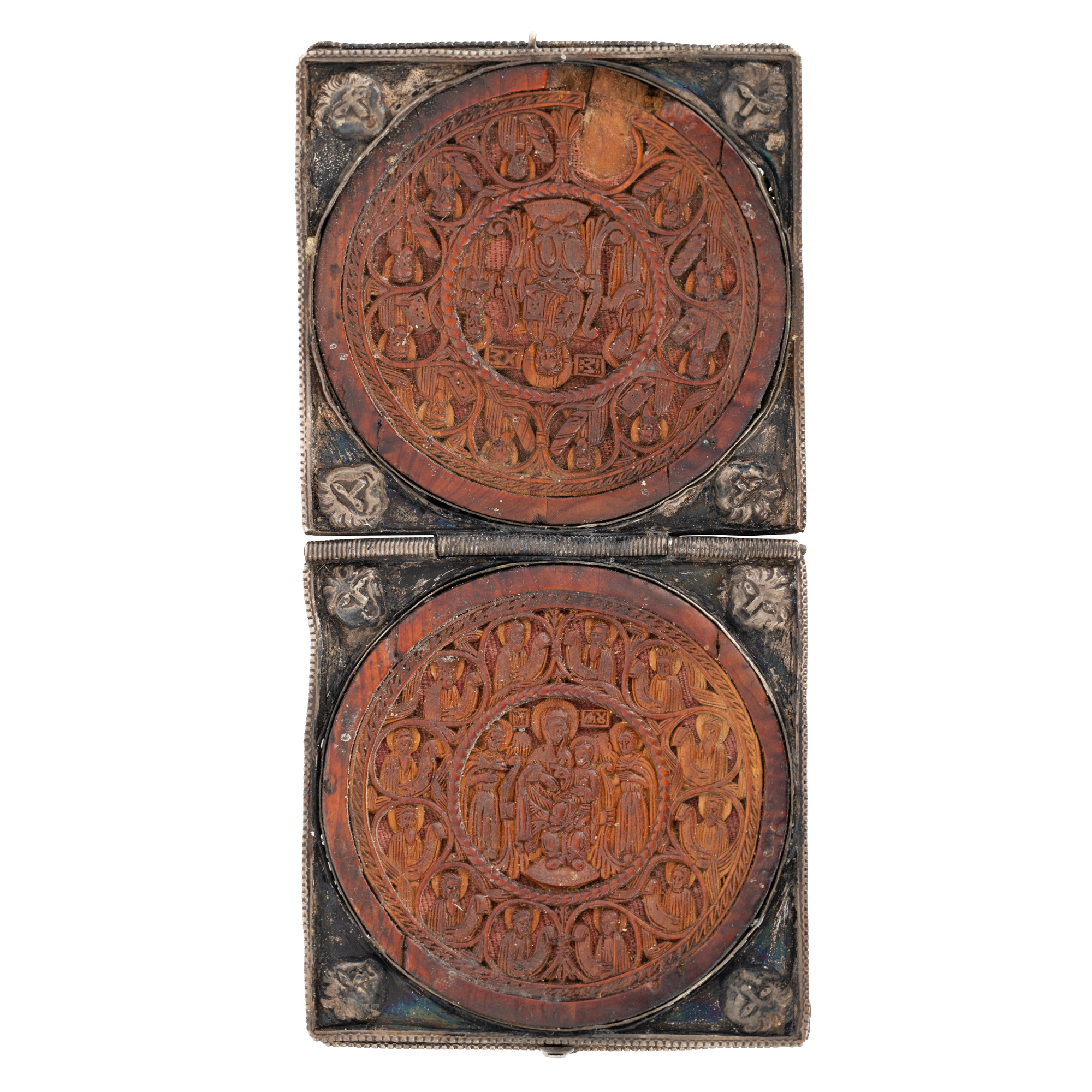 51. Diptic din argint filigranat și lemn sculptat, cu scenele ”Deisis” și ”Maica Domnului cu Pruncul, Doamna Îngerilor”, atelier grecesc, sec. XIX, piesă foarte rară, provine din colecția actriței Crăița Enulescu