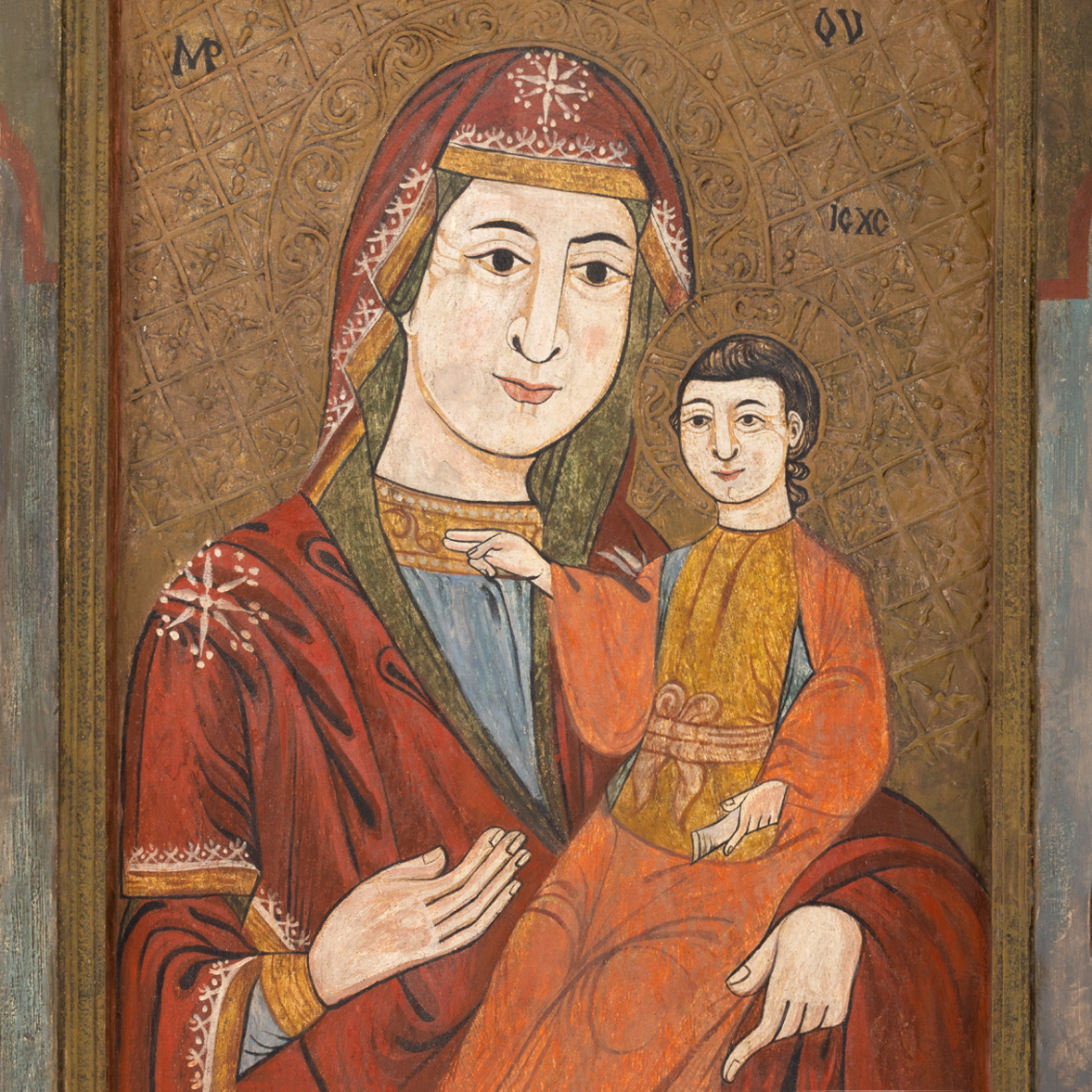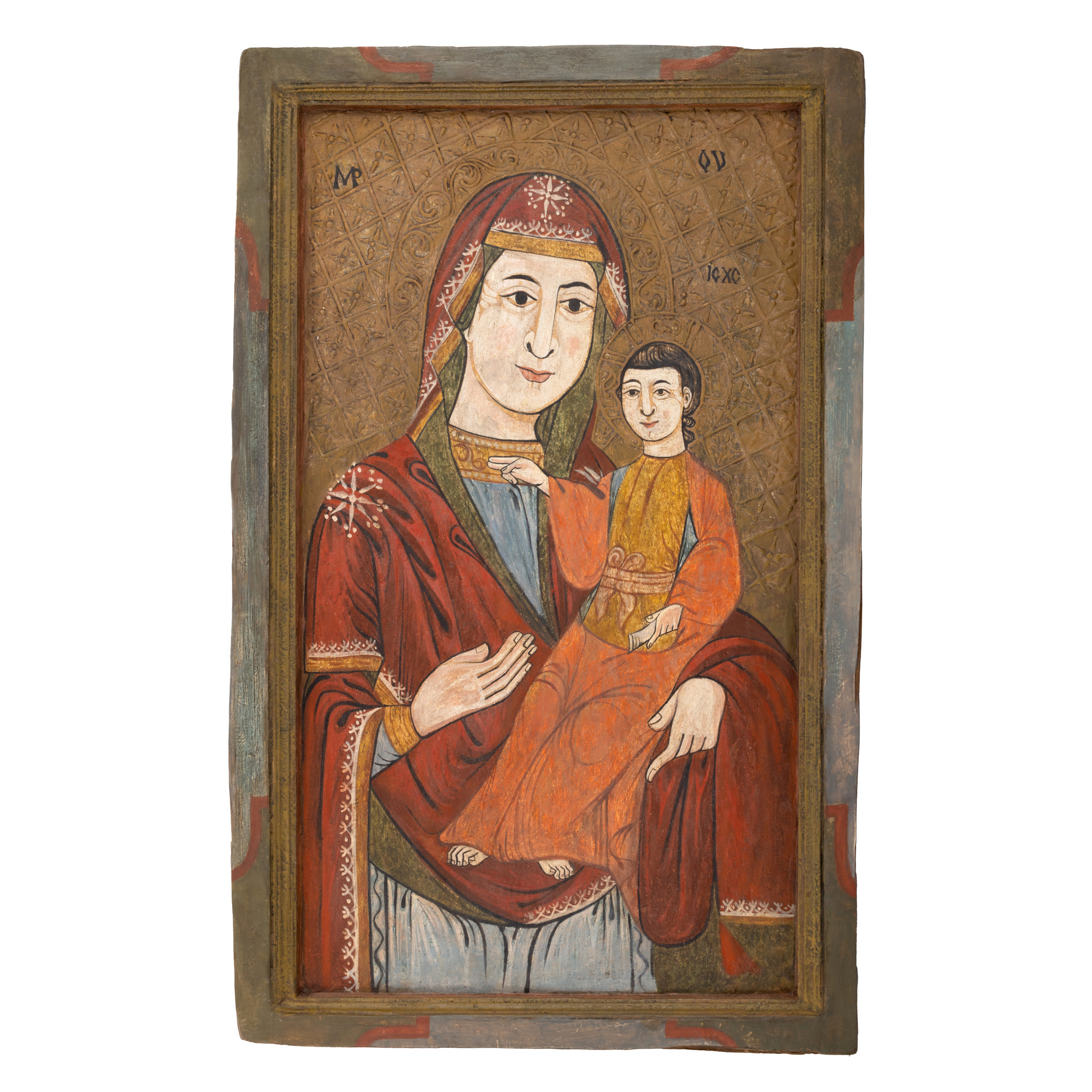 94. Icoană împărătească pe lemn, ”Maica Domnului cu Pruncul (Hodighitria)”, ramă pictată, atribuit Nechita Zugravul, jumătatea sec. XVIII, piesă rară, de colecție