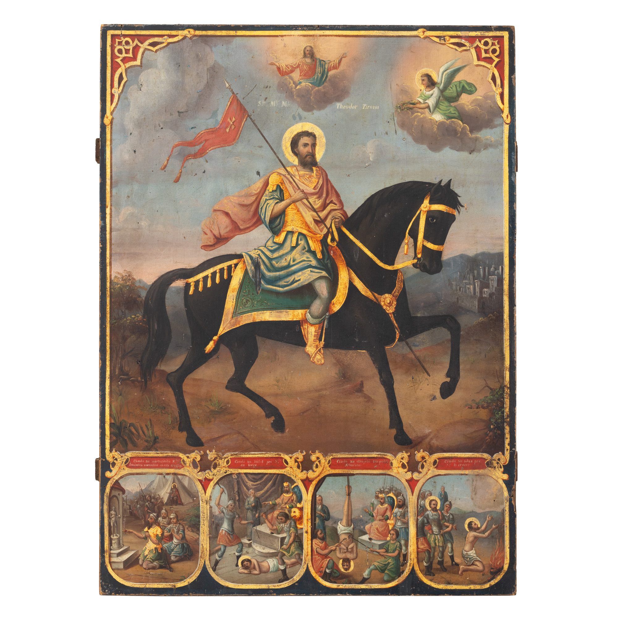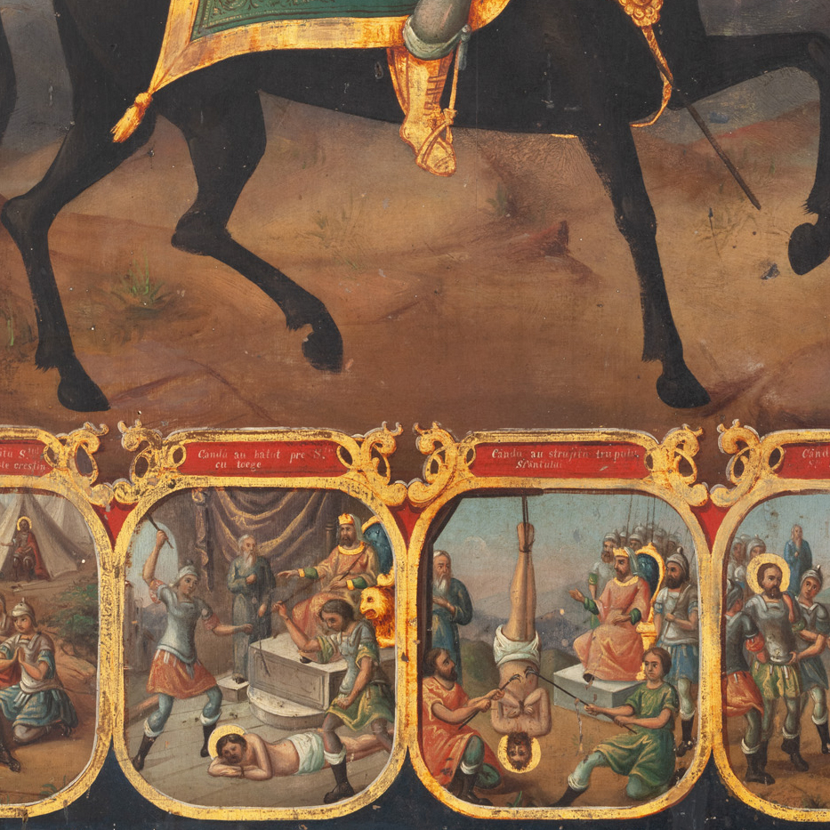 88. Icoană împărătească pe lemn, ”Sfântul Mare Mucenic Teodor Tiron și patru scene din viața și martiriul său”, școală românească, jumătatea sec. XIX, piesă rară, de colecție