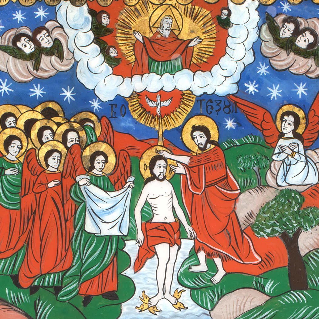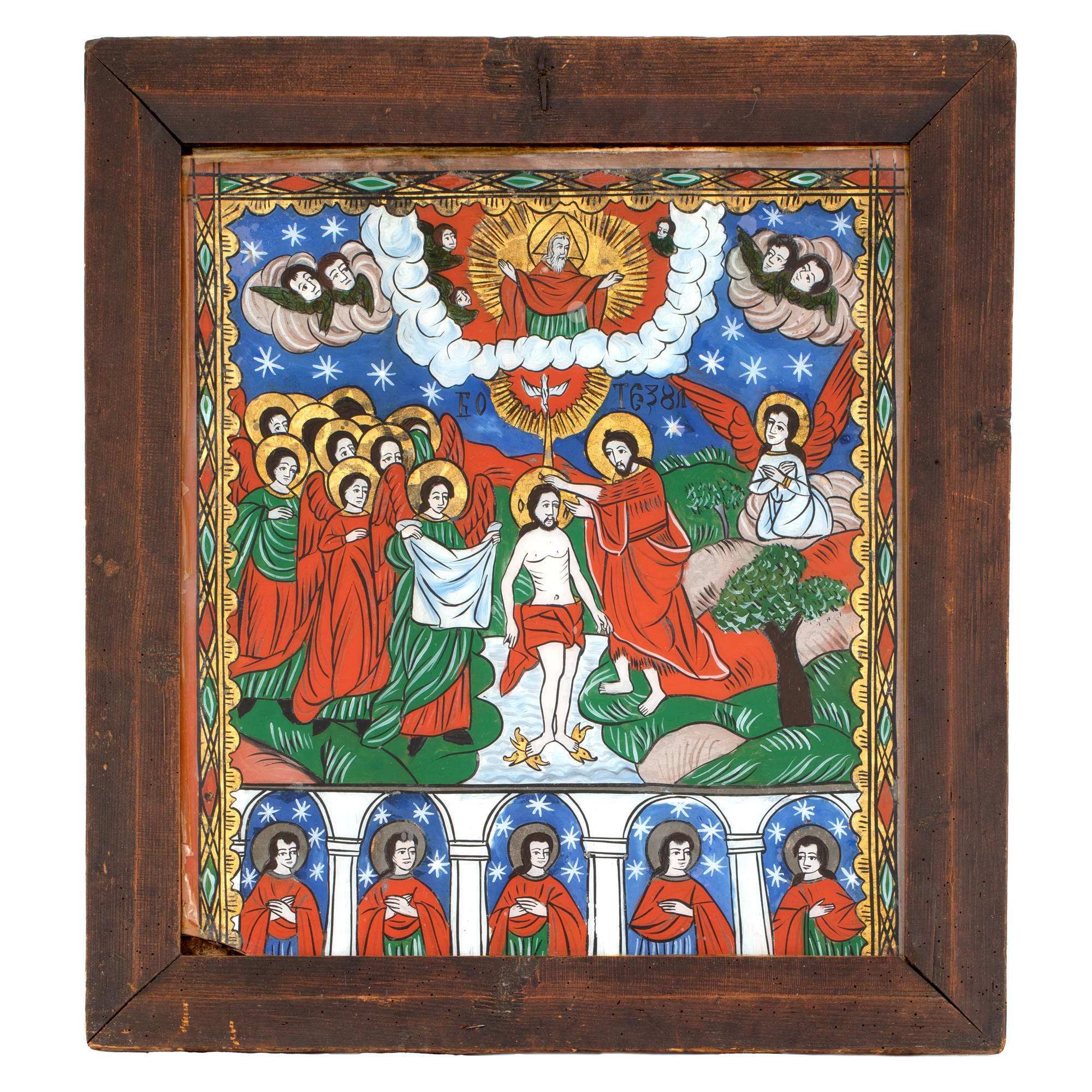 63. Icoană pe glajă, ”Botezul Domnului”, atelierul familiei Tămaș din Făgăraș, probabil Moise Tămaș, jumătatea sec. XIX, de colecție