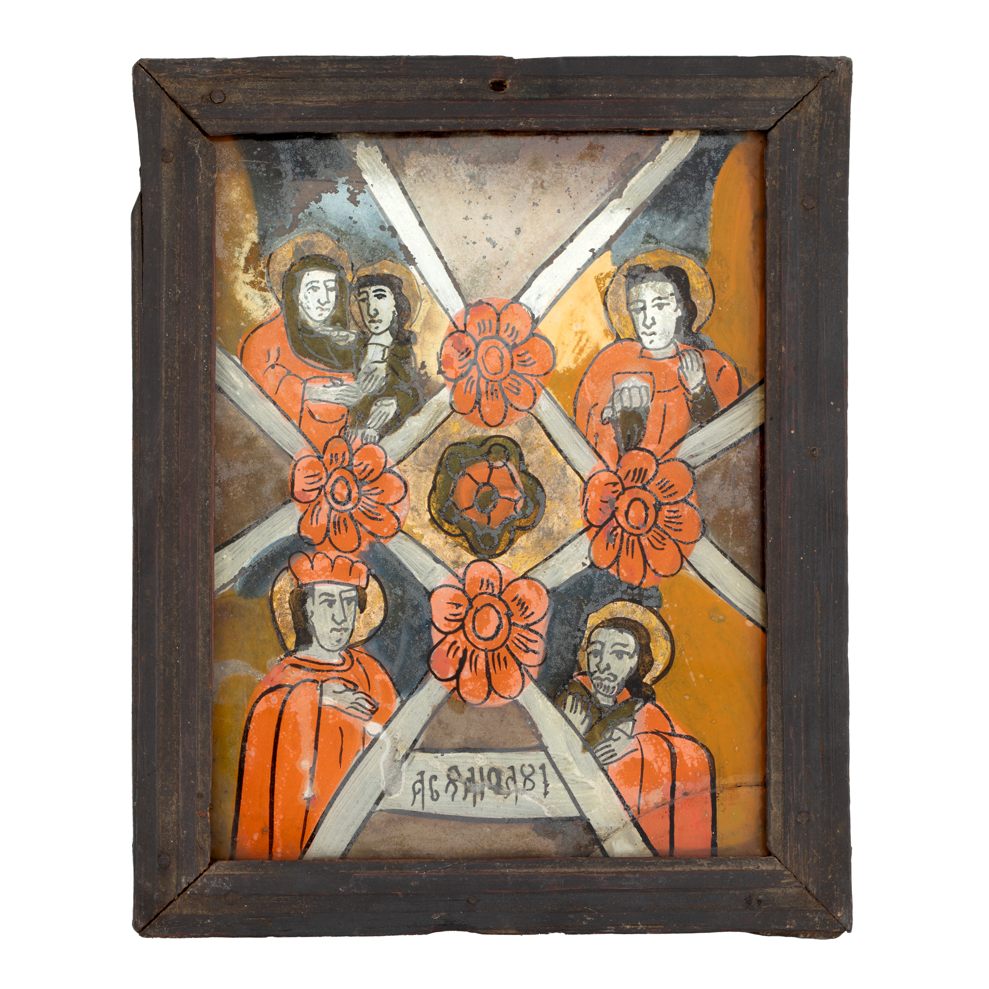 tempera și foiță de aur pe glajă, ramă băițuită, cu șorț