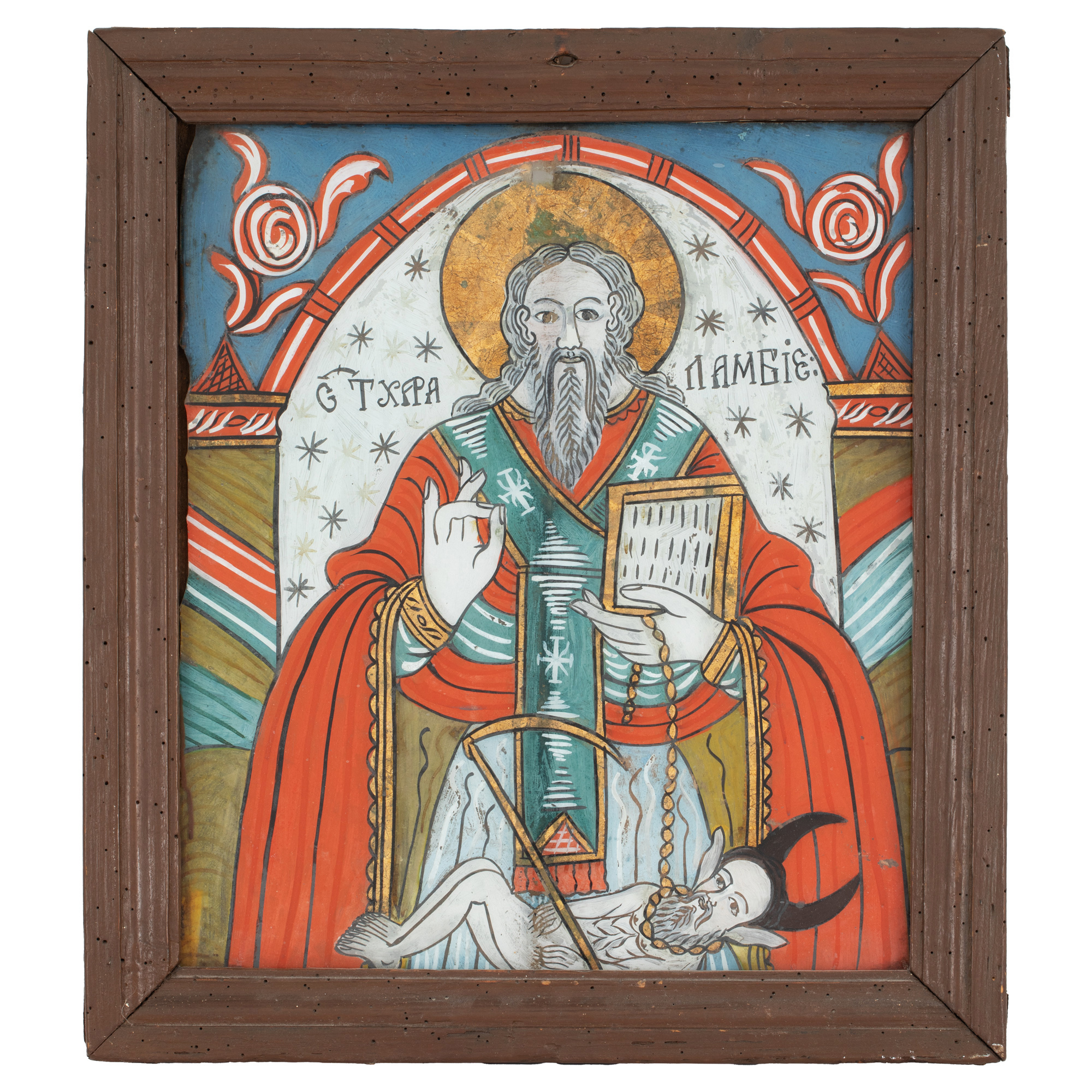 62. Icoană pe glajă, ”Sfântul Haralambie izbăvitorul de ciumă”, atelierul familiei Tămaș din Făgăraș, probabil Moise Tămaș, jumătatea sec. XIX