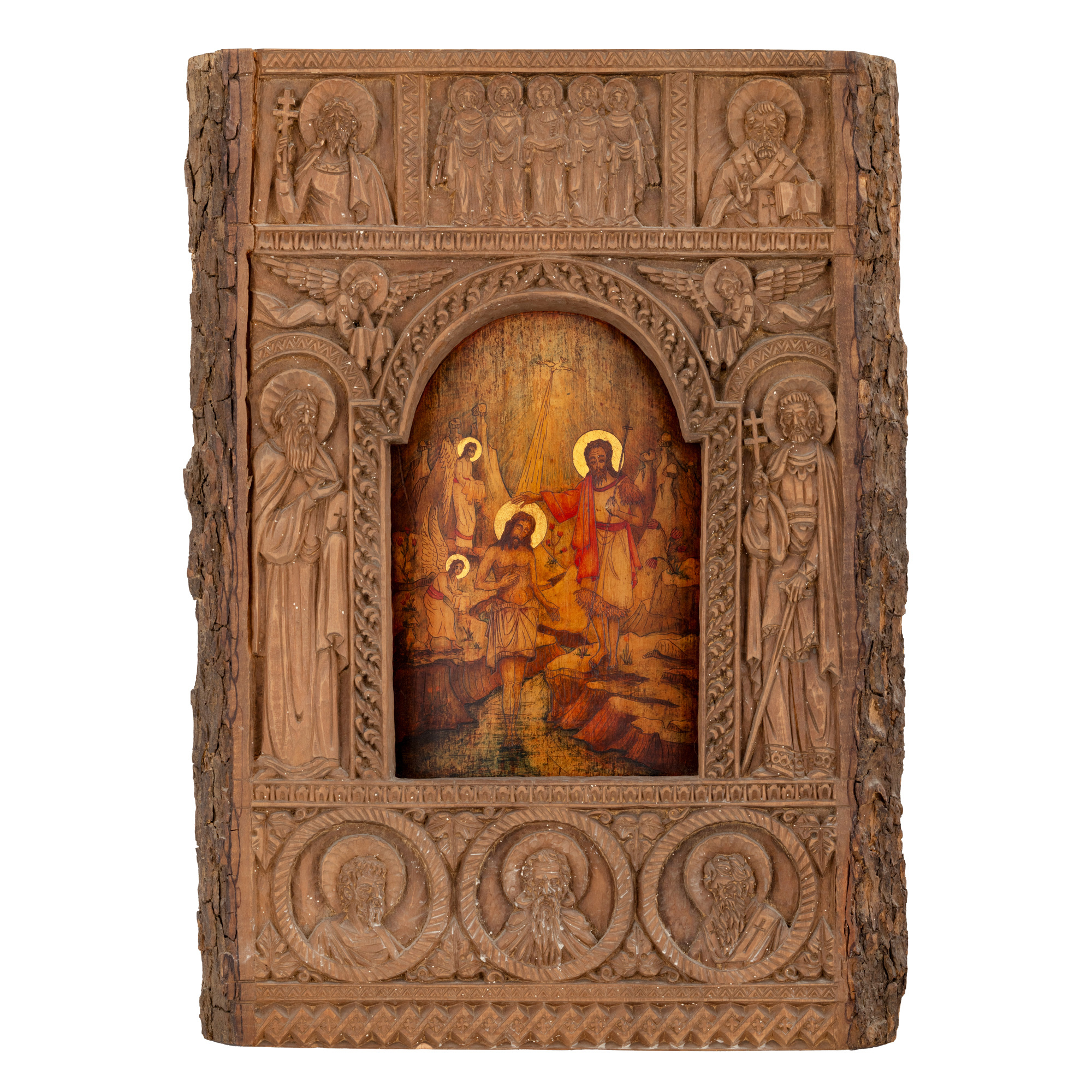 85. Icoană pe lemn, ”Botezul Domnului”, cu ramă sculptată, școală românească