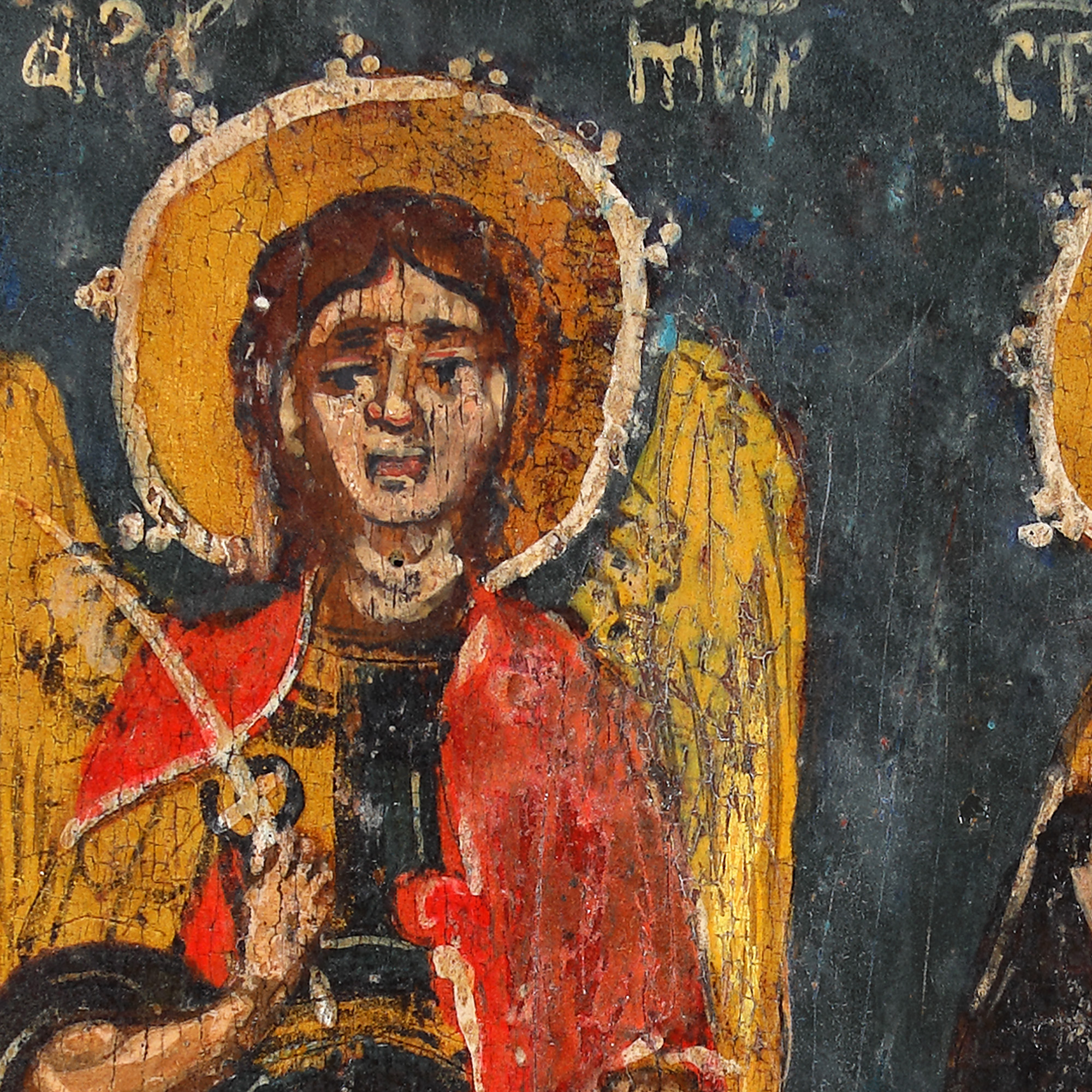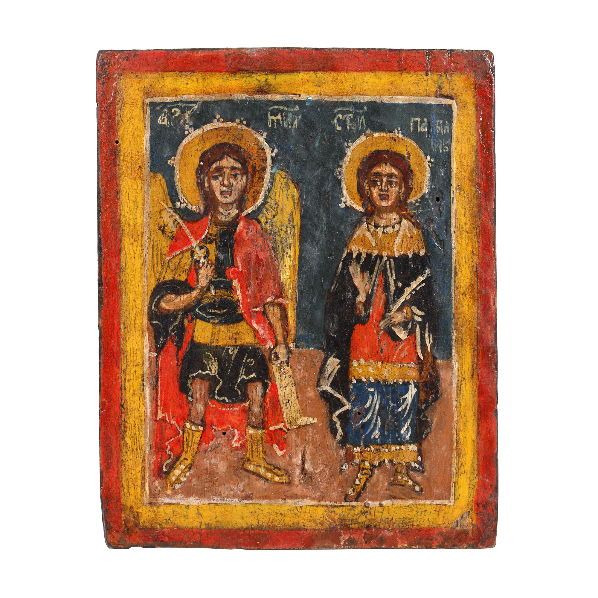 115. Icoană pe lemn, ”Sfântul Arhanghel Mihail și Sfântul Pa[ntelimon]”, școală post-brâncovenească, probabil atelier din Banat, sfârșitul sec. XVIII