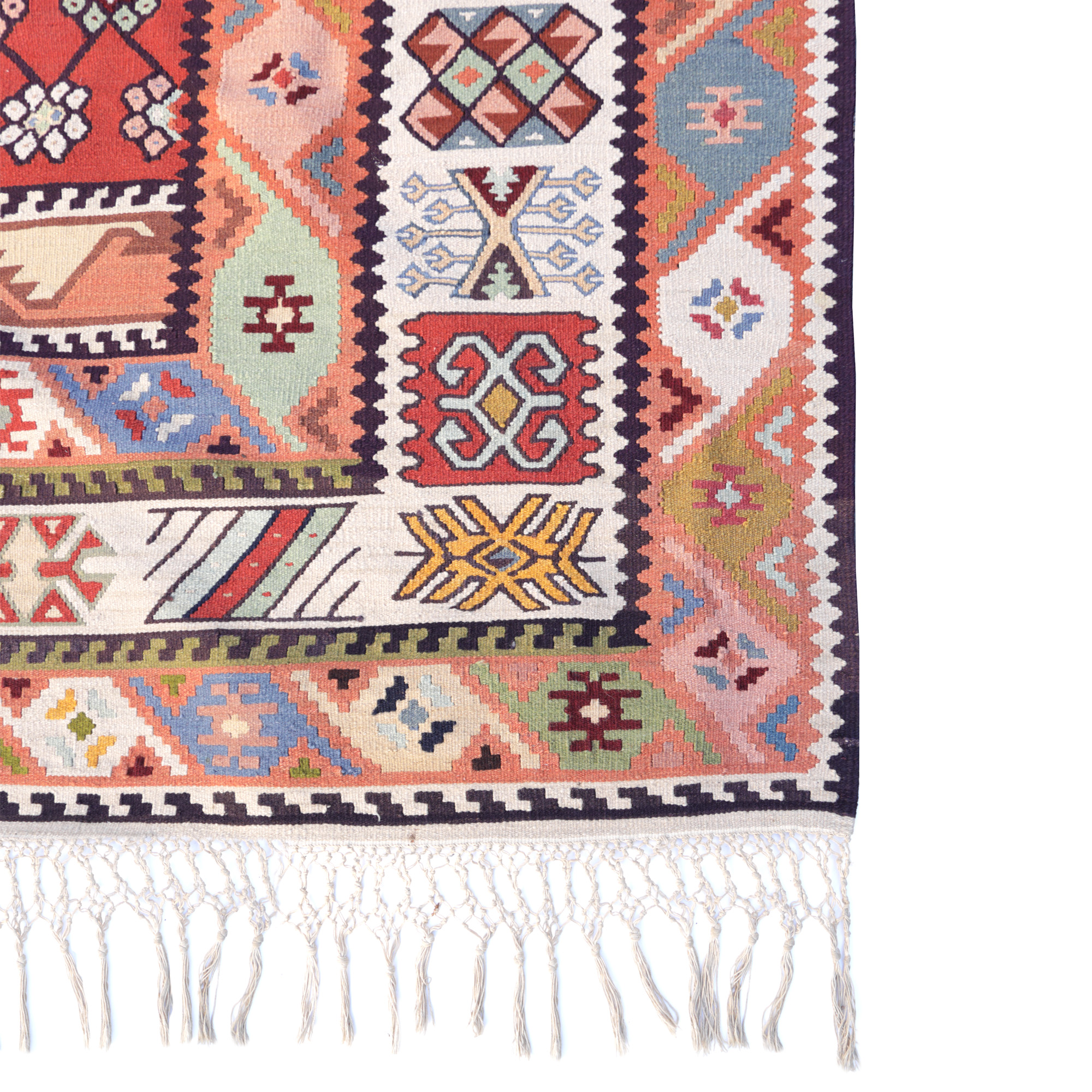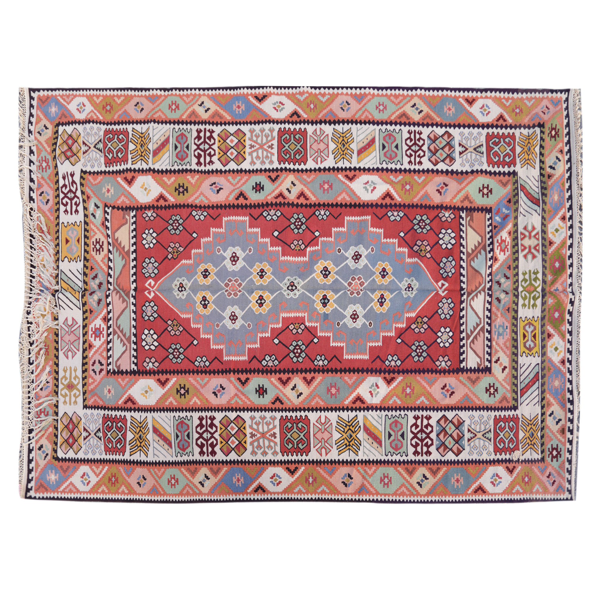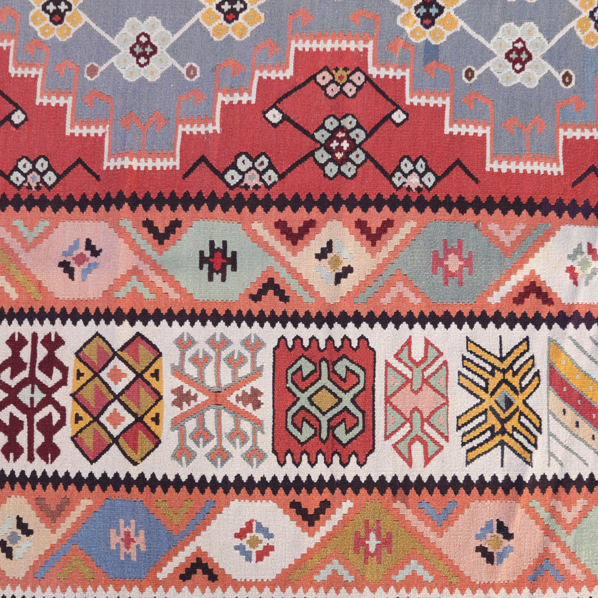 70. Covor Kilim turcesc, din lână, decorat cu motive geometrice încadrate în chenare, prima jumătate a sec. XX