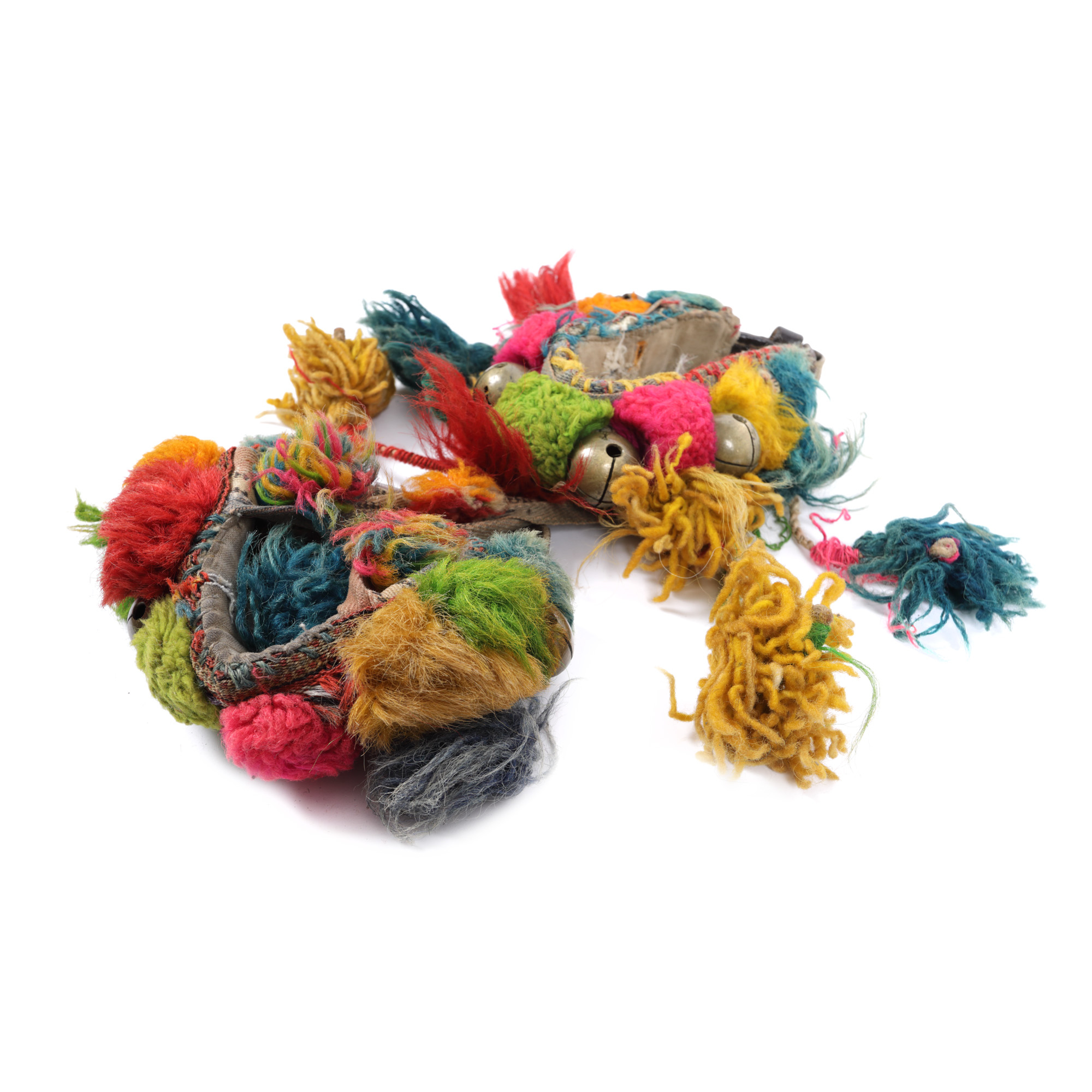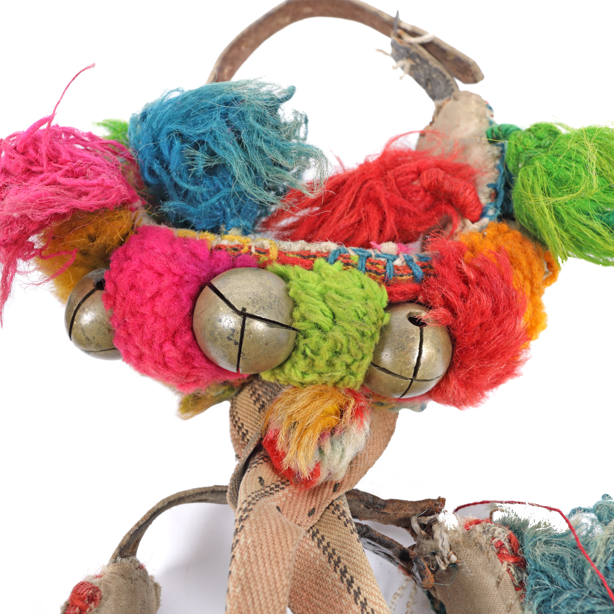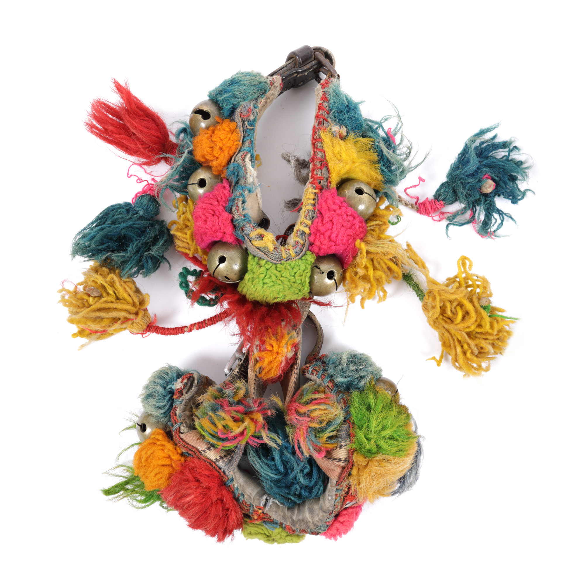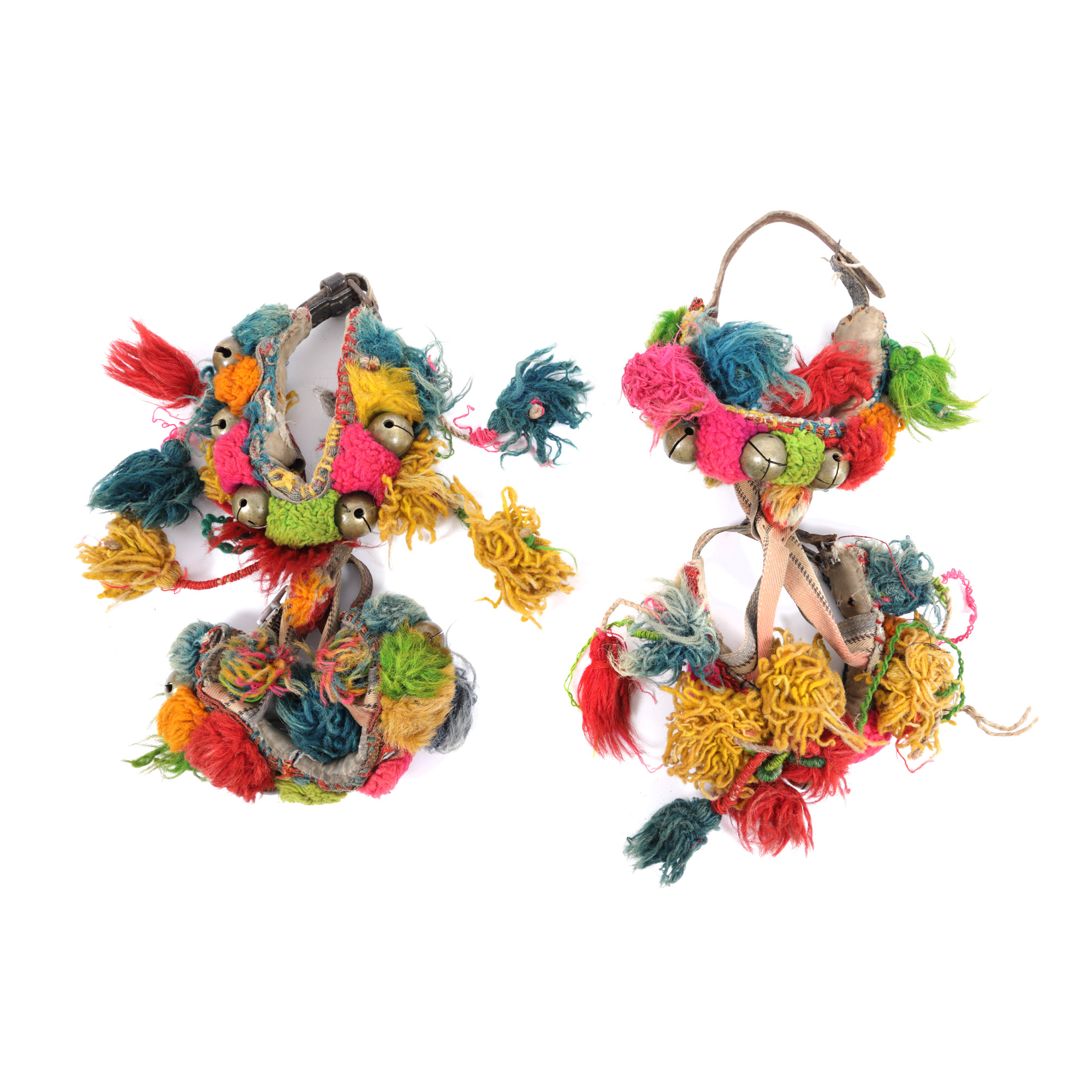 76. Pereche de clopoței de călușari, din alamă, decorați cu ciucuri colorați din lână, începutul sec. XX