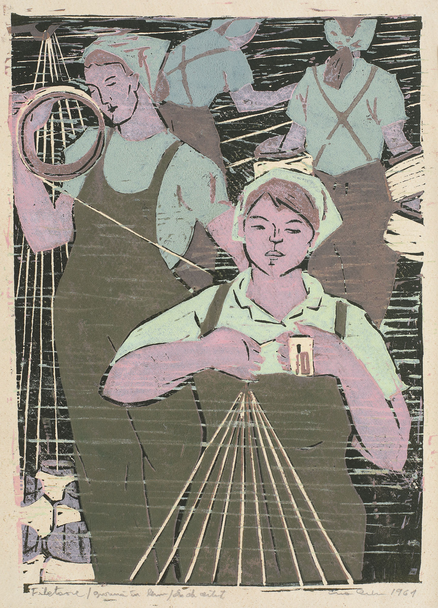 semnat și datat dreapta jos, în creion, "Eva Cerbu, 1961"; intitulat și notat stânga jos, în creion, "Filatoare, ex. de artist"