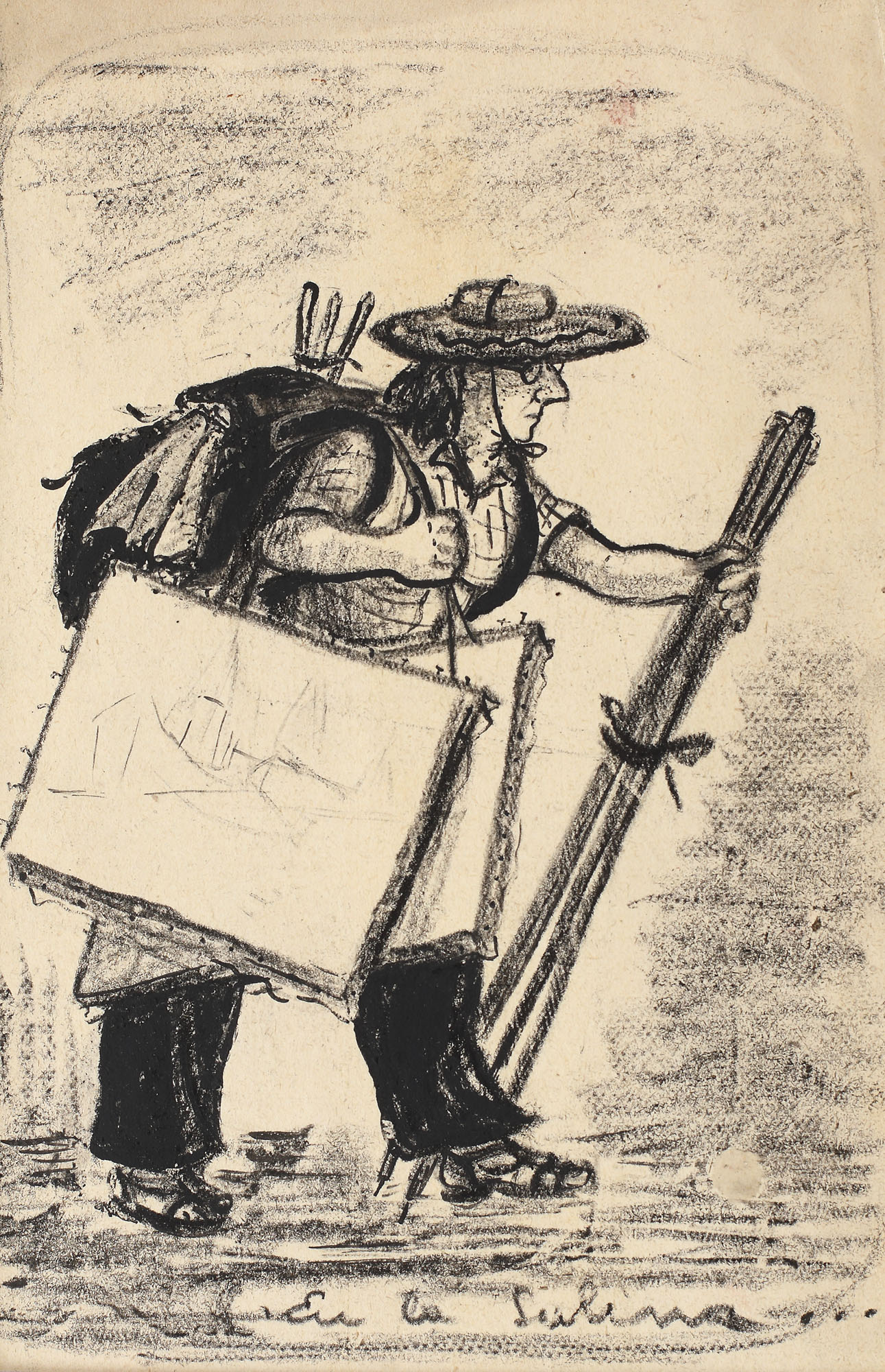 cărbune și tuș pe hârtie lipită pe carton