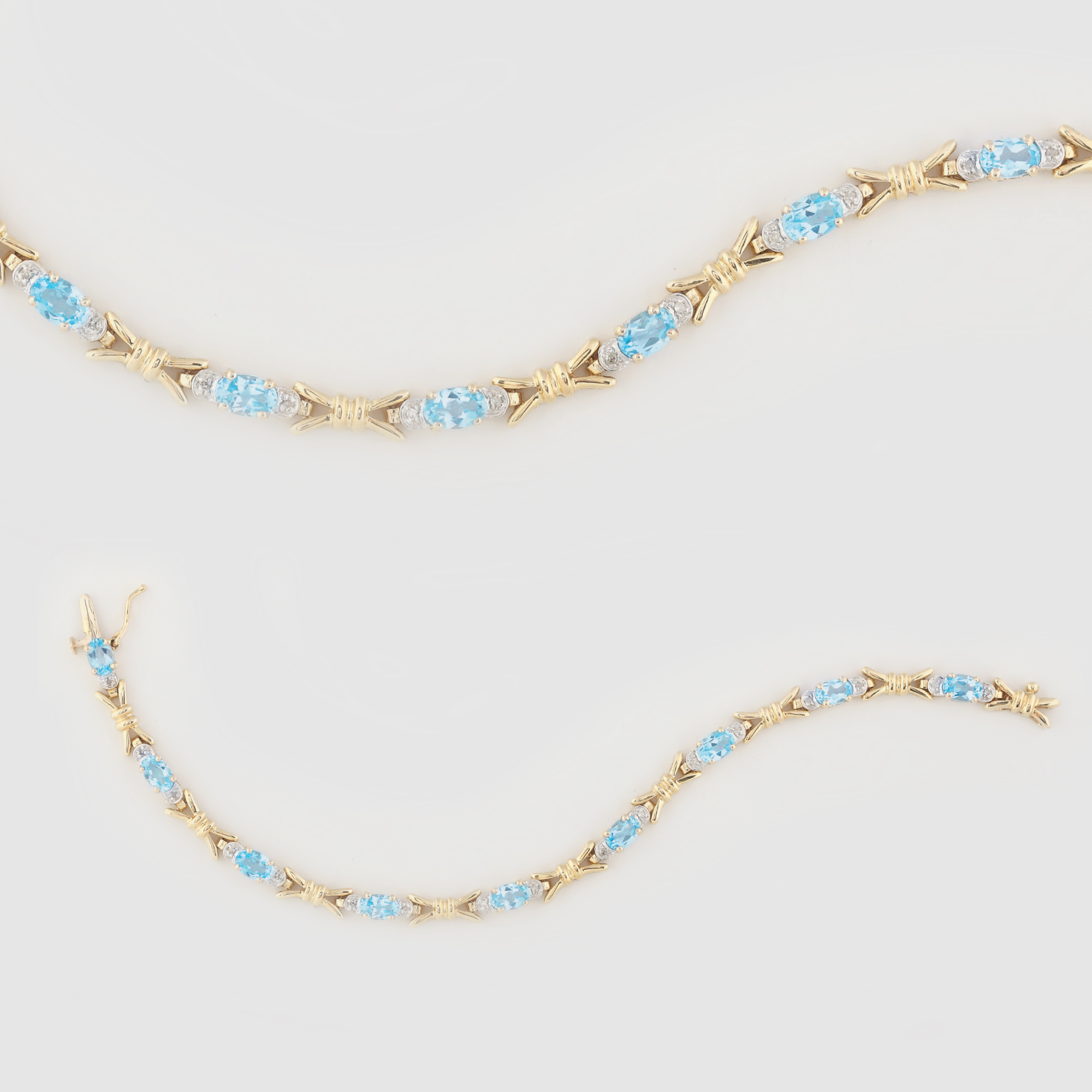 9 topaze oval fațetate cca. 6 ct., culoare bleu, claritate eye-clean, 17 diamante rotunde single cut cca. 0.12 ct., culoare K-L, claritate SI