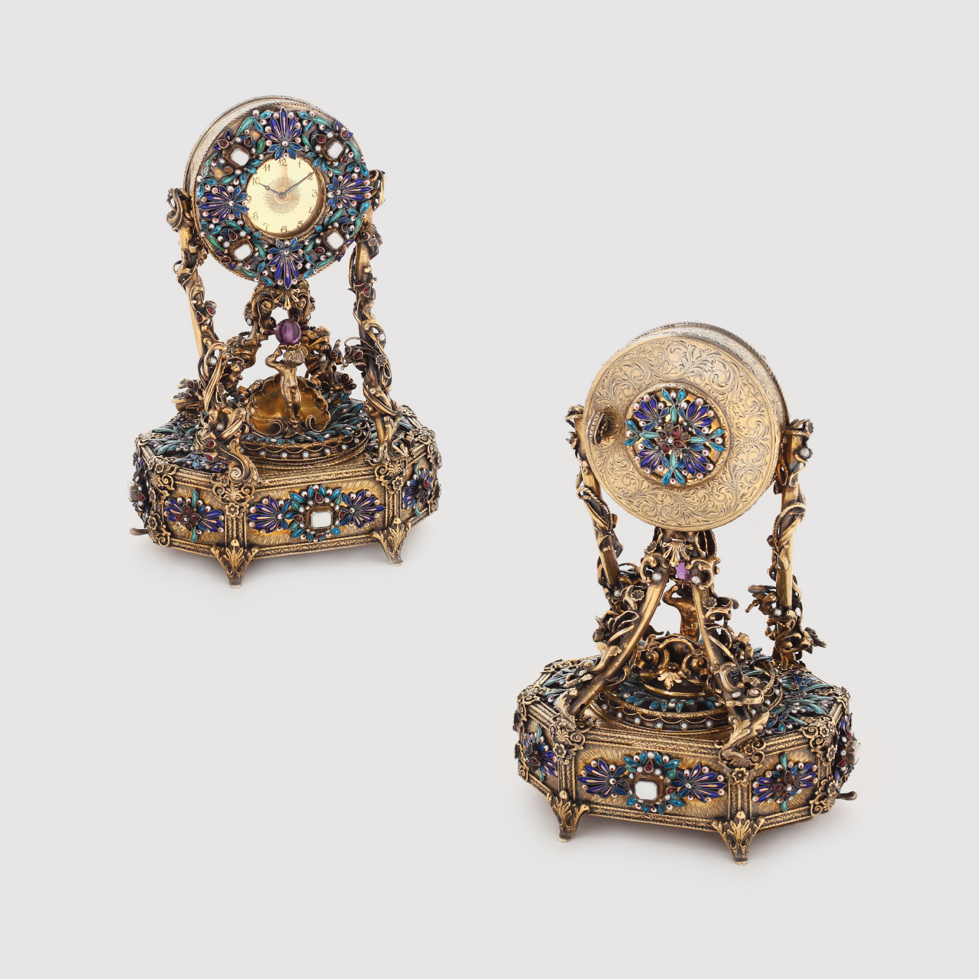 Ceas decorativ, cu mecanism cu întoarcere manuală, bogat decorat în maniera târzie de revitalizare a stilului rococo. Carcasa din argint aurit, emailată, prezintă o diversitate de ametiste, opale, granate și perle de cultură. La baza ceasului se află incorporat un mecanism muzical.