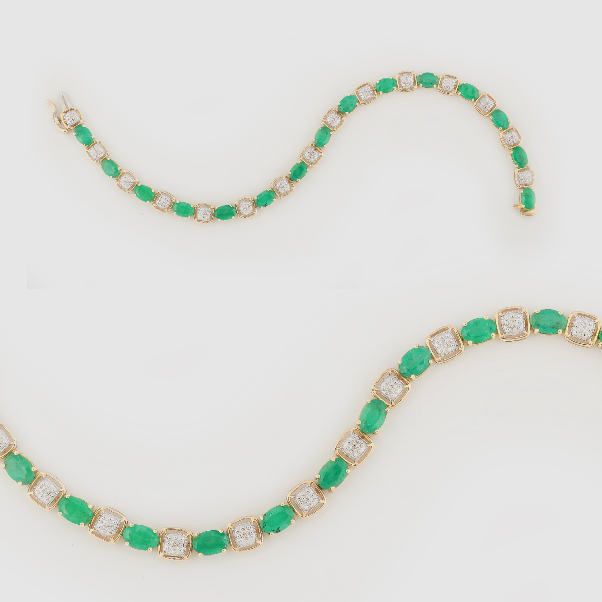 15 smaralde oval fațetate cca. 6 ct., culoare verde, claritate moderately included și 15 diamante rotunde single cut cca. 0.09 ct., culoare K-L, claritate SI