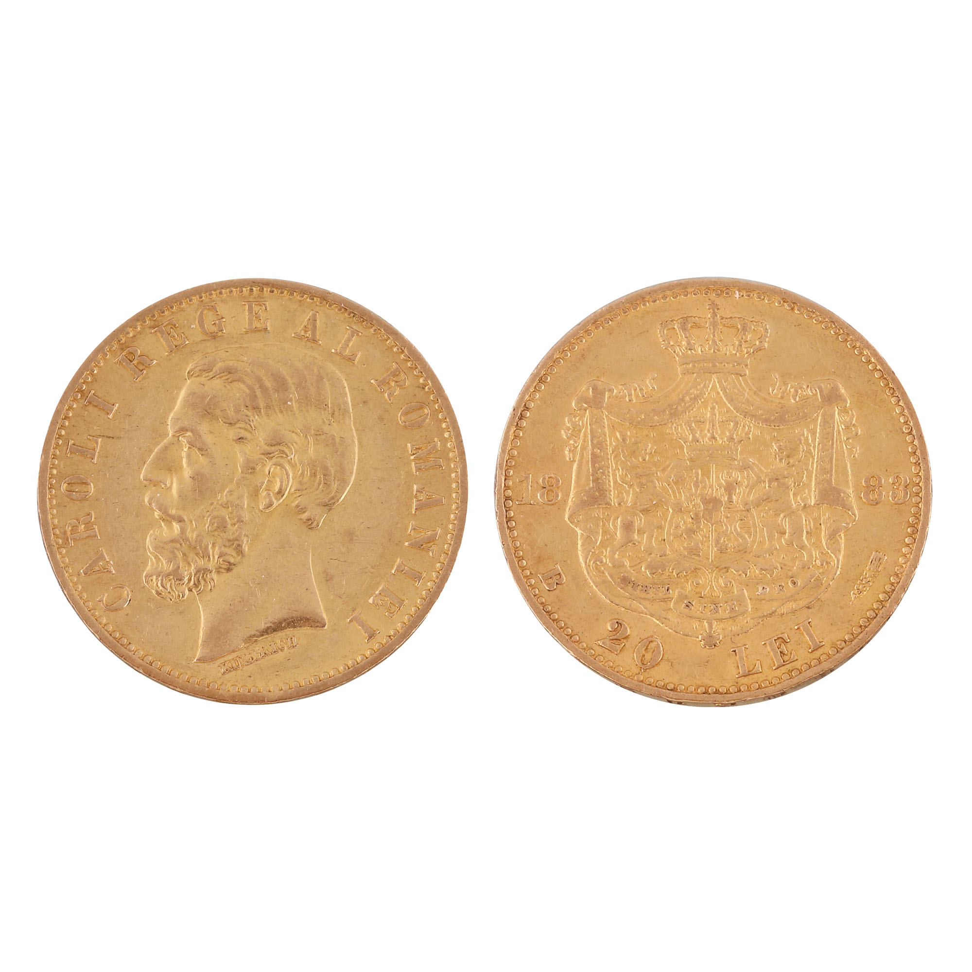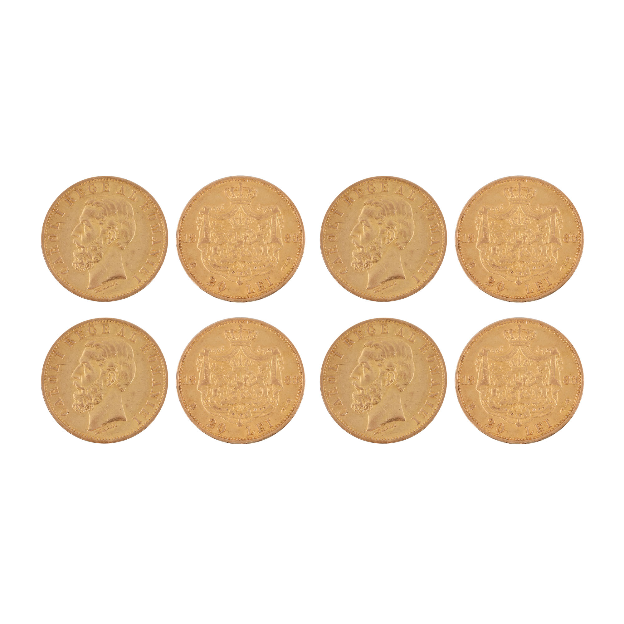 76. Lot format din patru monede ”Carol Regele României” din aur, 20 lei (polul de aur), gravor Wilhem Kullrich, 1883, respectiv 1890