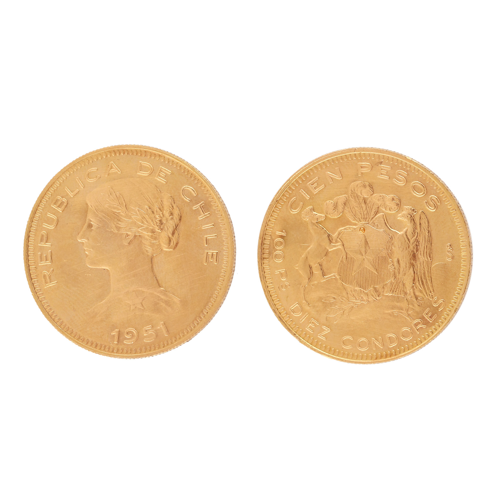 83. Monedă chiliană de aur, echivalând 100 pesos, 1951