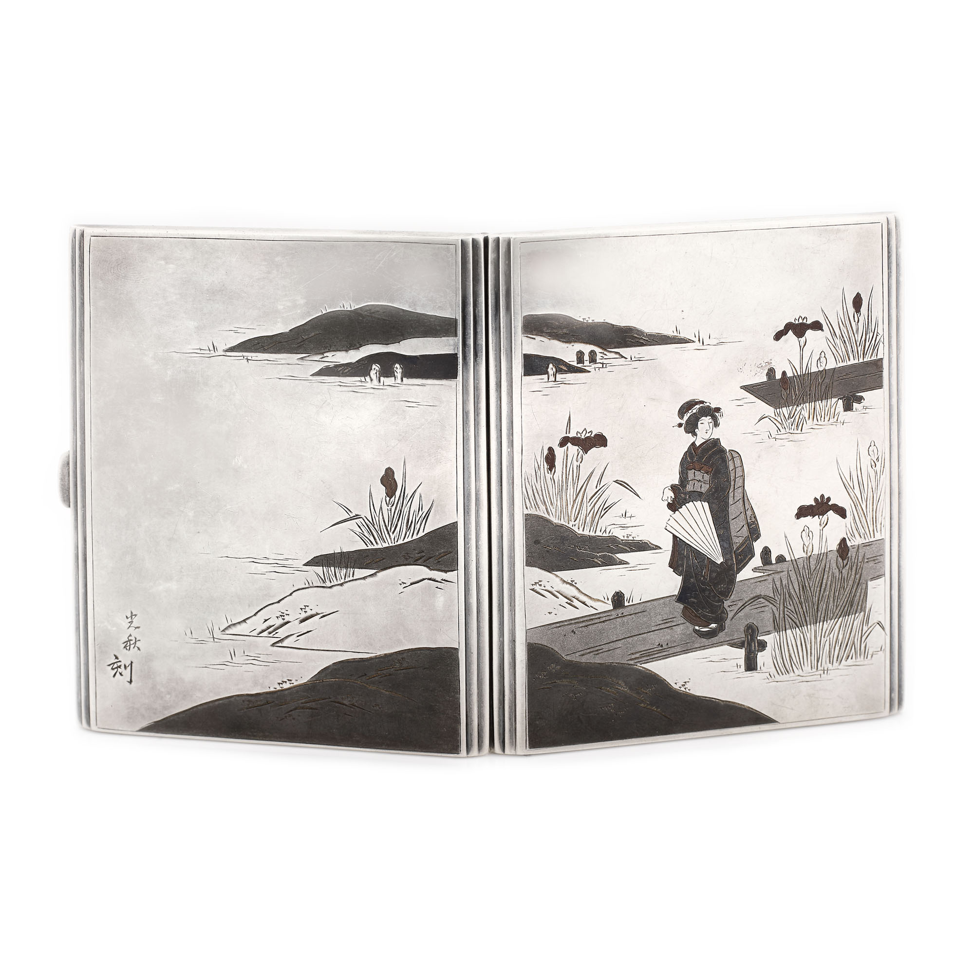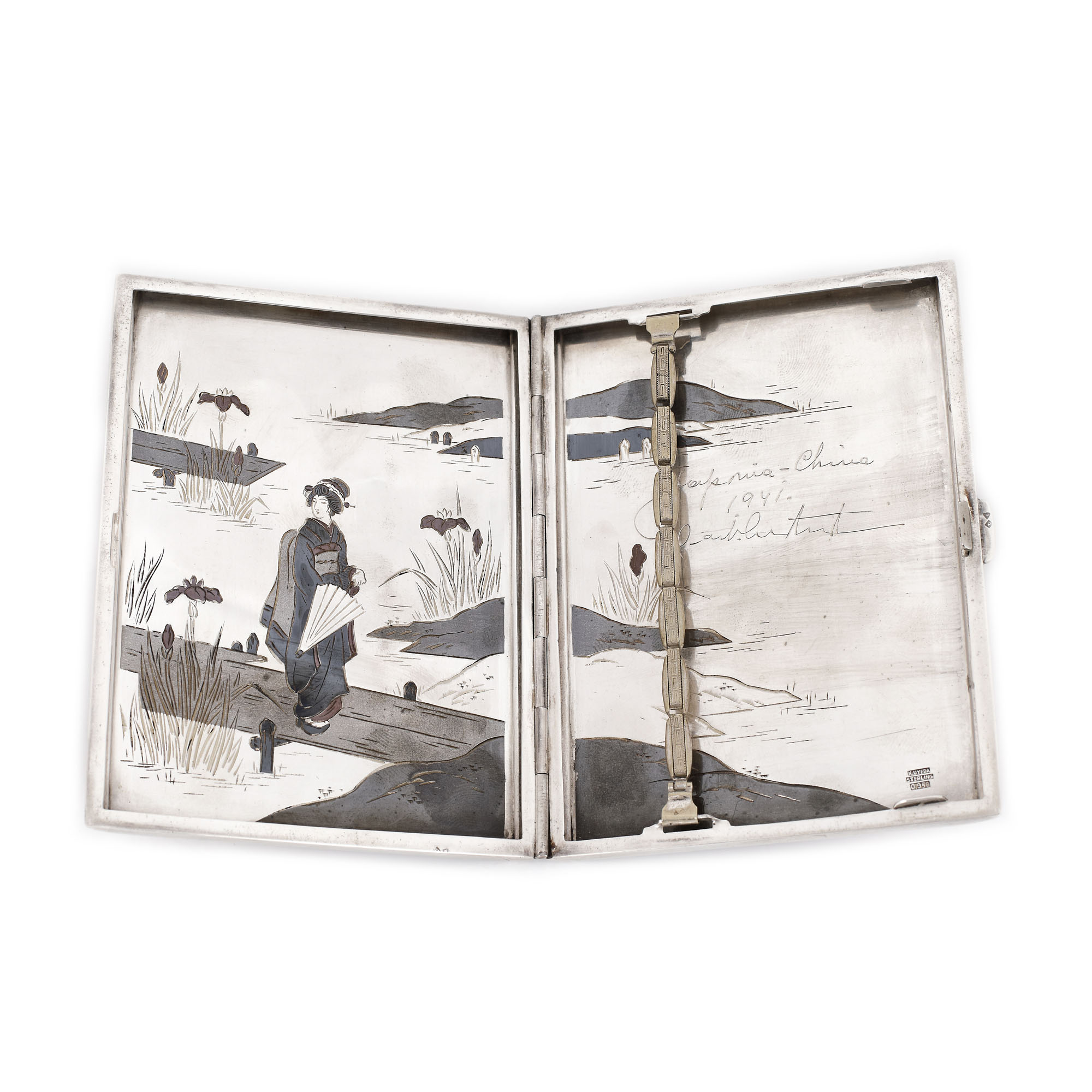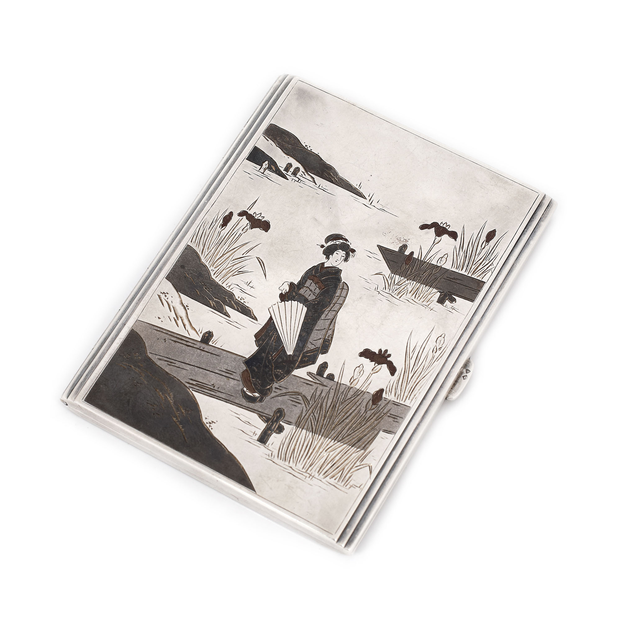 56. Tabacheră din argint, gravată cu scenă pitorească niponă, cca. 1941