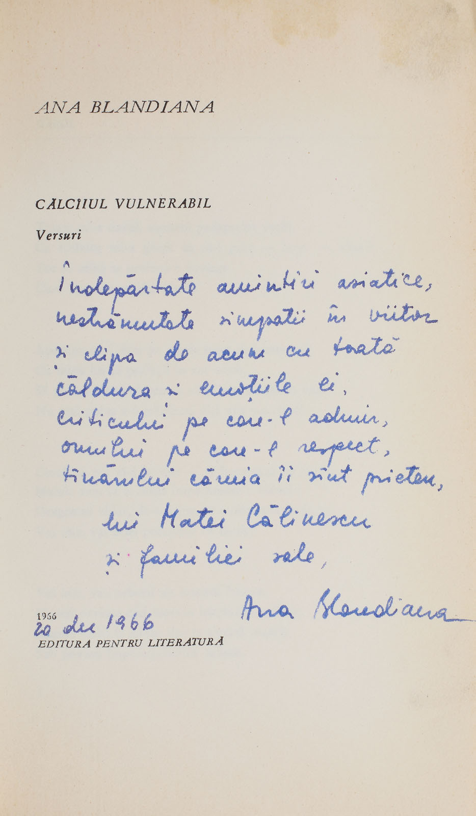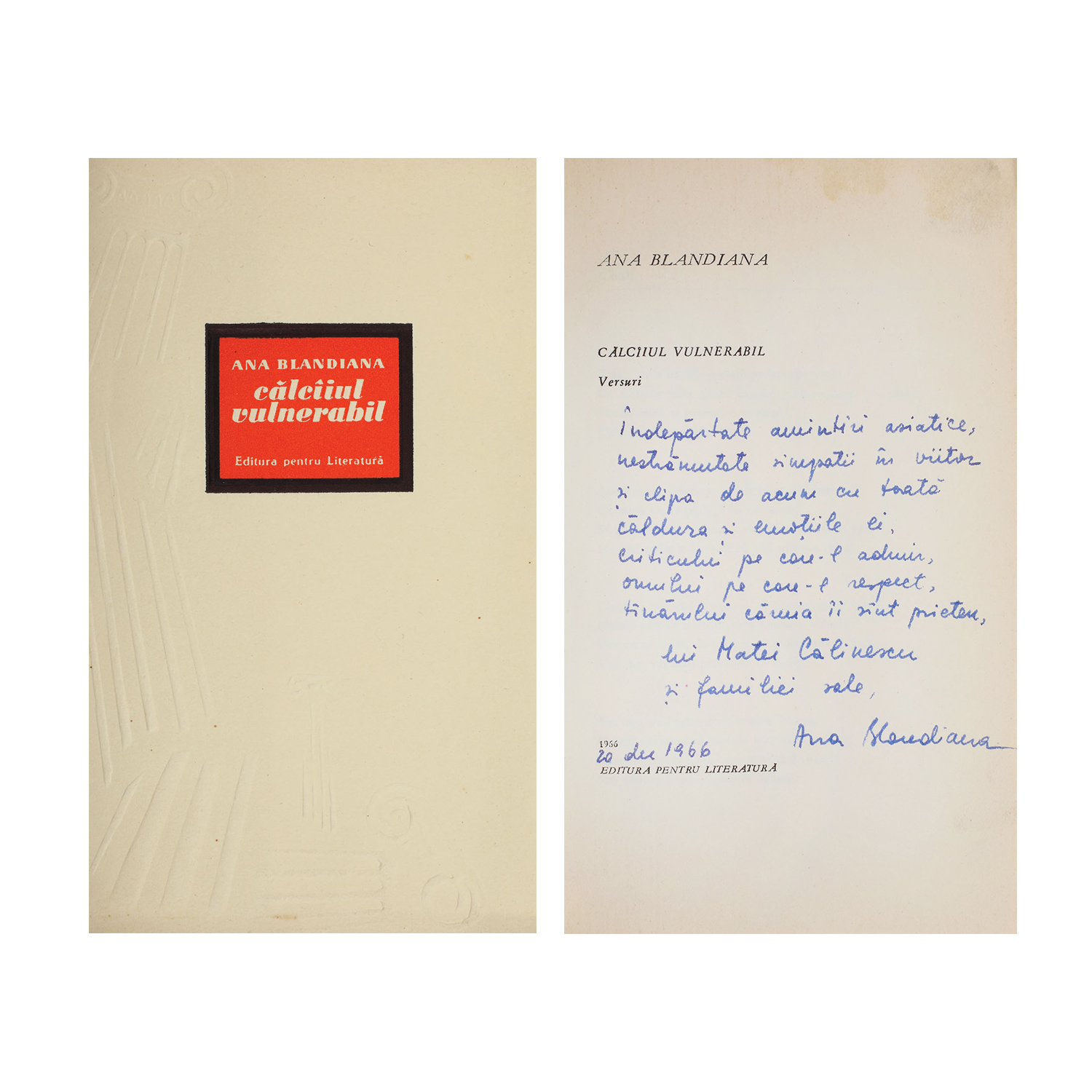 210. ”Călcâiul vulnerabil”, de Ana Blandiana, București, 1966, cu dedicația autoarei către criticul literar Matei Călinescu