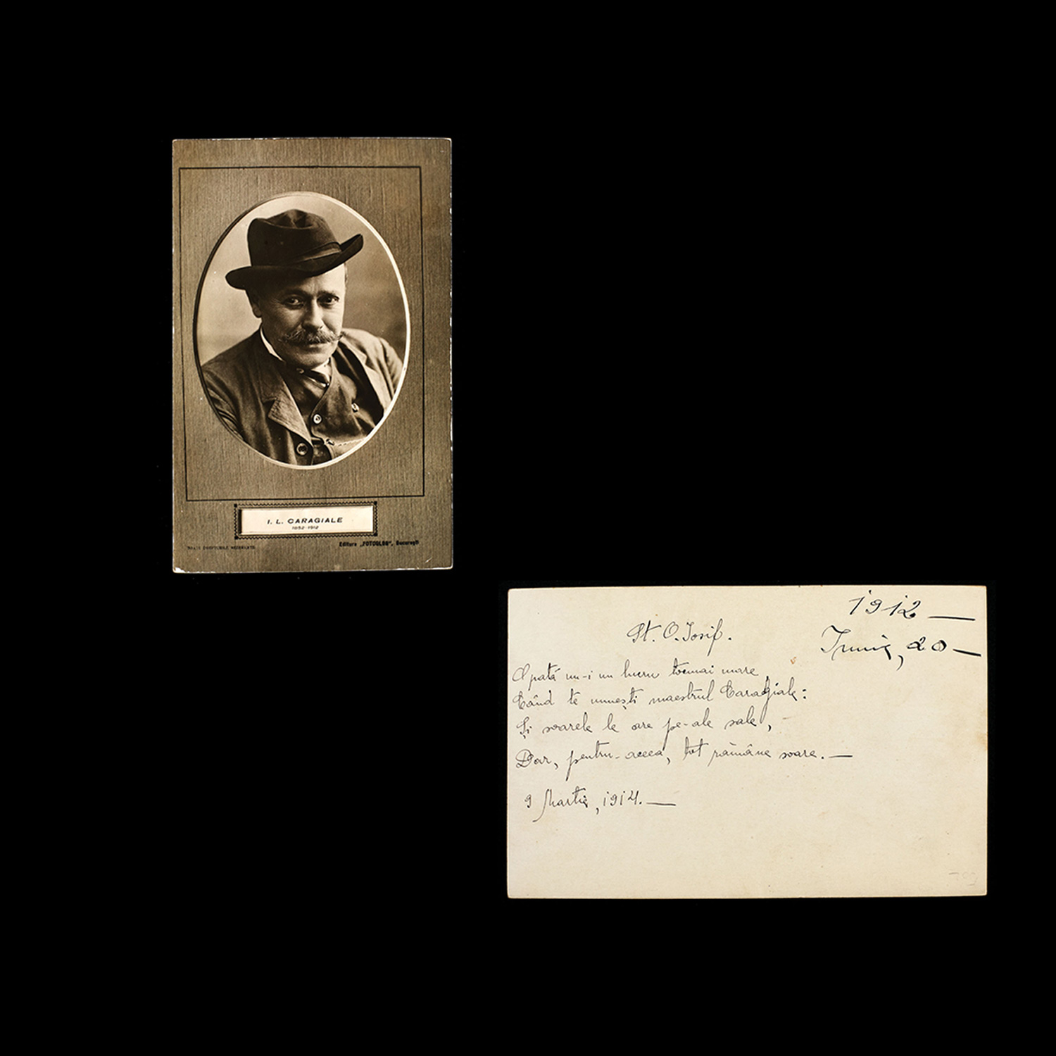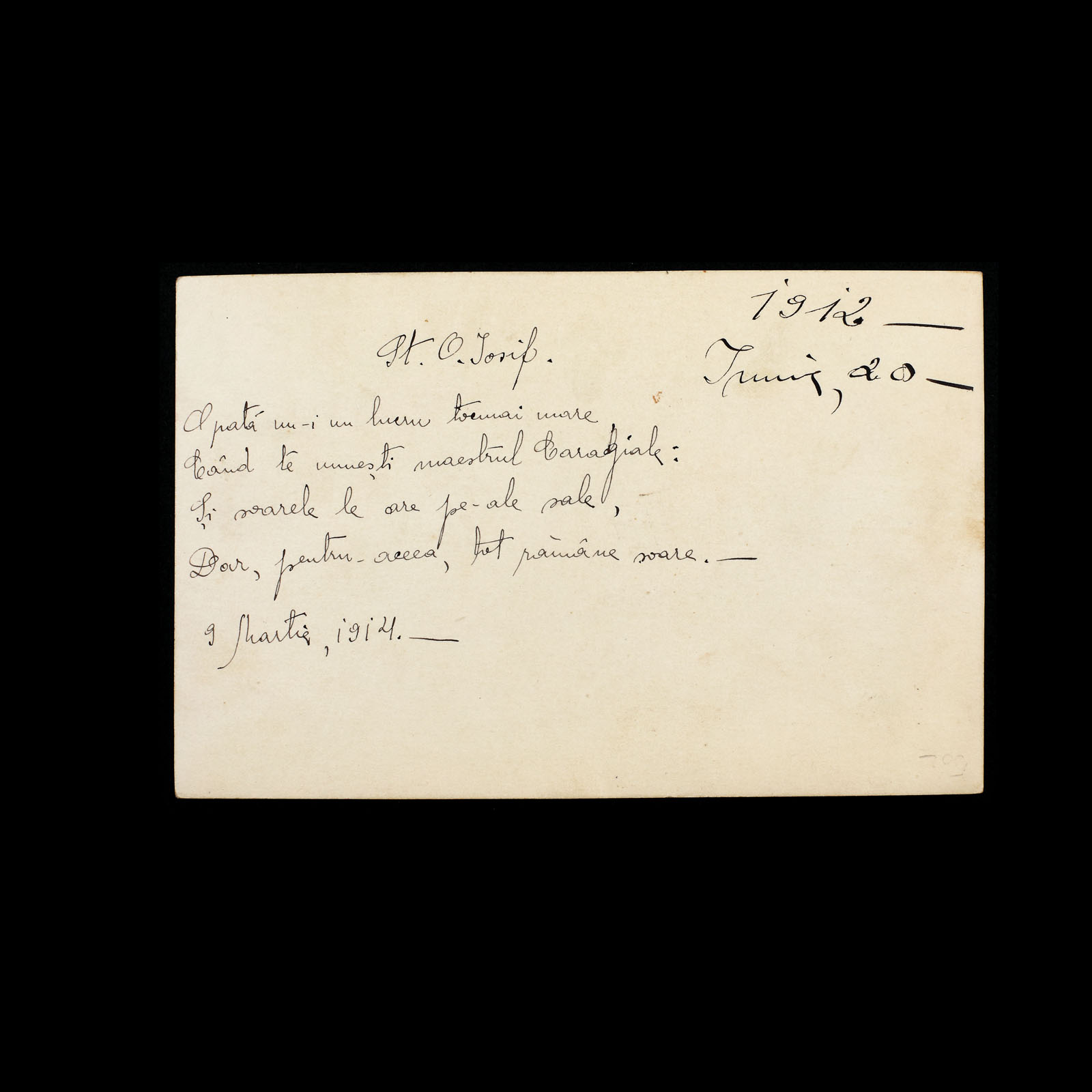 223. Carte poştală ilustrându-l pe Ion Luca Caragiale, 9 martie 1921, cu un catren de Ştefan Octavian Iosif
